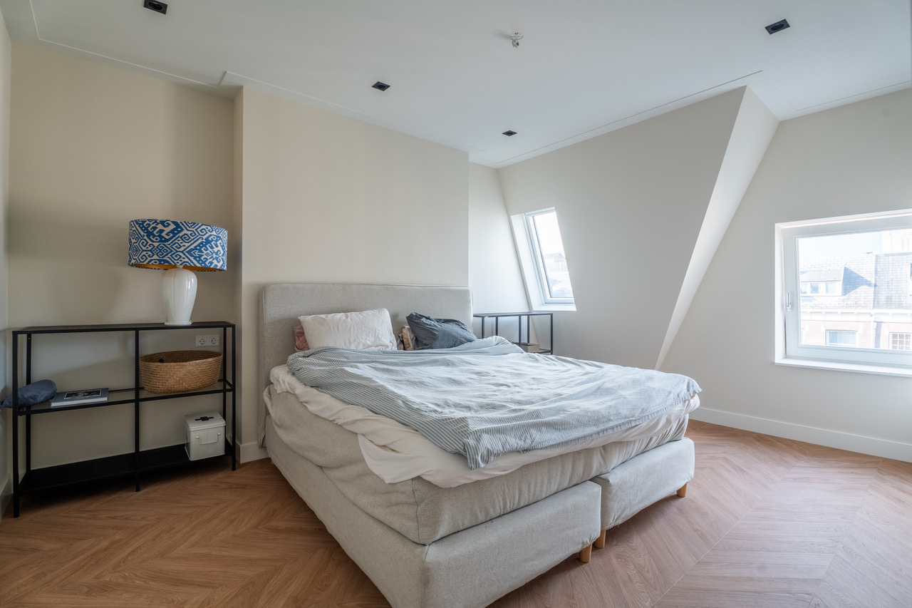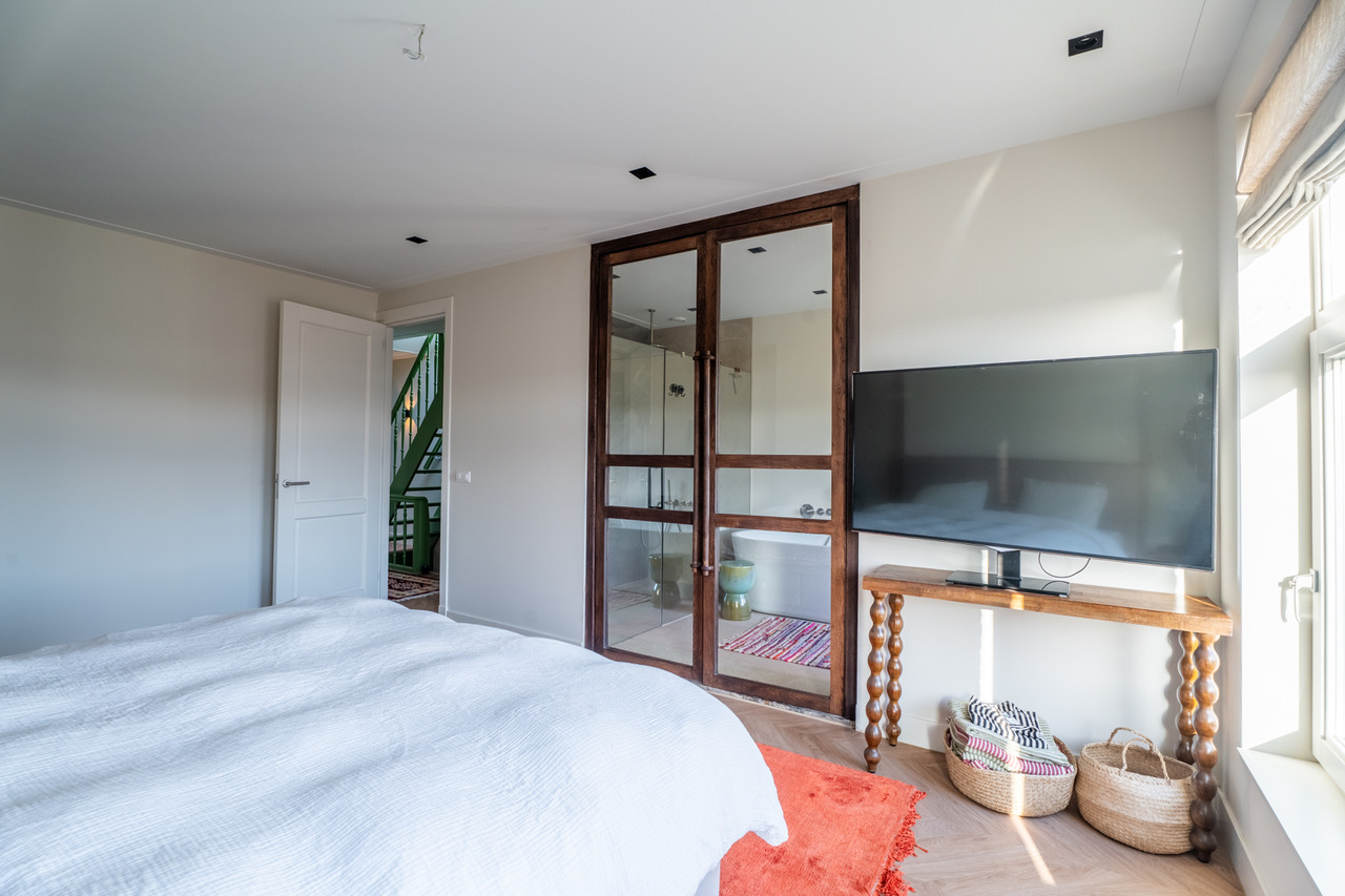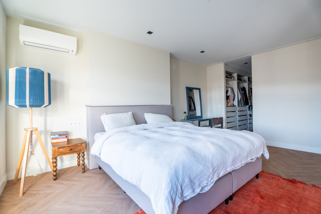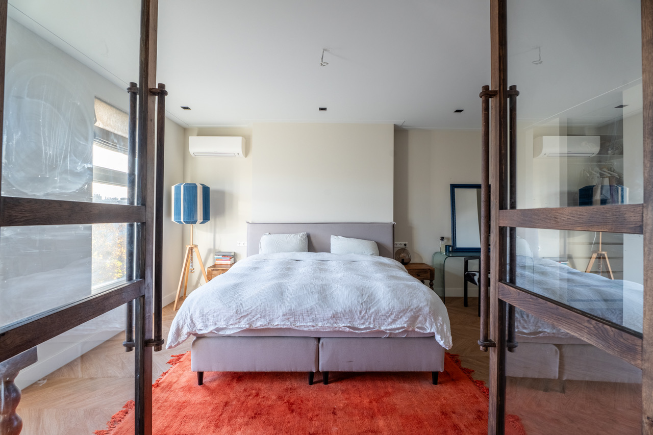 De master bedroom heeft grote ramen, een rood tapijt dat warmte geeft, en boogvormige details in de muren. Die bogen komen vaker terug in het appartement en geven een zachte, organische touch aan de moderne inrichting.