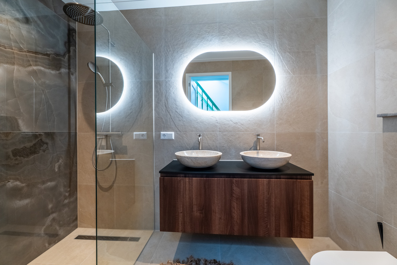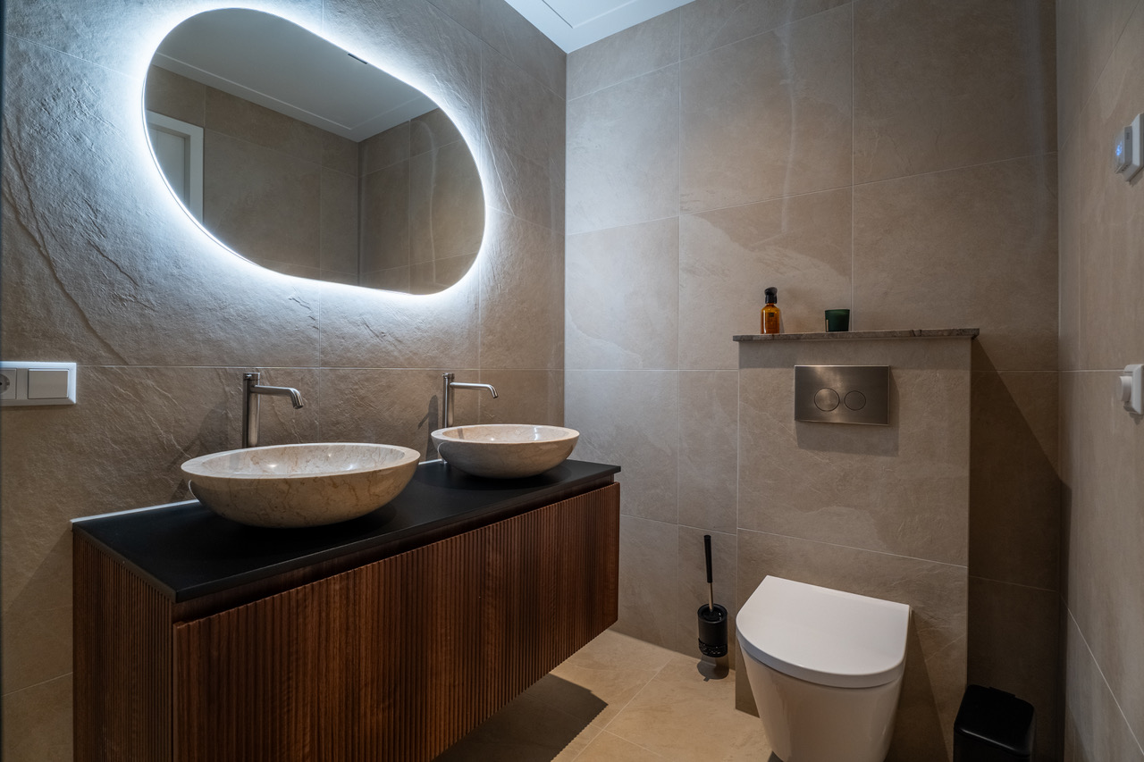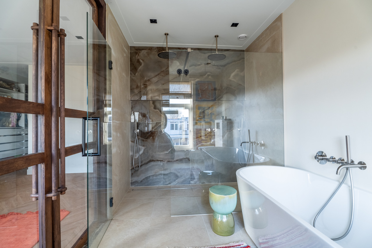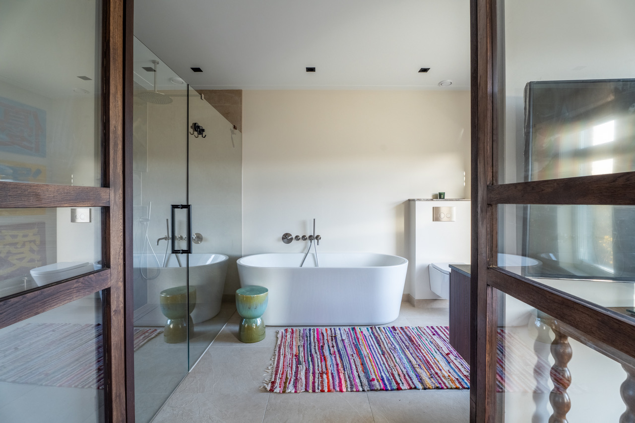 De badkamer heeft een vrijstaand bad, een ruime inloopdouche en een houten wastafel met een organische spiegel met LED-verlichting. De kleurige vloer en strakke afwerking maken het geschikt voor beauty of lifestyle content.
