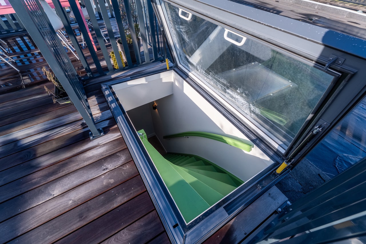 Dit appartement met kleurrijk interieur van 180m² aan de Admiraal de Ruyterweg in Amsterdam heeft een open indeling en een kleurrijke signatuur. Turquoise banken, een roze statement lamp, okergele stoelen en een groene trap geven elke ruimte direct karakter. Van de fotogenieke houten keuken tot de strakke badkamers en het balkon met uitzicht, deze locatie biedt veelzijdige settings voor allerlei soorten shoots.
