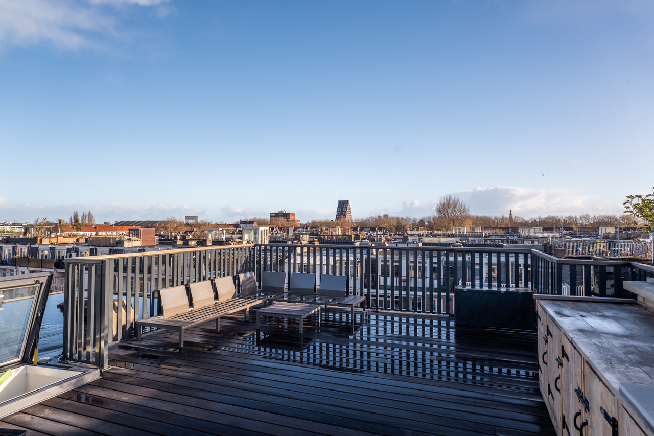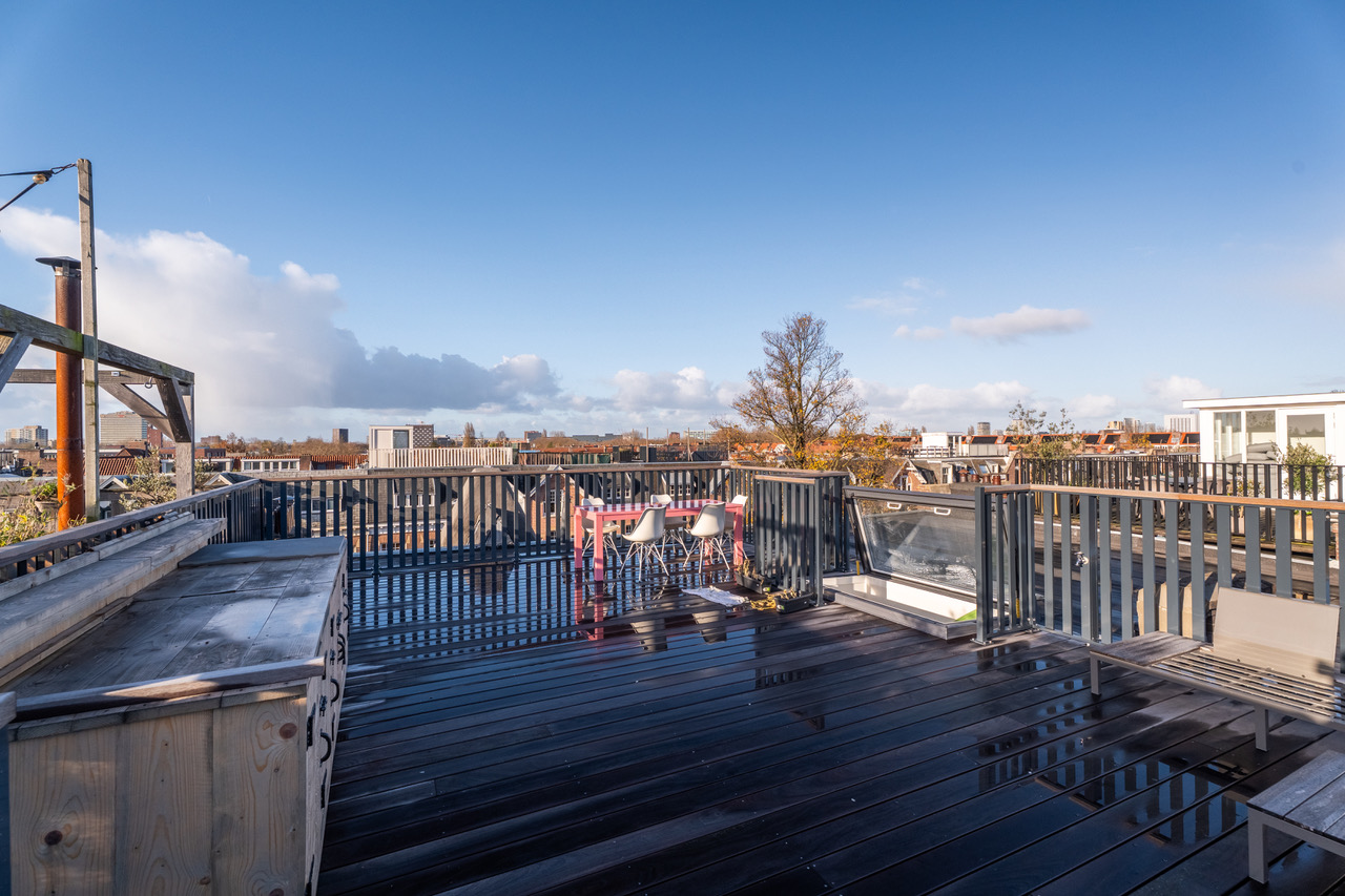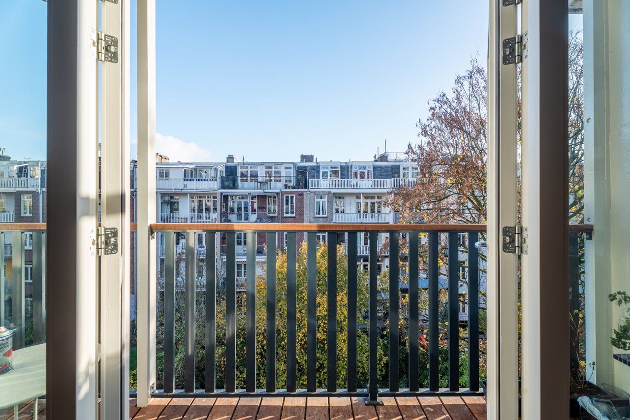 Het balkon kijkt uit over de straat en heeft genoeg ruimte voor buitenopnames. Je ziet de daken van Amsterdam en hebt daglicht zonder dat de zon te hard naar binnen schijnt, handig voor shoots die zacht licht vragen.