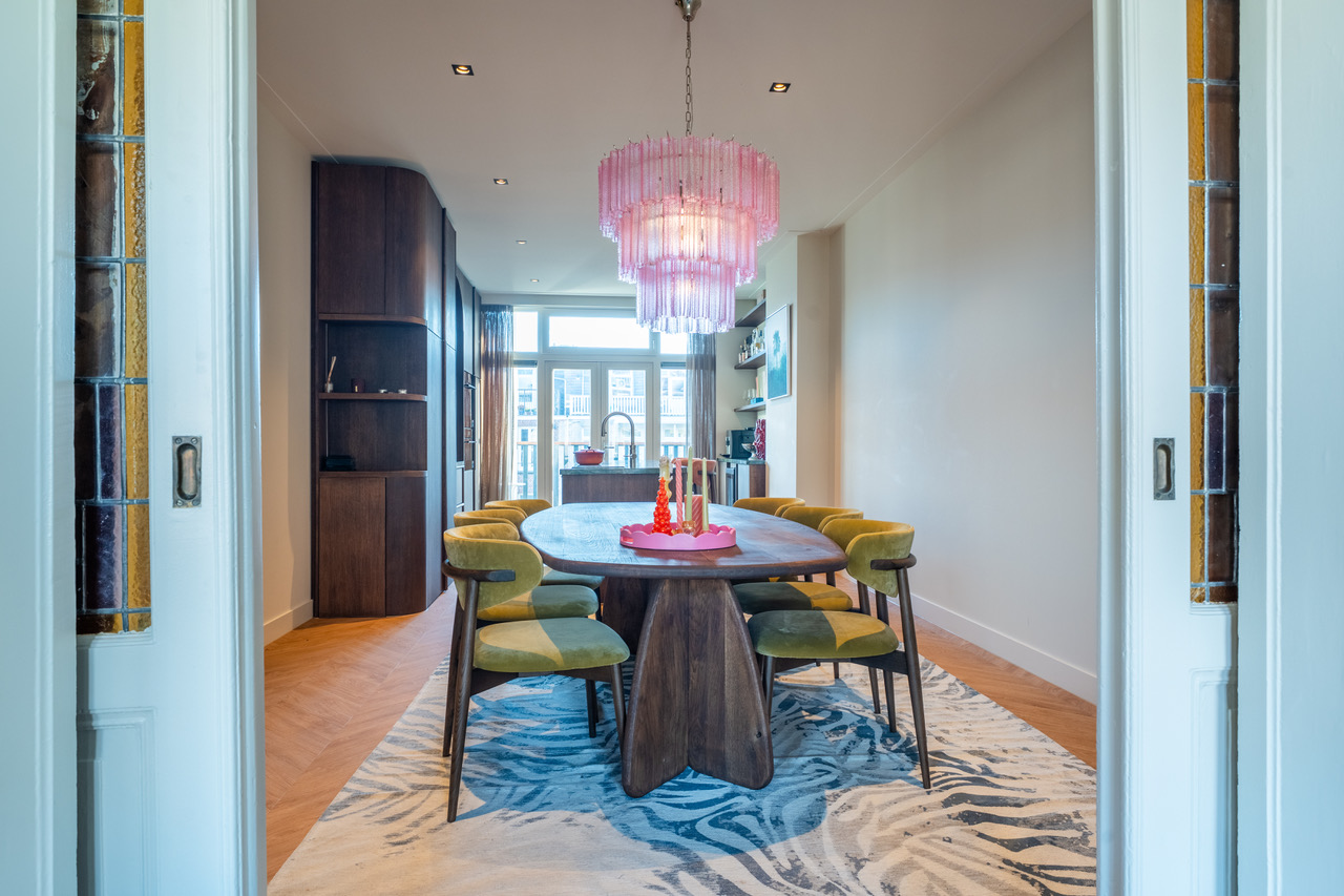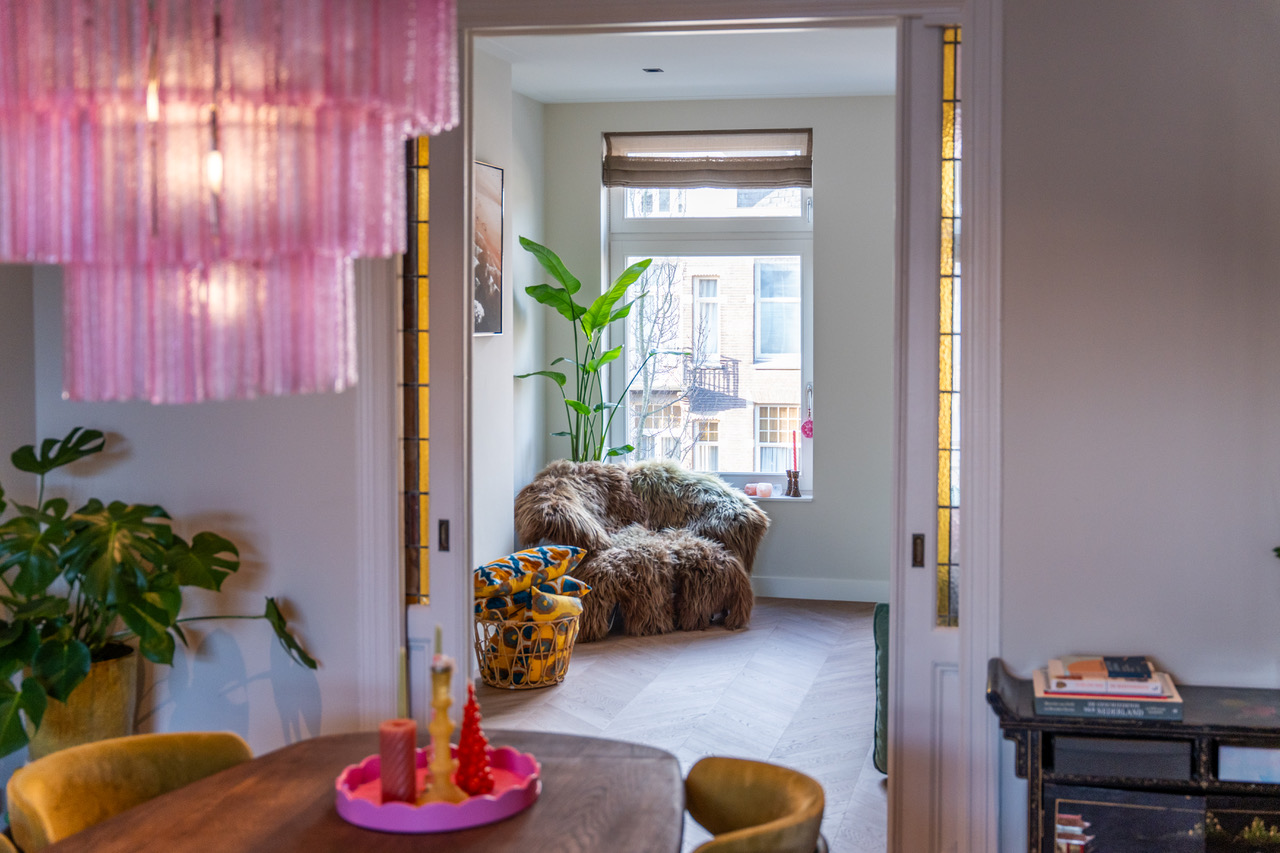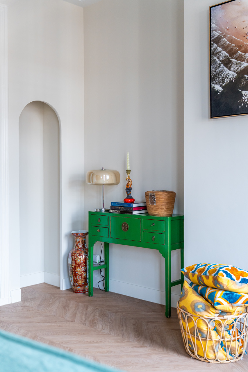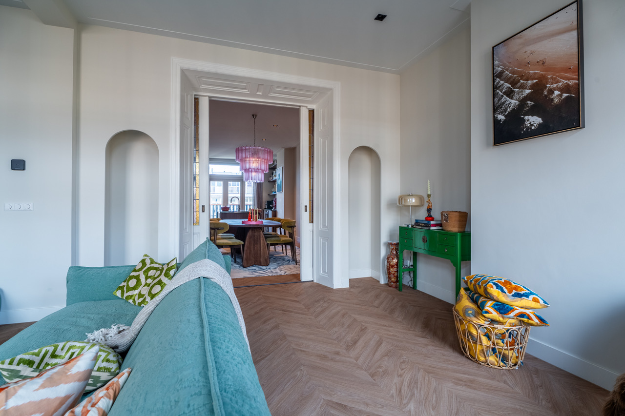 Zodra je binnenkomt, zie je die kleuren. De groene trap zet meteen de toon. In de woonkamer staat een grote turquoise bank met fluweelstof, gecombineerd met een roze hanglamp die je niet over het hoofd ziet. De visgraatvloer loopt door het hele appartement en houdt de basis rustig, waardoor de kleuraccenten extra goed uitkomen.