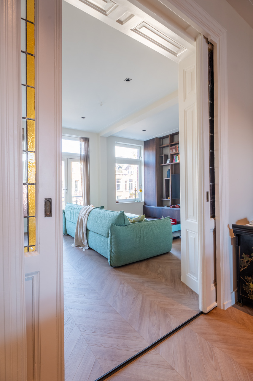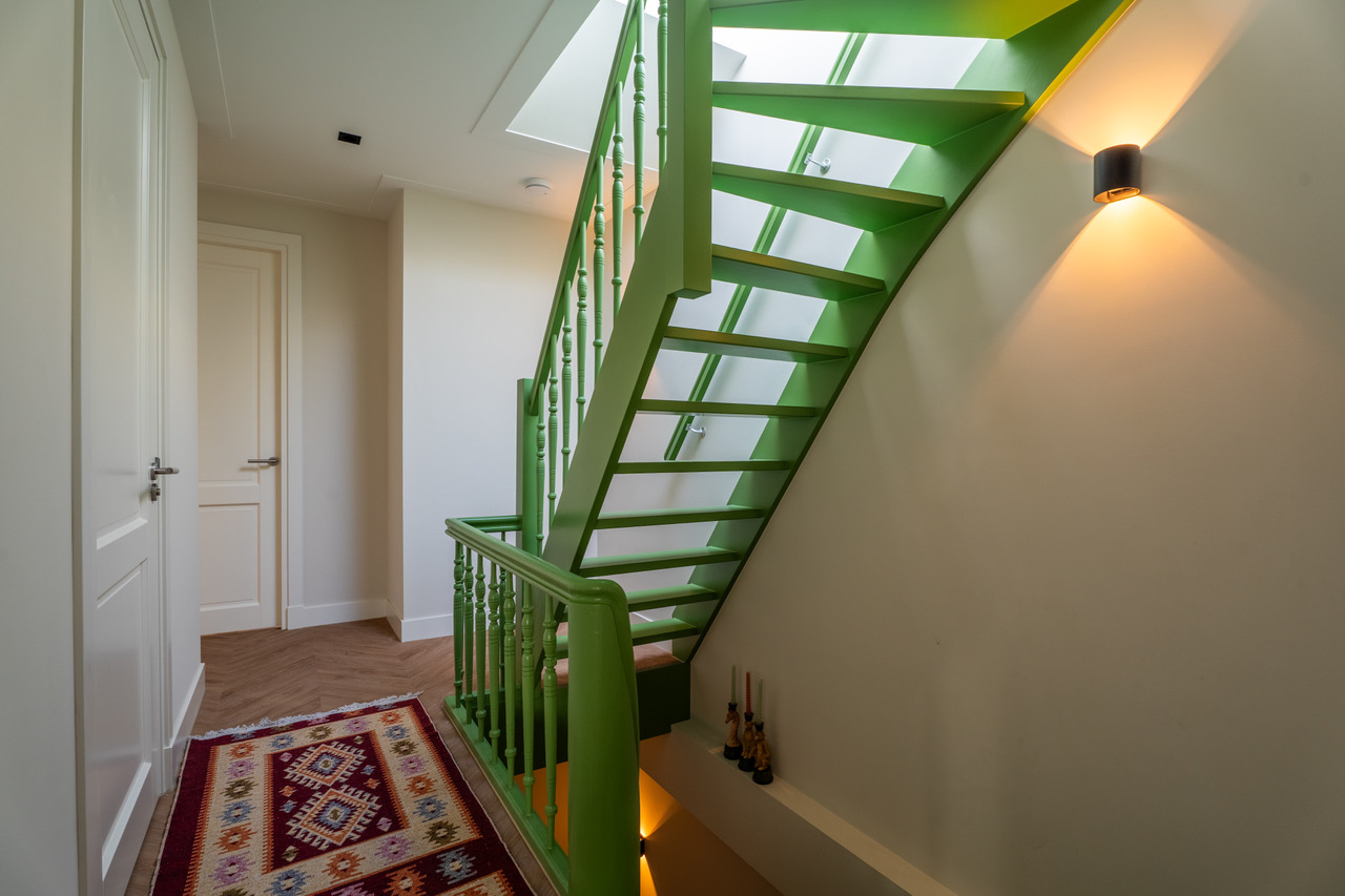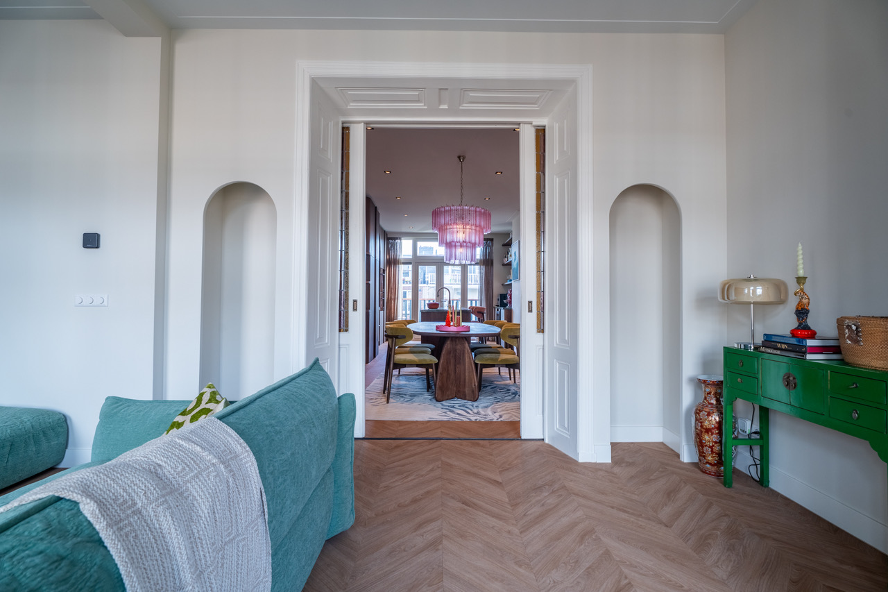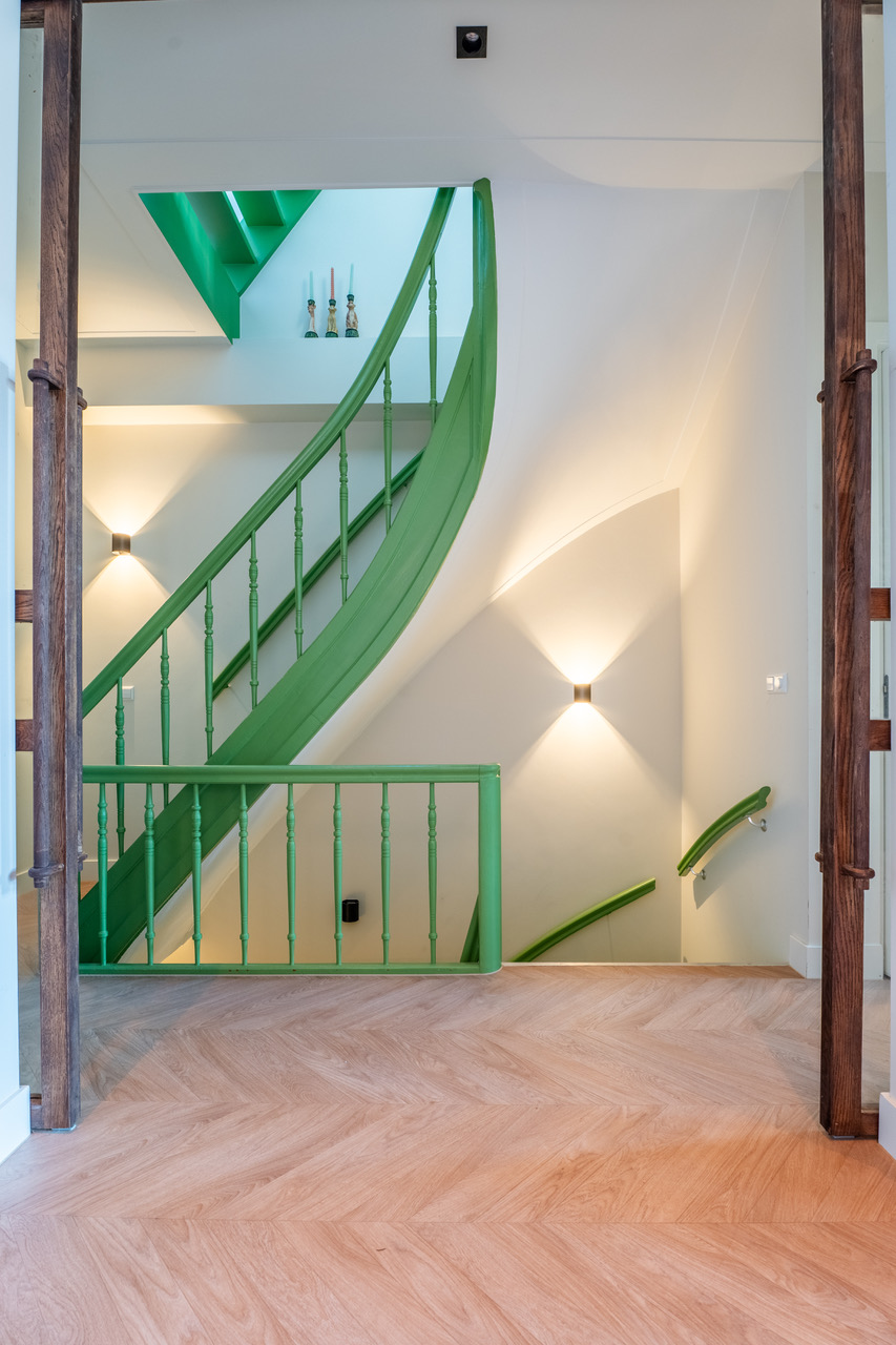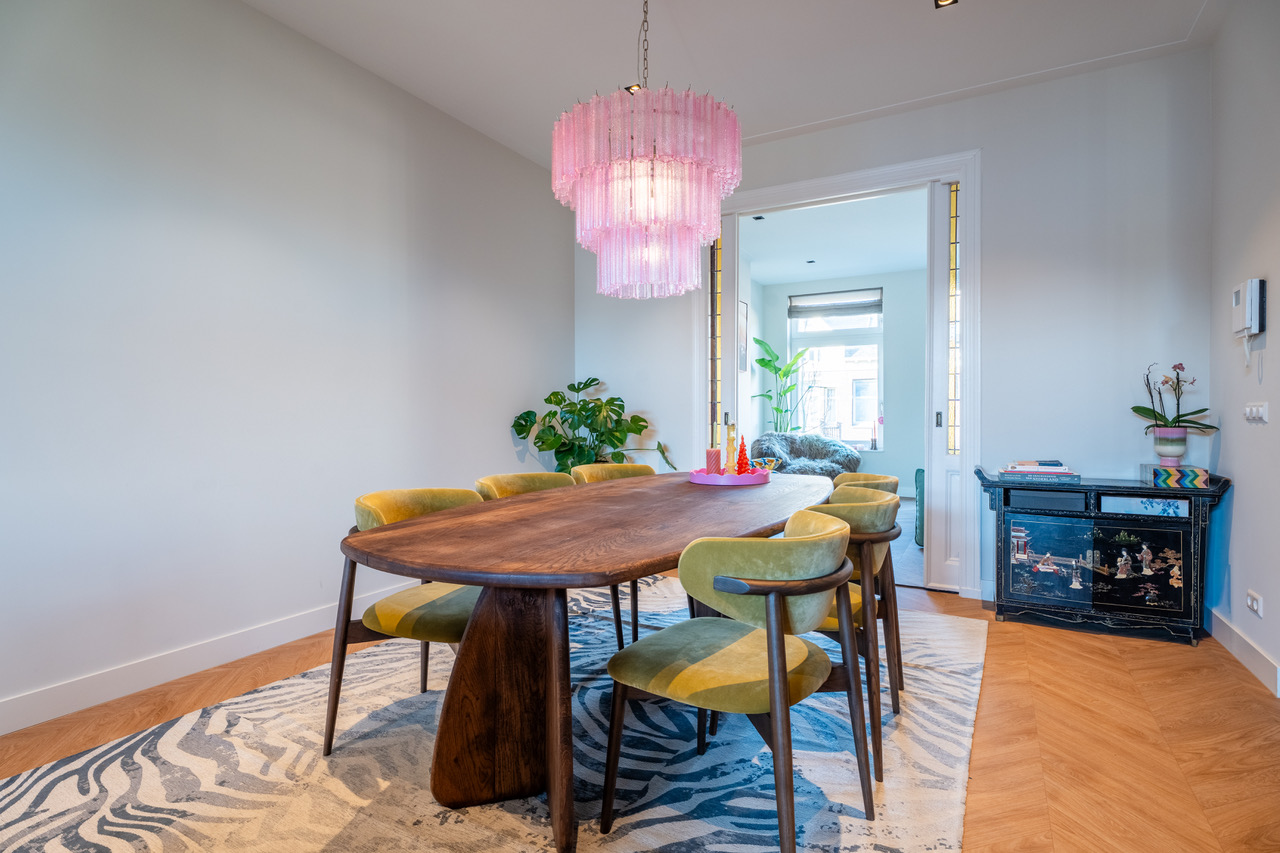 Zodra je binnenkomt, zie je die kleuren. De groene trap zet meteen de toon. In de woonkamer staat een grote turquoise bank met fluweelstof, gecombineerd met een roze hanglamp die je niet over het hoofd ziet. De visgraatvloer loopt door het hele appartement en houdt de basis rustig, waardoor de kleuraccenten extra goed uitkomen.