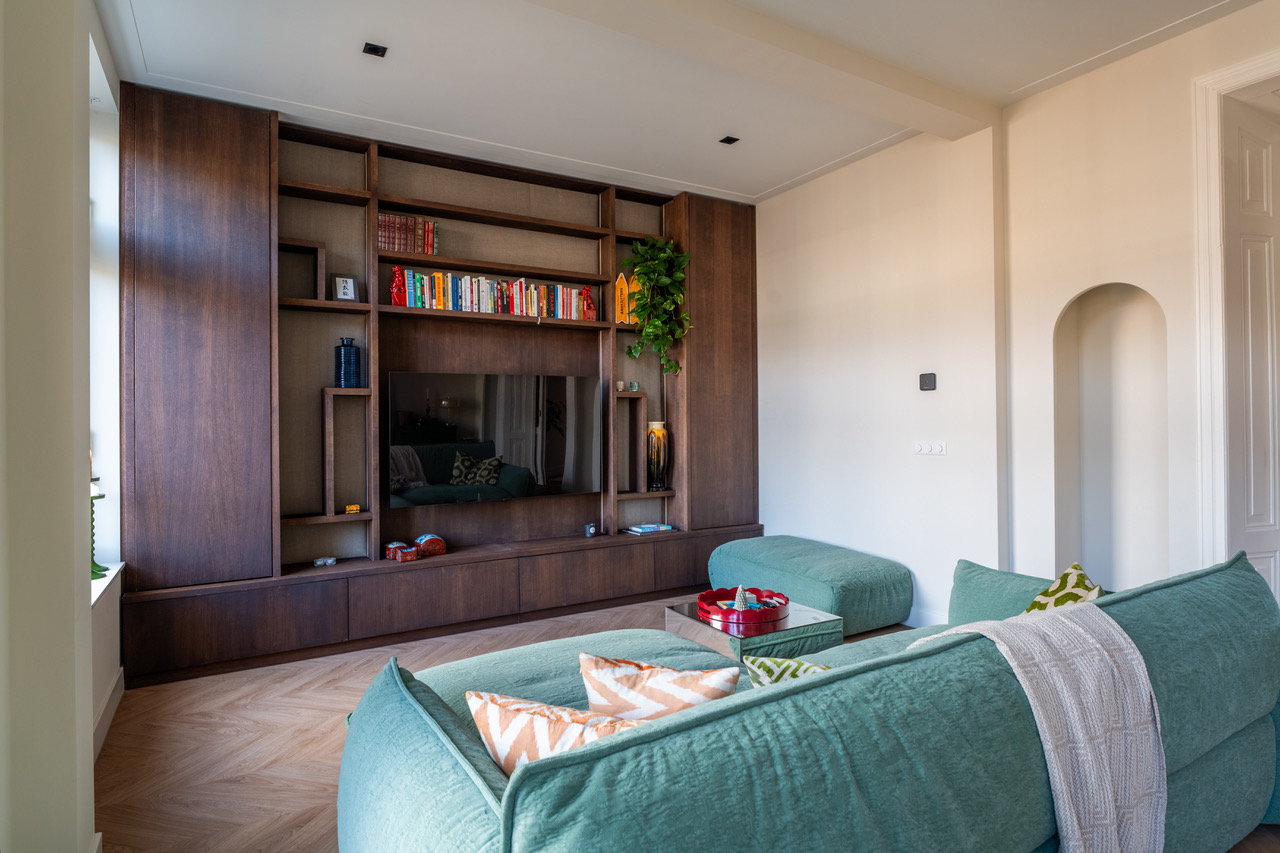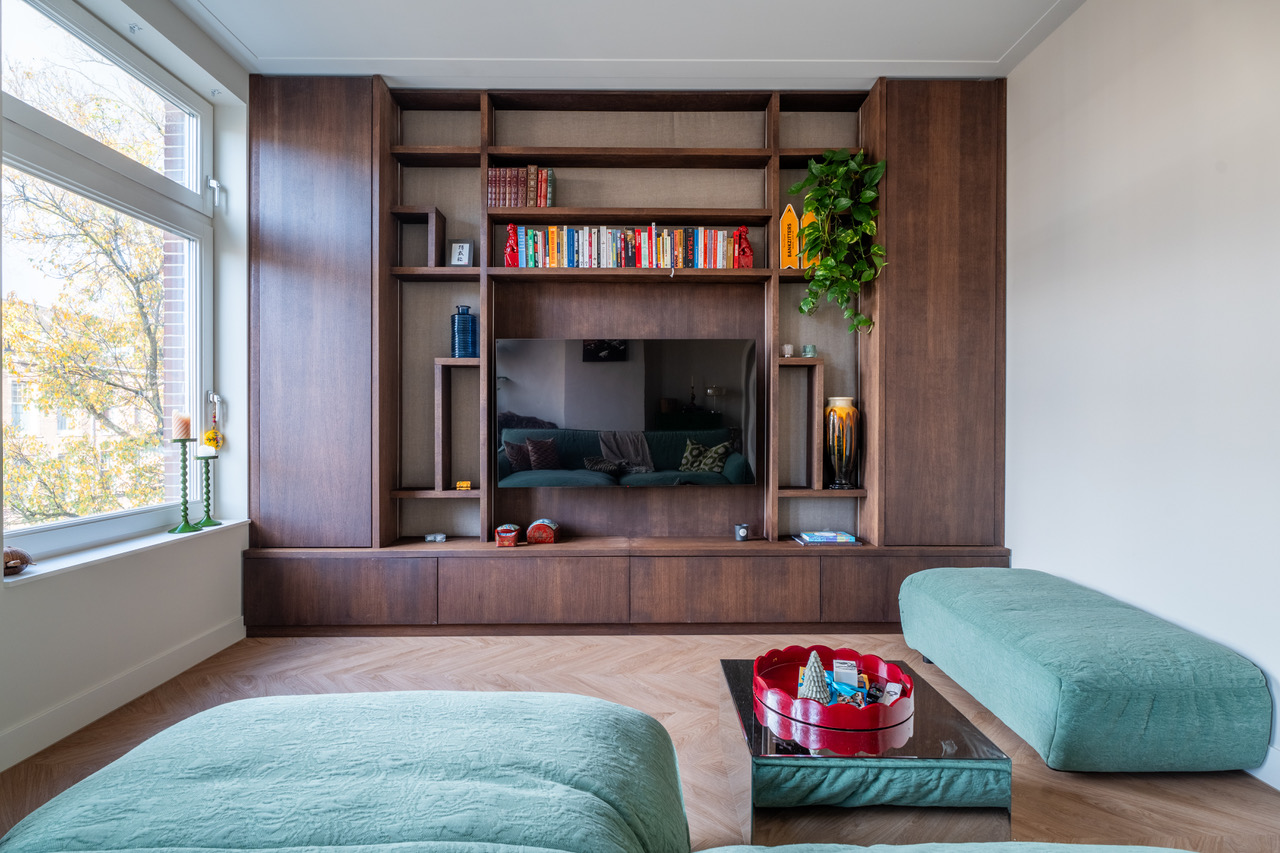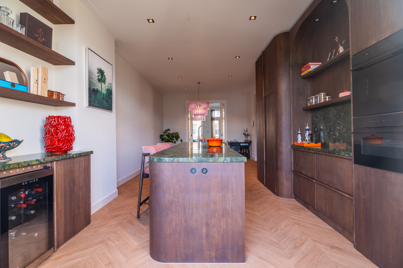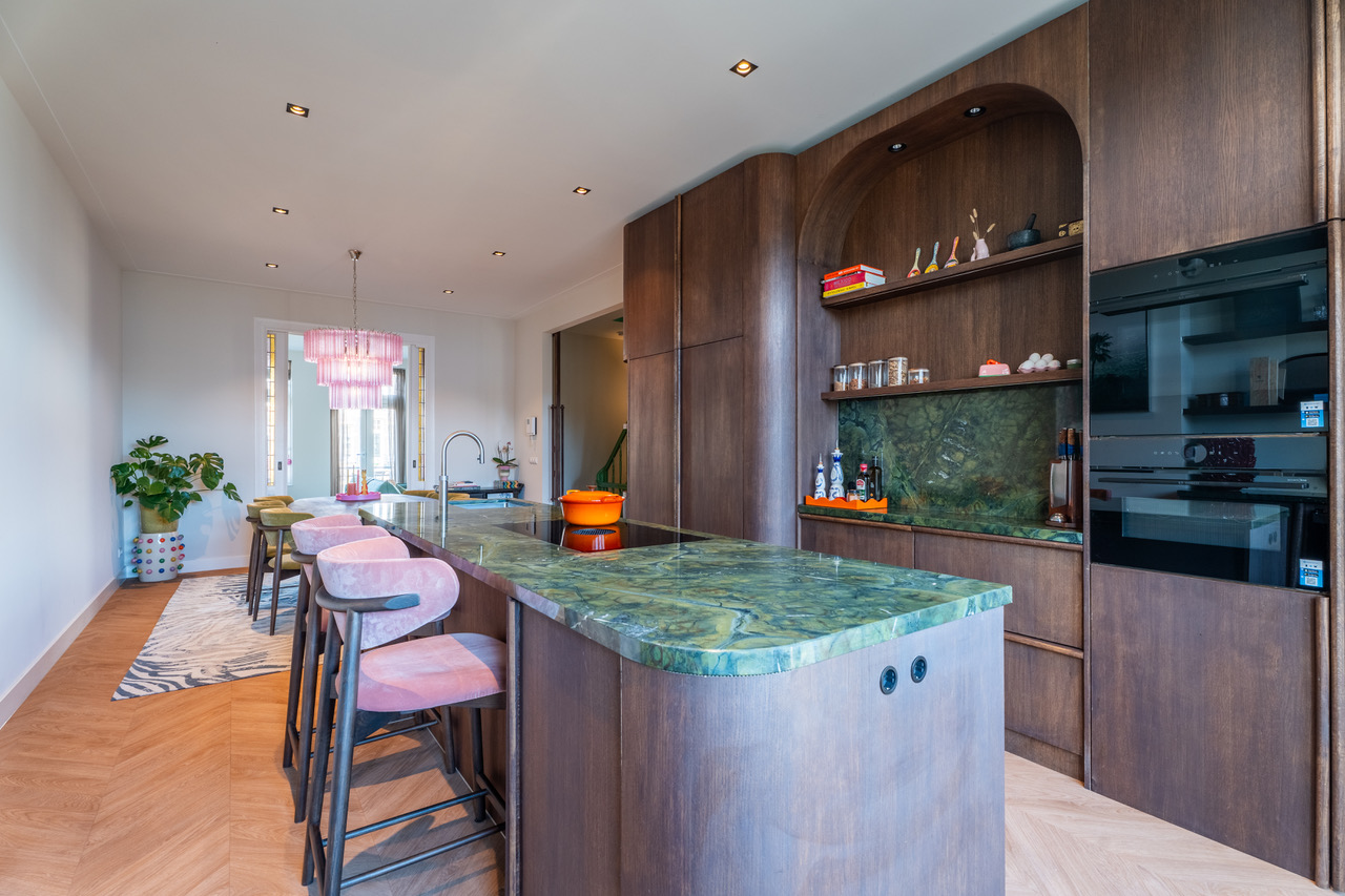 Zodra je binnenkomt, zie je die kleuren. De groene trap zet meteen de toon. In de woonkamer staat een grote turquoise bank met fluweelstof, gecombineerd met een roze hanglamp die je niet over het hoofd ziet. De visgraatvloer loopt door het hele appartement en houdt de basis rustig, waardoor de kleuraccenten extra goed uitkomen.