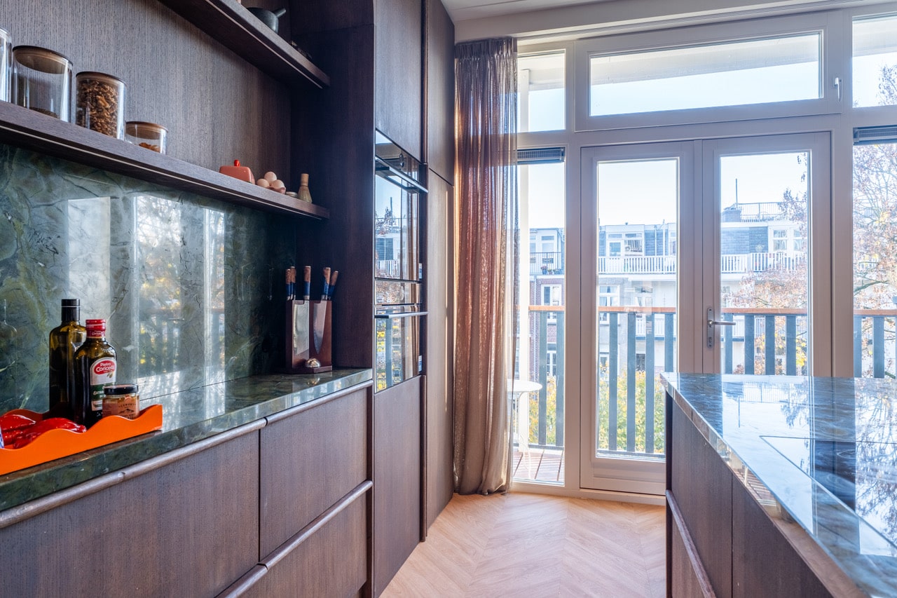 De houten keuken is ruim opgezet met donker hout, veel werkblad en grote raampartijen die uitzicht geven op de straat. Er is genoeg ruimte voor crew en apparatuur zonder dat het rommelig wordt. De keuken leent zich perfect voor kookopnames, productfotografie, table set-ups, interviews en demo’s. Alles is functioneel, maar het ziet er ook gewoon goed uit op camera.