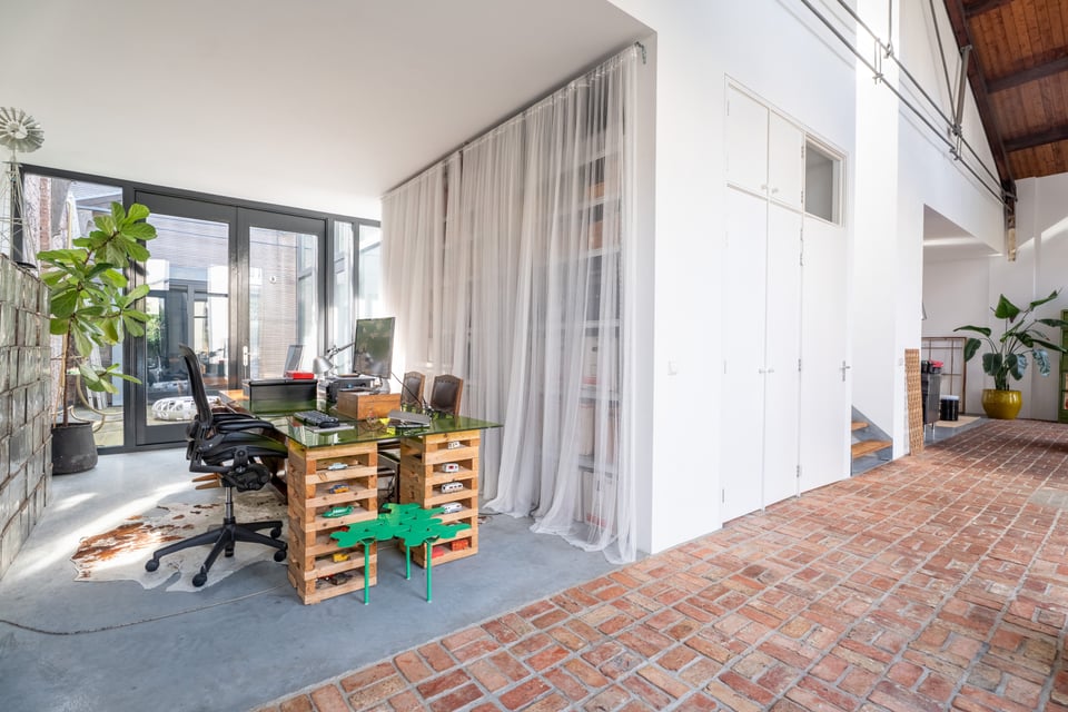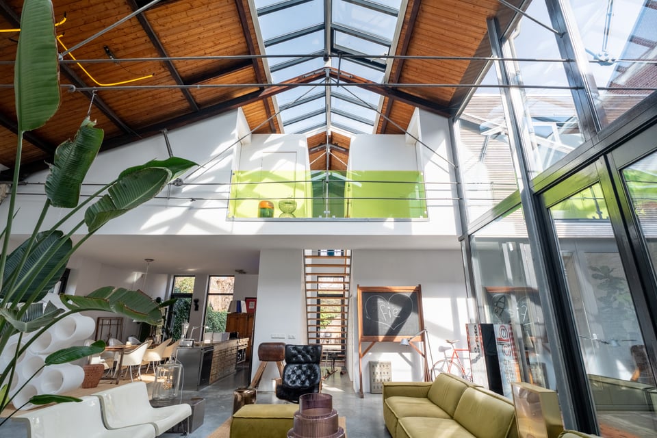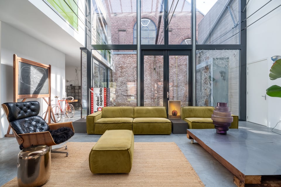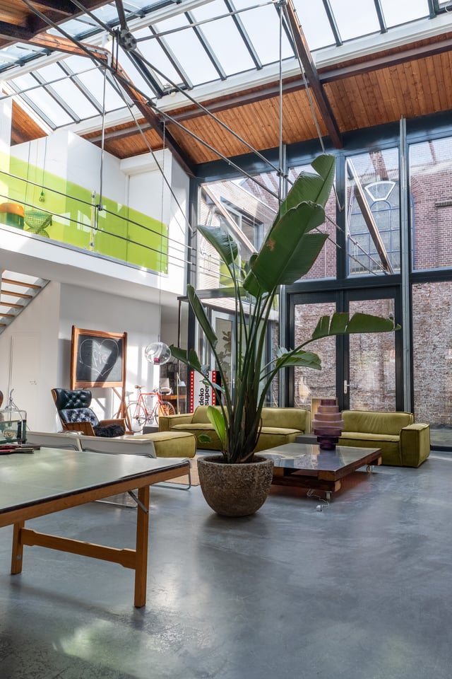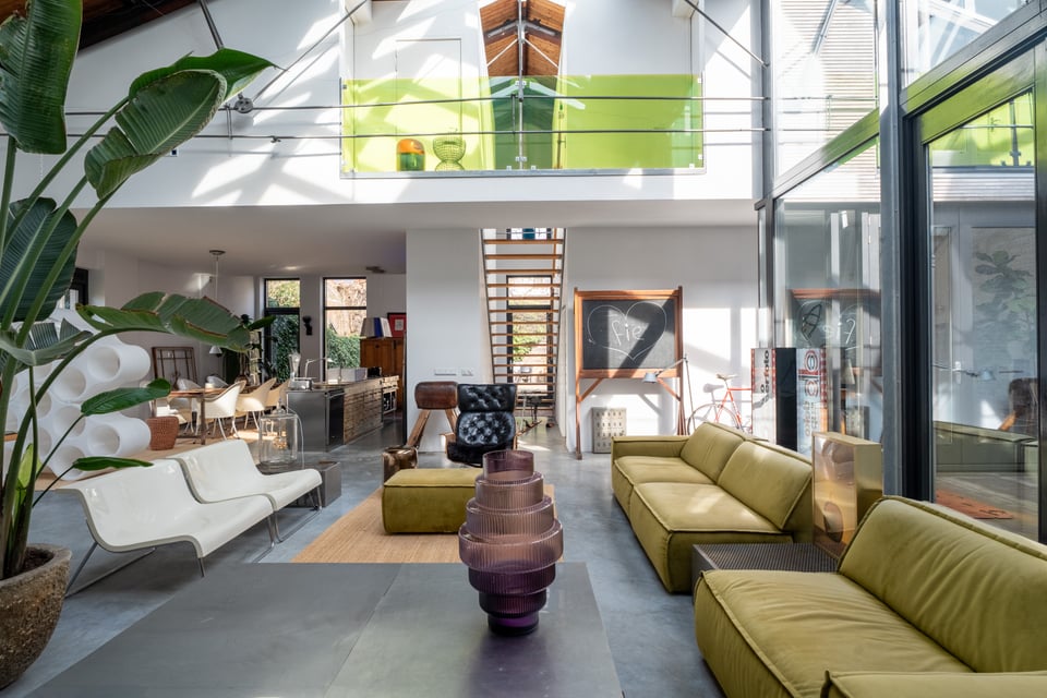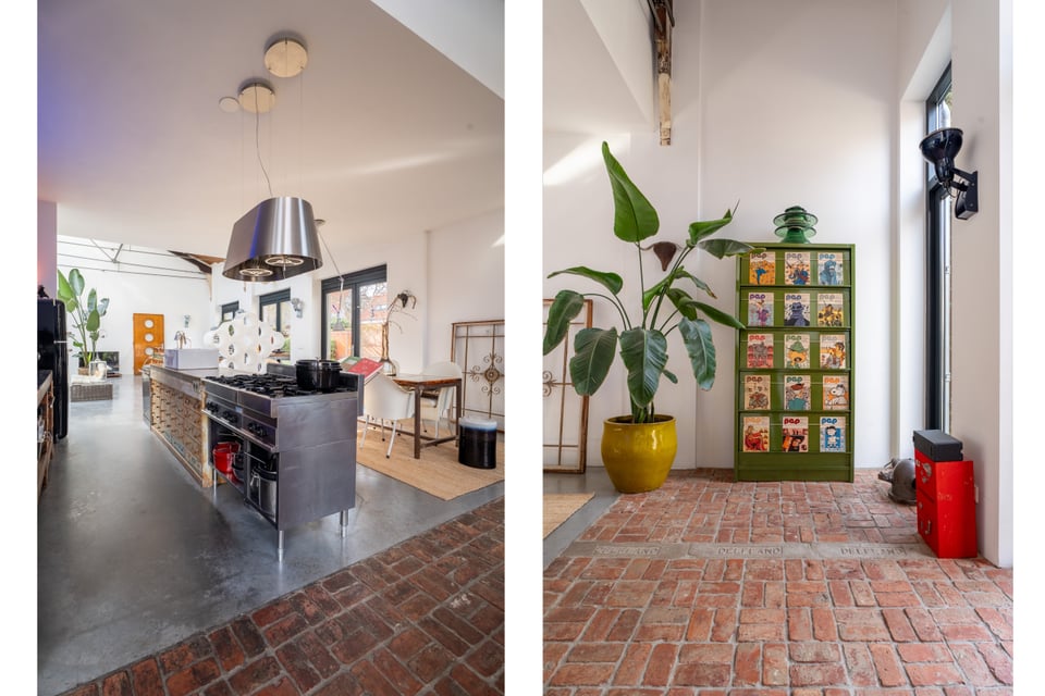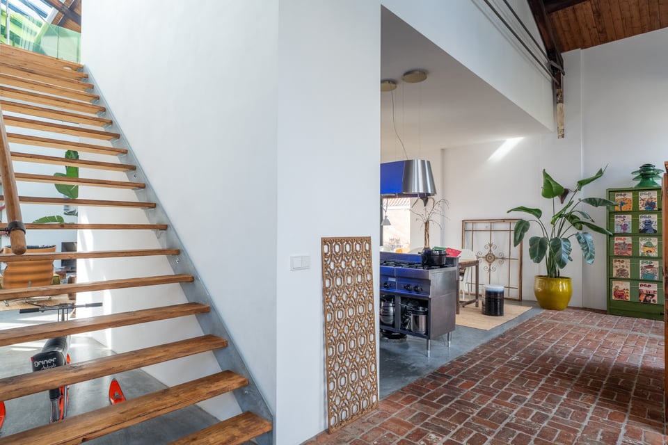 In het centrum van Delft vind je deze industriële loft. Verscholen op een binnenplaats tussen twee Delftse grachten. Dat “verscholen” is precies wat het zo bijzonder maakt. Je loopt erdoorheen en beseft: dit is geen gewone locatie. Dit is een 300 jaar oude loods. Ooit onderdeel van De Grieksche A, een beroemde Delfts Blauw plateelbakkerij. Volledig omgebouwd tot een 275m² grote loft vol karakter, daglicht en onverwachte details.