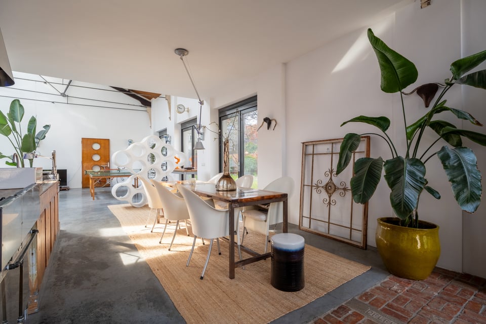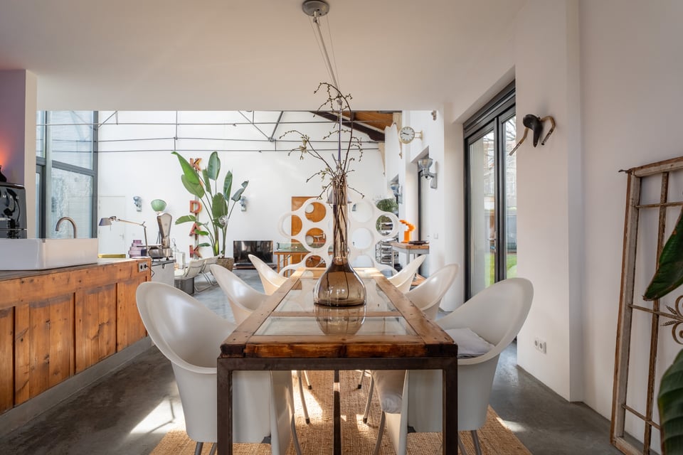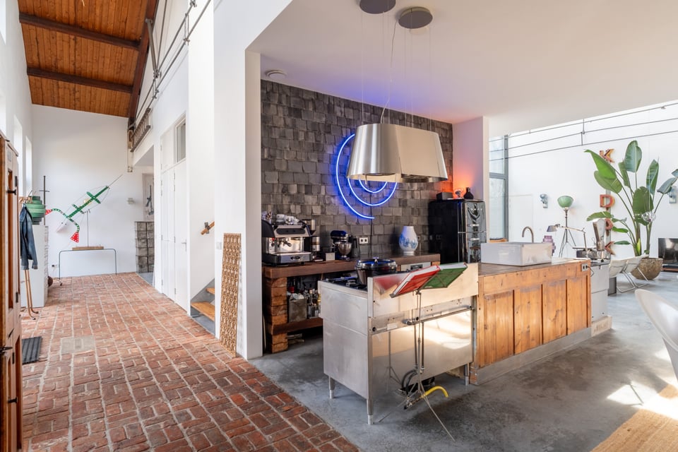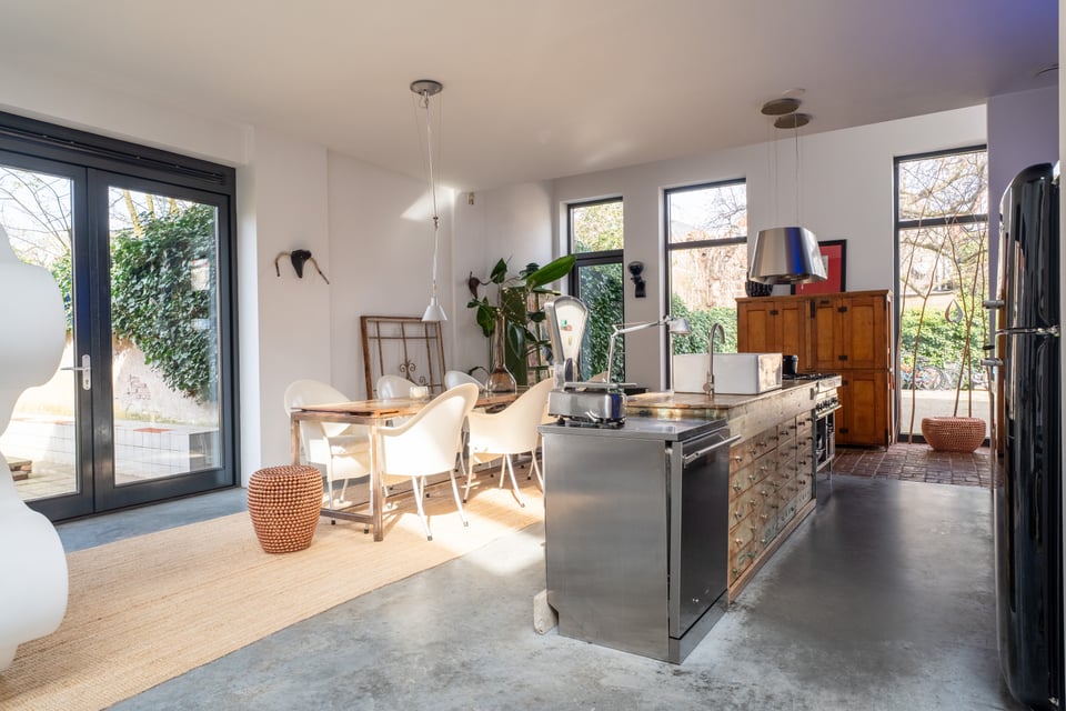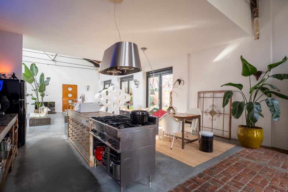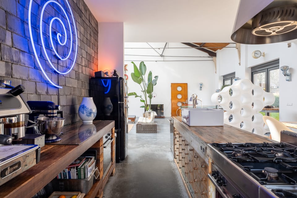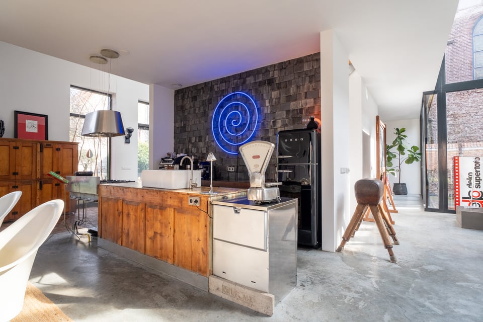 De open keuken sluit perfect aan op de industriële sfeer. Een massief stalen kookeiland met professioneel gasfornuis, een grote zwarte Smeg koelkast en een professionele espressomachine, het voelt als een keuken die echt gebruikt wordt, en dat zie je terug in beeld. De naadloze overgang van keuken naar eetkamer naar woonkamer maakt de ruimte bovendien enorm flexibel in gebruik.