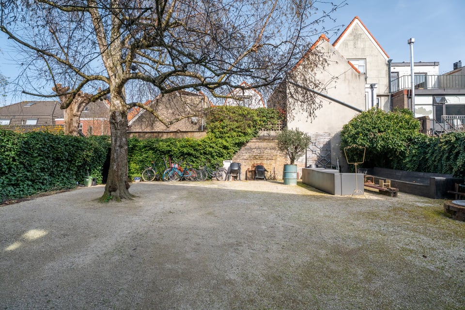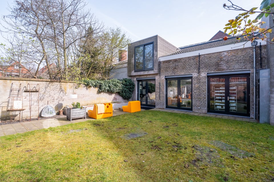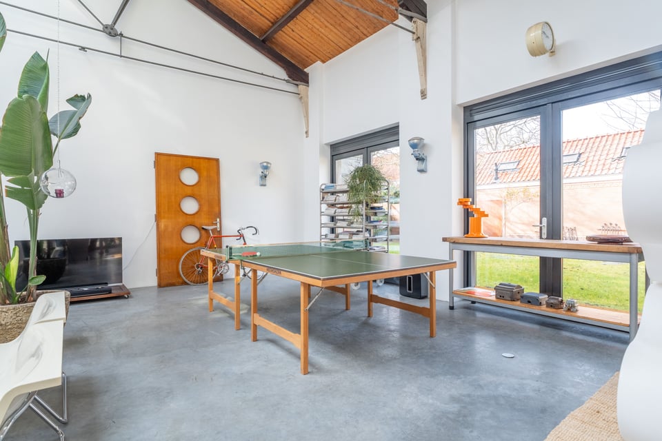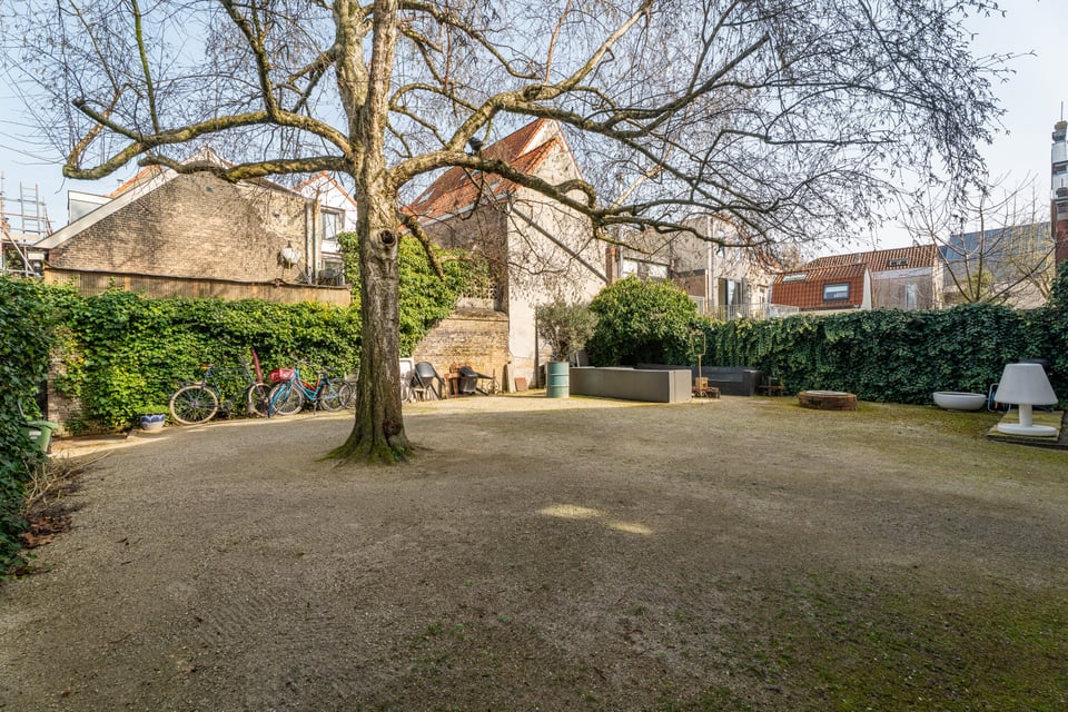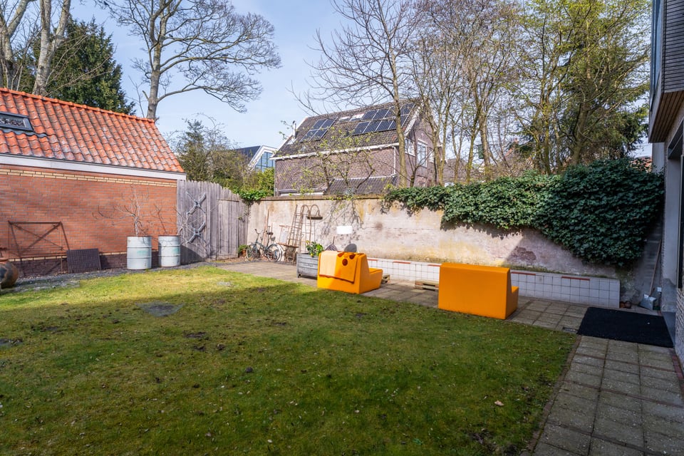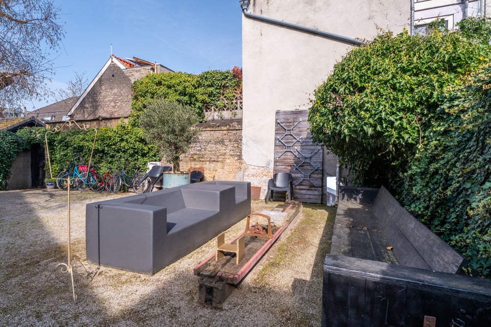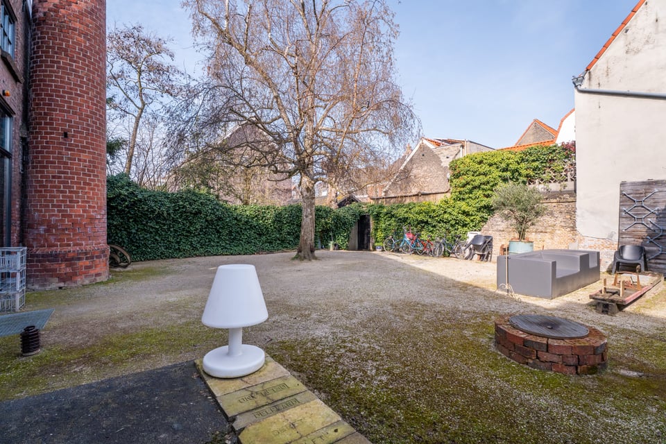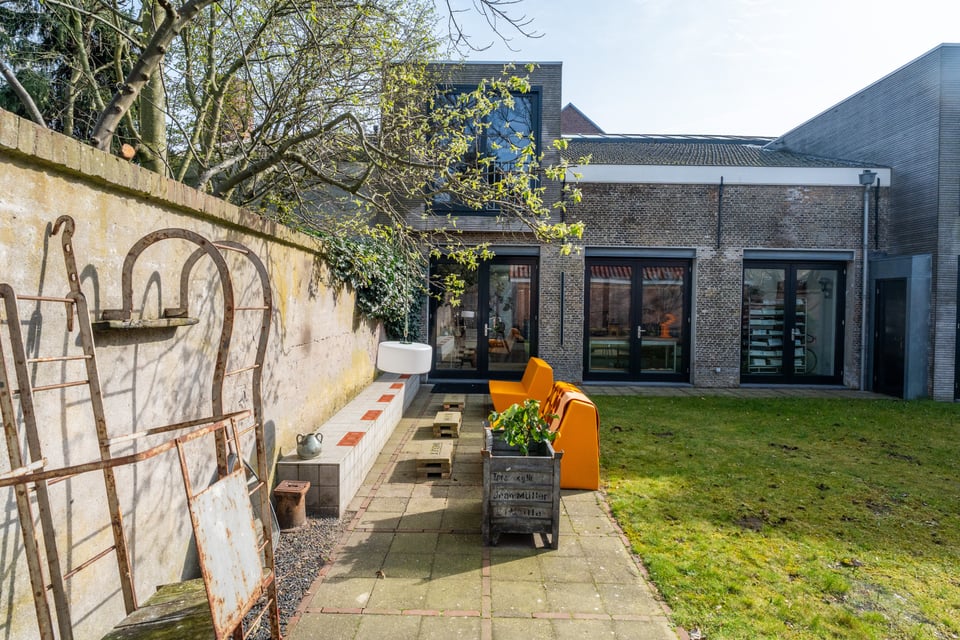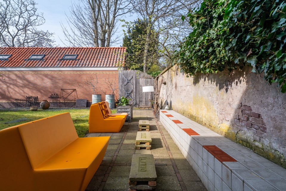 Buiten heb je de keuze uit twee totaal verschillende tuinen. De grindtuin heeft een lange eettafel voor tien tot twaalf personen, een zithoek met twee banken en een barbecue, en een oude stenen schoorsteen als decor op de achtergrond. De grastuin aan de andere kant heeft tot laat in de avond zon, twee felgele banken en een heel andere energie. Voor outdoor shoots heb je hier dus twee compleet verschillende settings binnen handbereik.