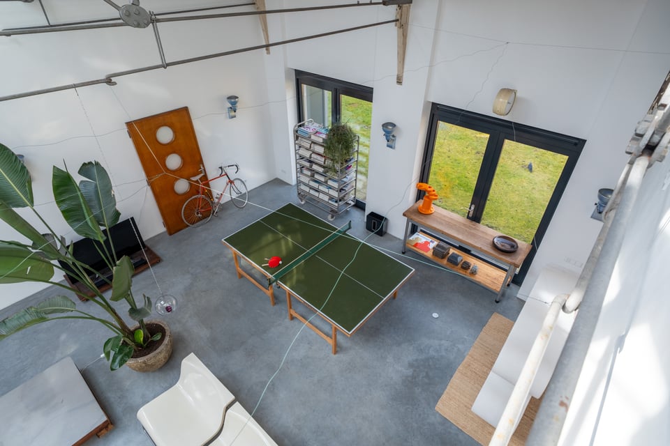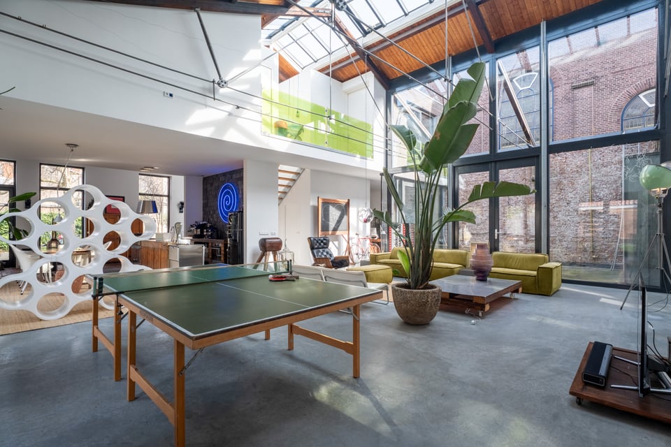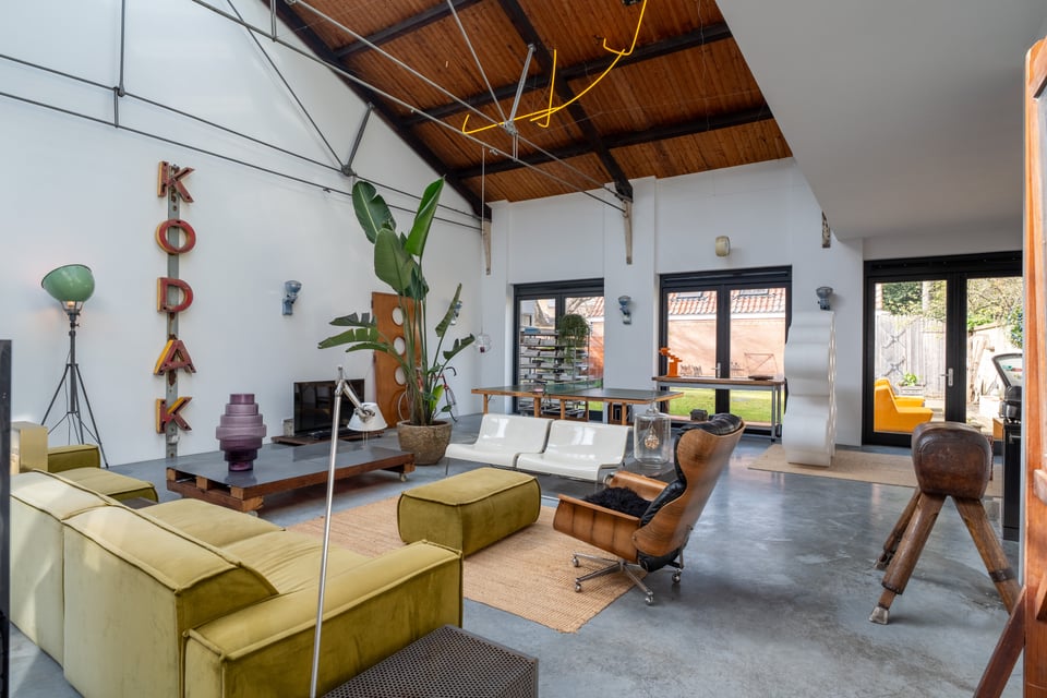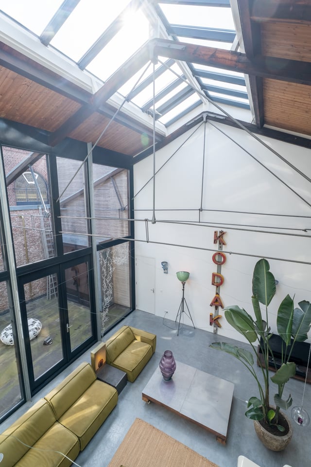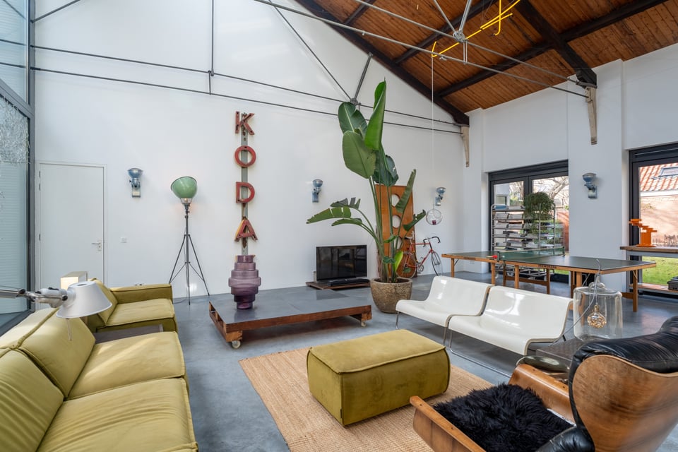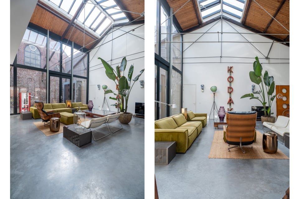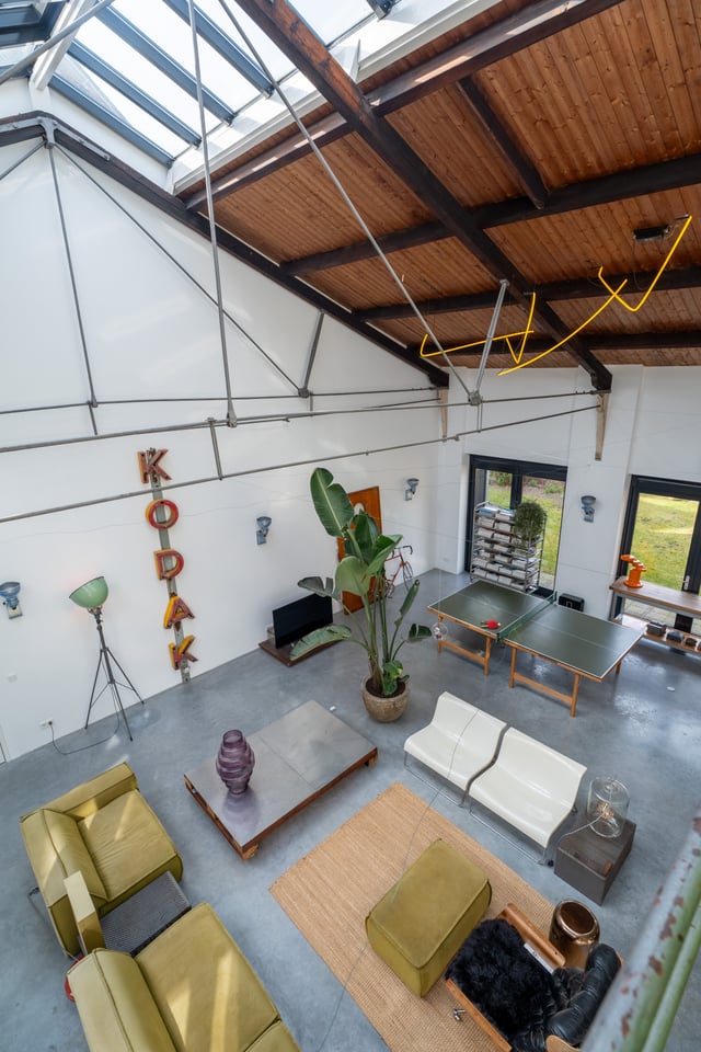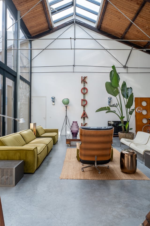 De grote woonkamer is het hart van de locatie. Een glazen lichtstraat over de volledige lengte van het plafond gooit een zee aan daglicht naar binnen, de hele dag door. De gevlinderde betonvloer, de hoge bakstenen muren, een vintage Kodak lichtreclame aan de wand en een olijfgroene loungebank maken dit tot een ruimte die zich vanzelf laat fotograferen. Of je nou een editorial shoot, een commercial of een filmscène draait, dit interieur geeft je van alles om mee te werken.