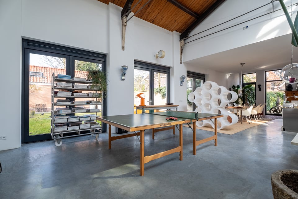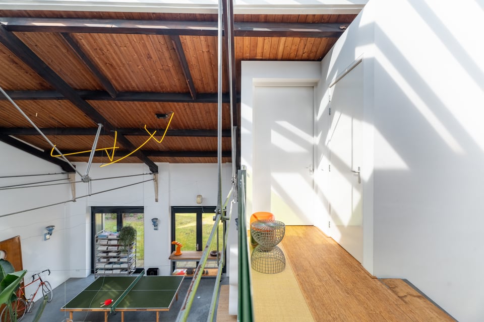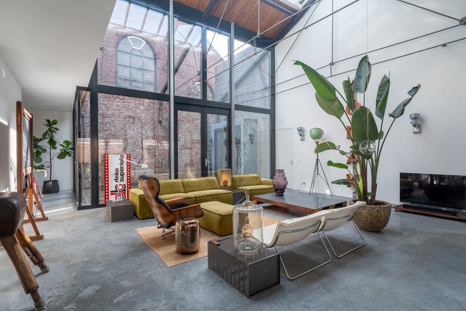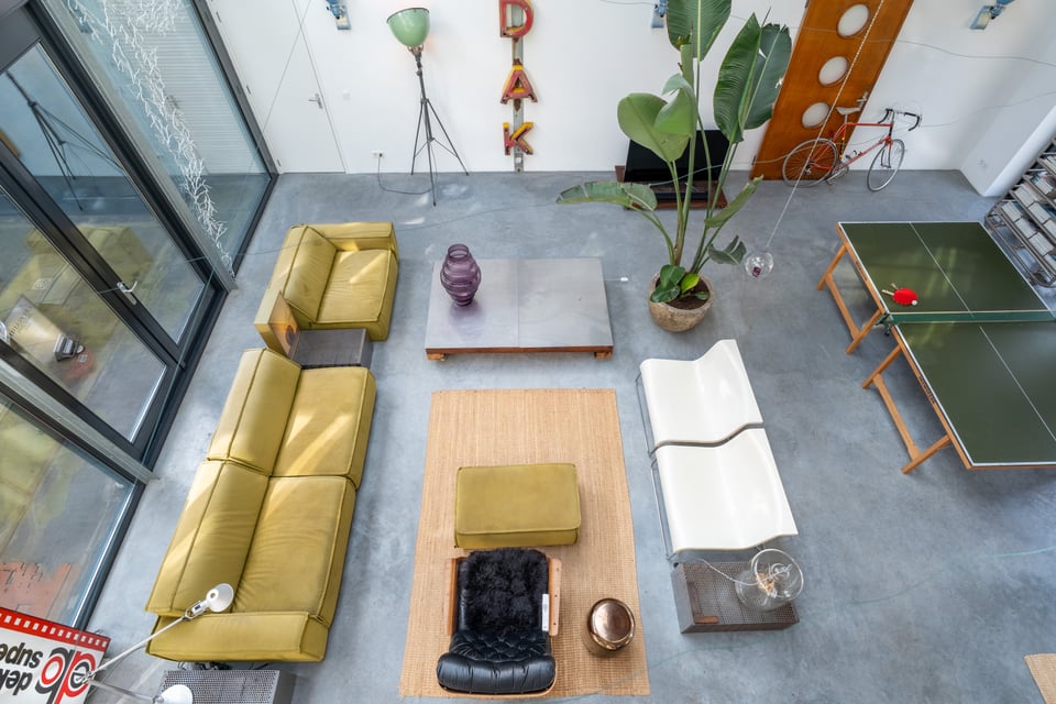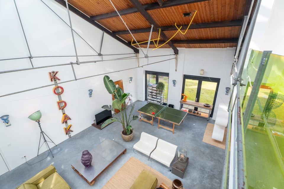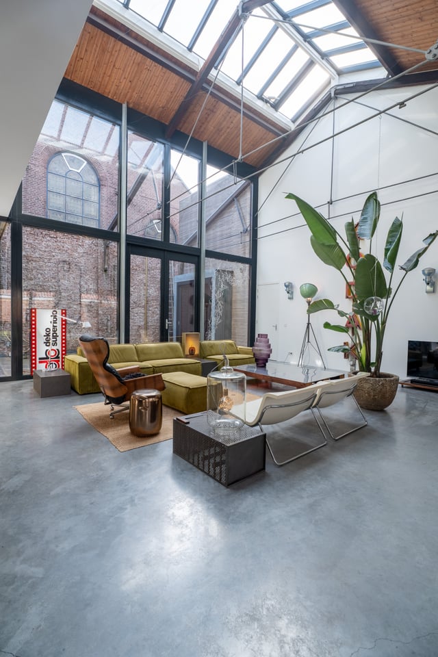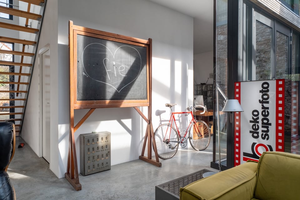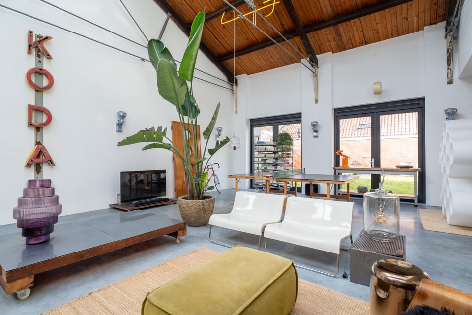 De grote woonkamer is het hart van de locatie. Een glazen lichtstraat over de volledige lengte van het plafond gooit een zee aan daglicht naar binnen, de hele dag door. De gevlinderde betonvloer, de hoge bakstenen muren, een vintage Kodak lichtreclame aan de wand en een olijfgroene loungebank maken dit tot een ruimte die zich vanzelf laat fotograferen. Of je nou een editorial shoot, een commercial of een filmscène draait, dit interieur geeft je van alles om mee te werken.