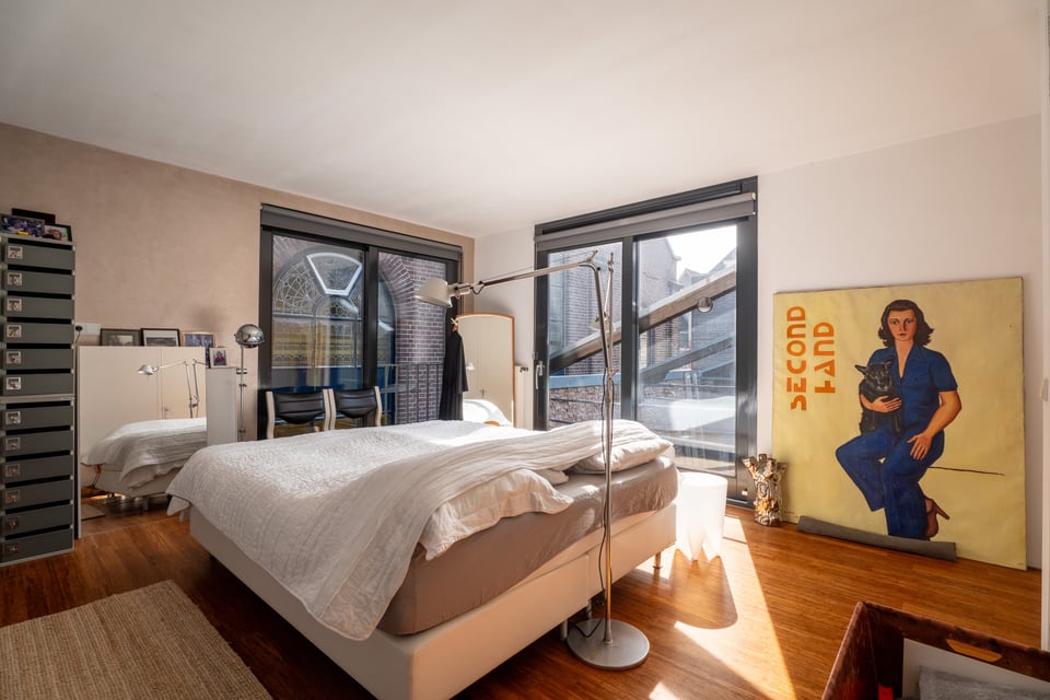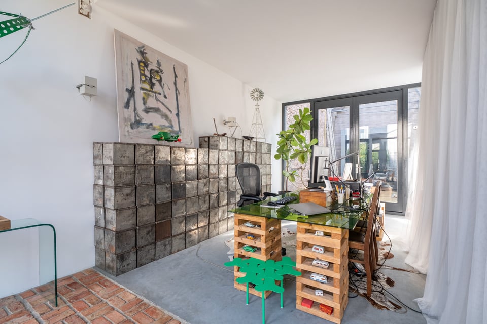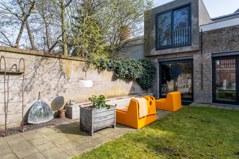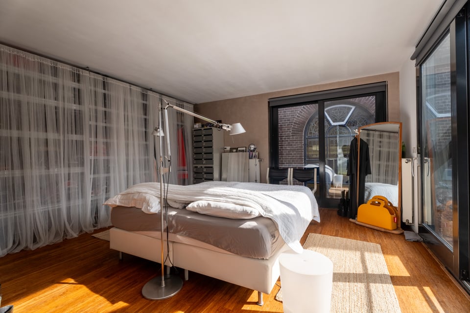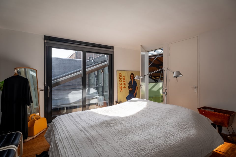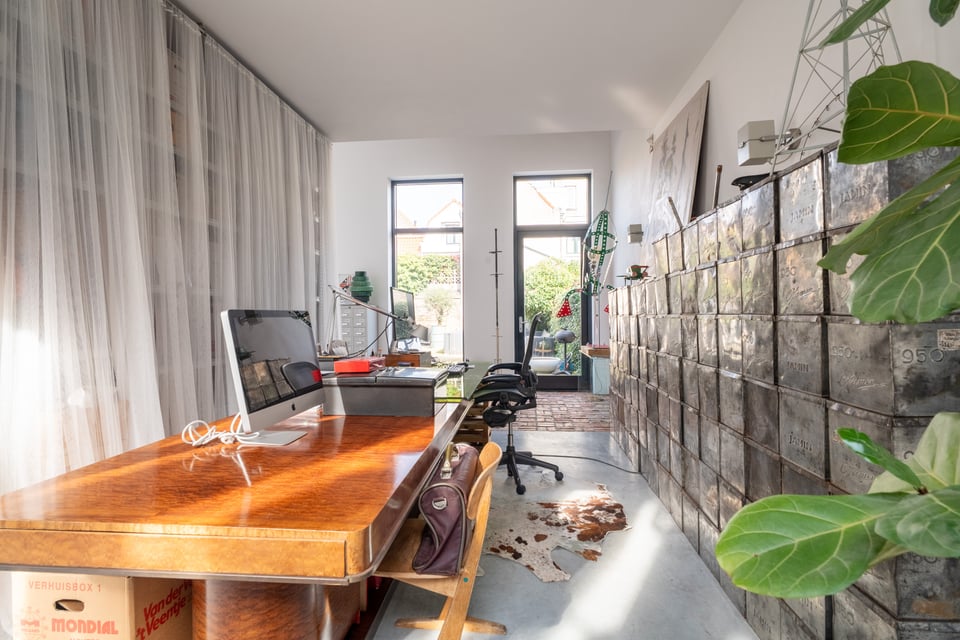 Op de begane grond is een lichte slaapkamer met doorzichtige gordijnen en directe toegang tot de buitenruimte. De werkkamer heeft een lange houten schrijftafel, een wand vol vintage stalen kluisjes en uitzicht op de tuin. En dan is er nog de patio, met uitzicht op de Zuiderkerk. Dat schot is eigenlijk al een productie op zich.
