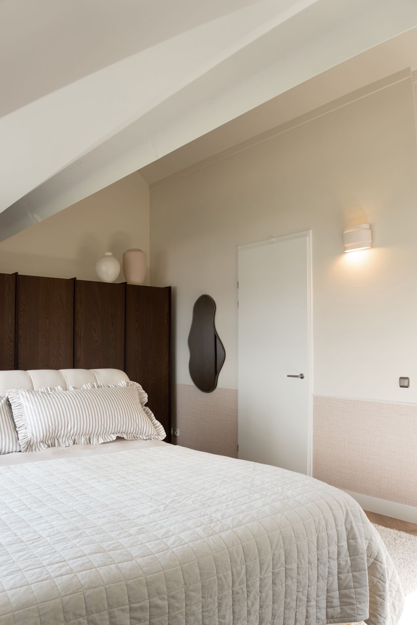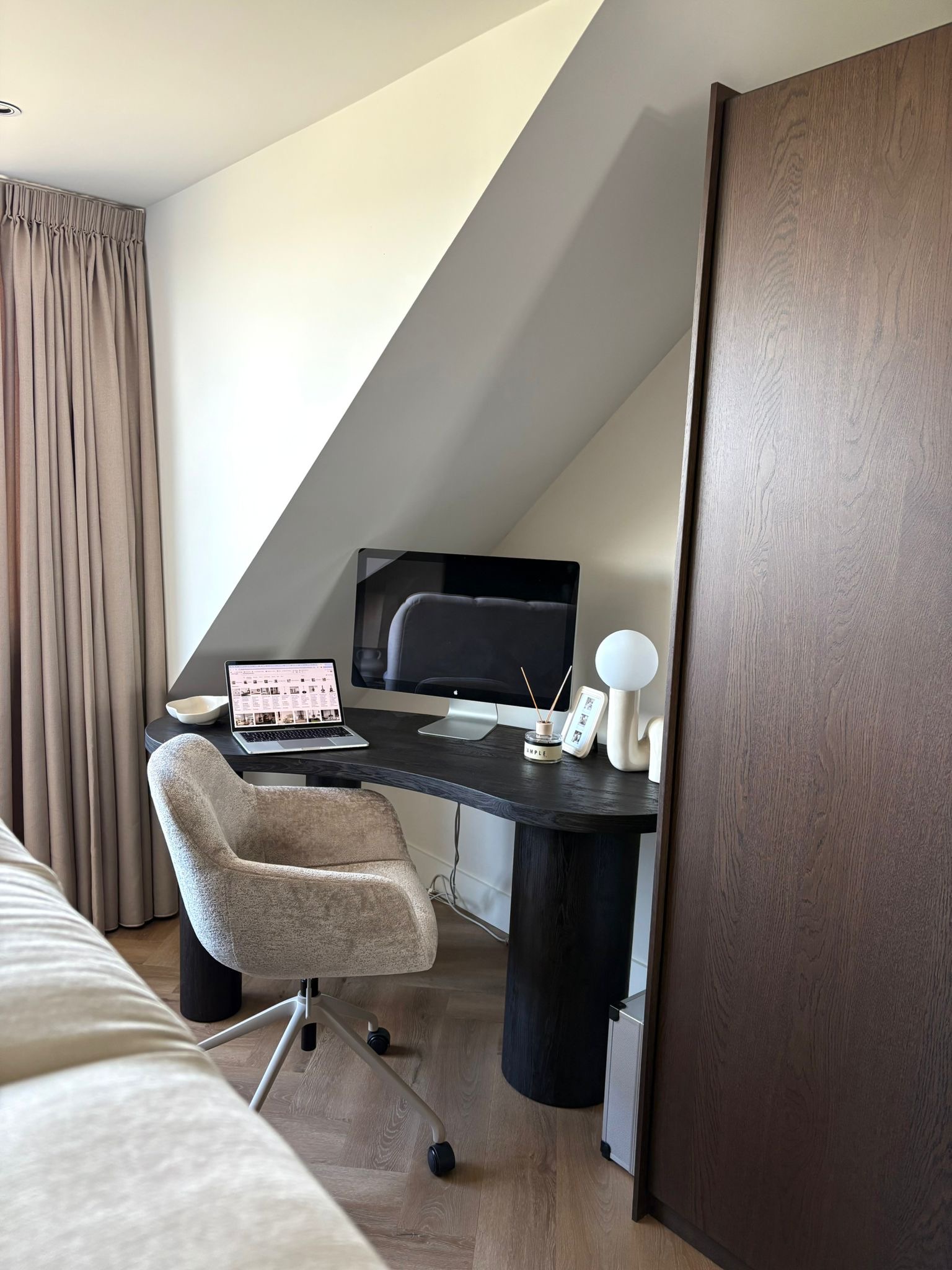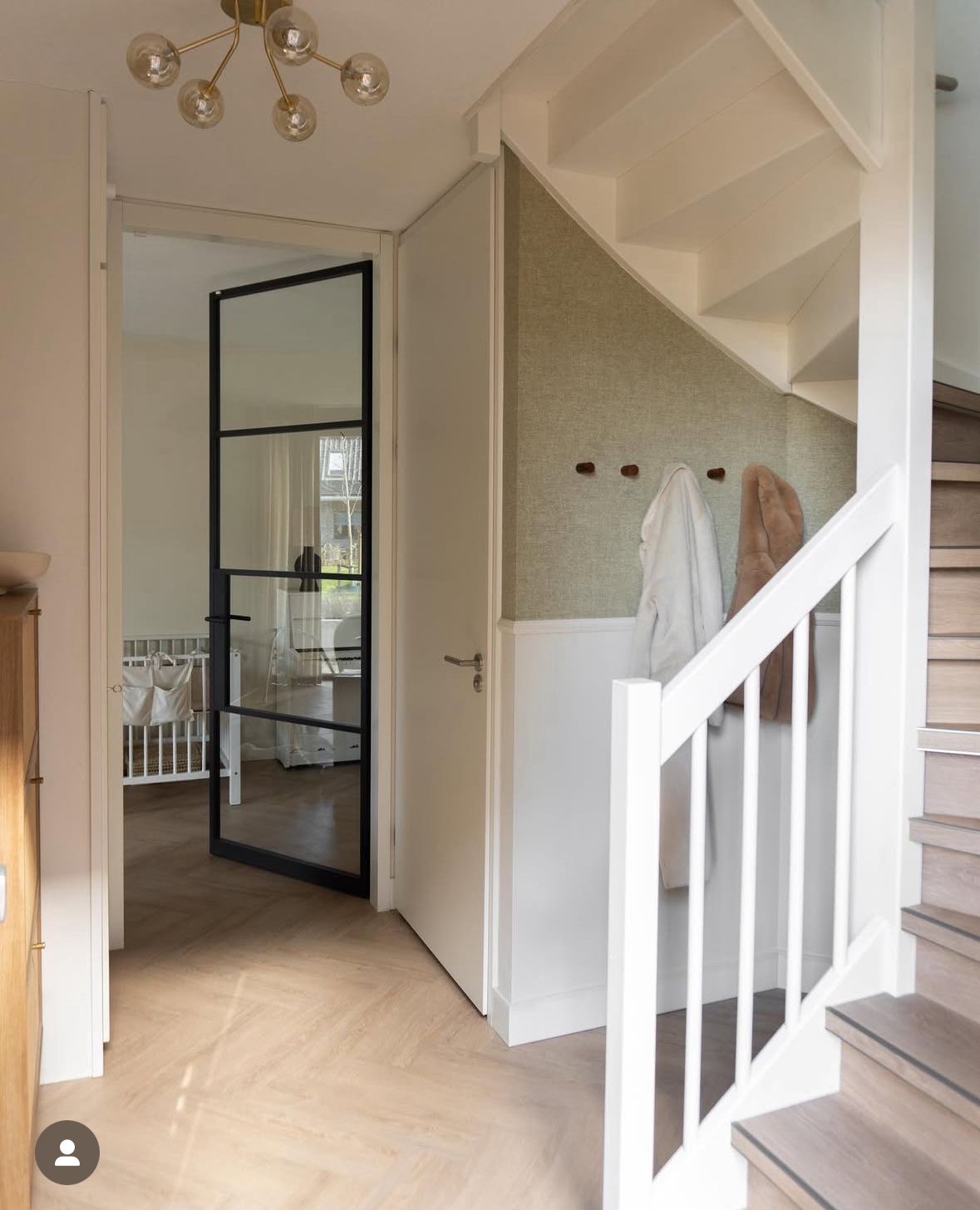 Op de eerste verdieping bevinden zich twee lichte kinderkamers en een moderne badkamer, allemaal ingericht volgens de rustige Japandi-esthetiek. De combinatie van zachte kleuren, natuurlijk hout en minimalistische details zorgt voor een serene en eigentijdse uitstraling, perfect voor interieur of kindershoots.