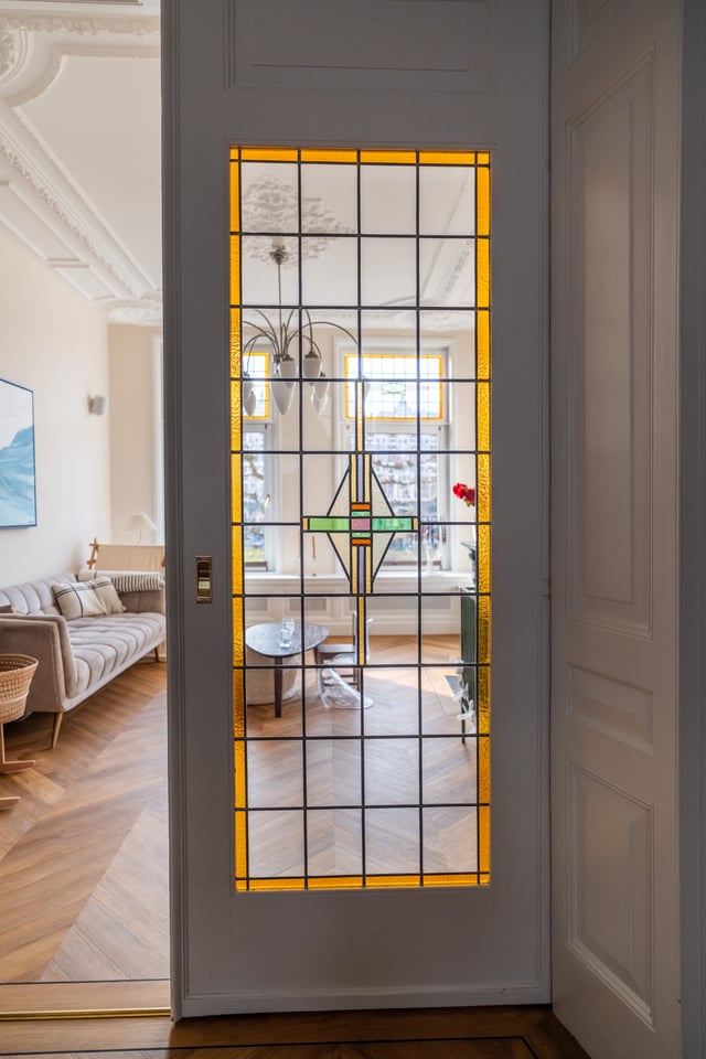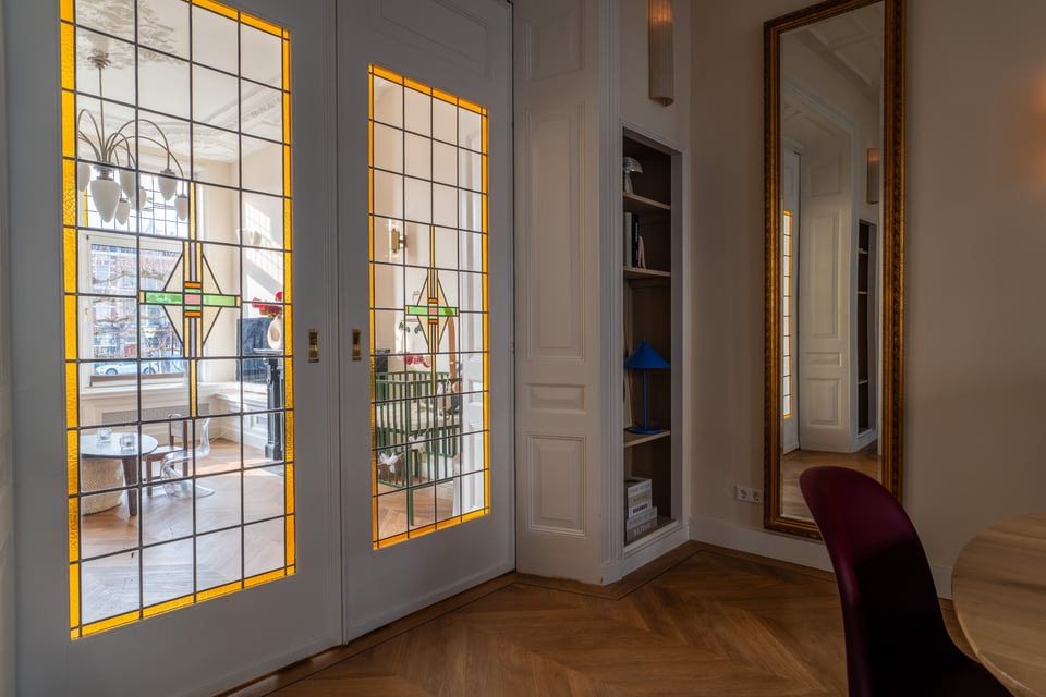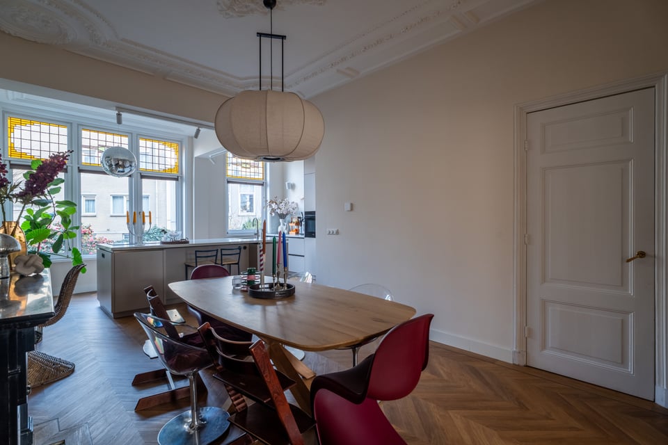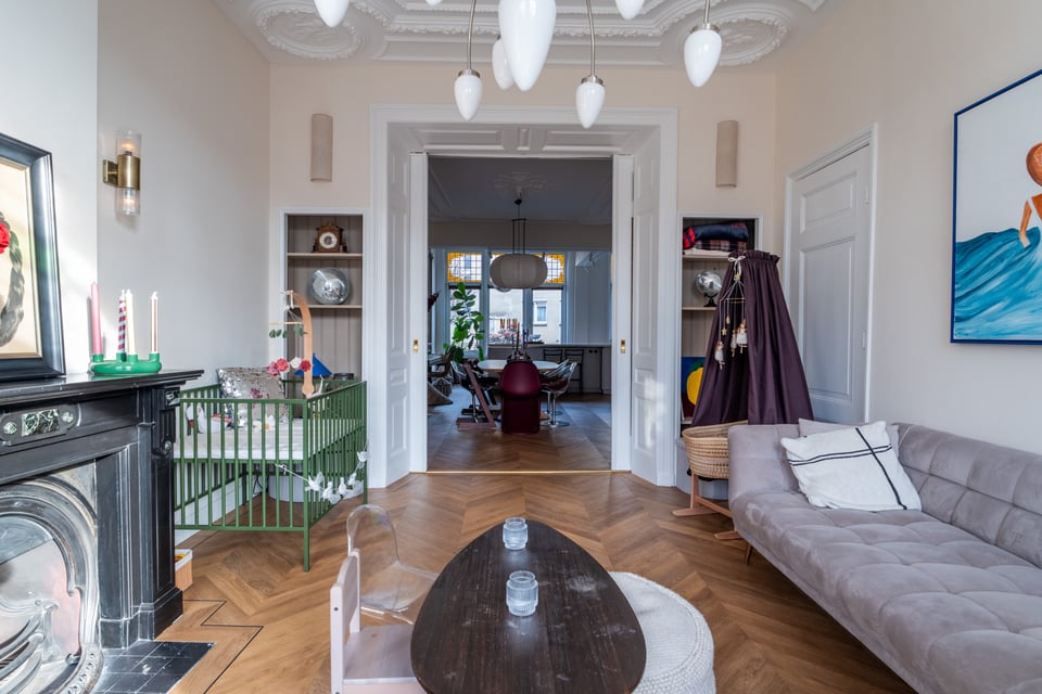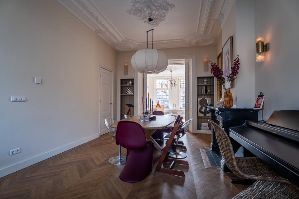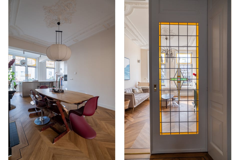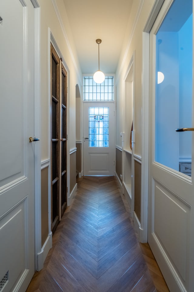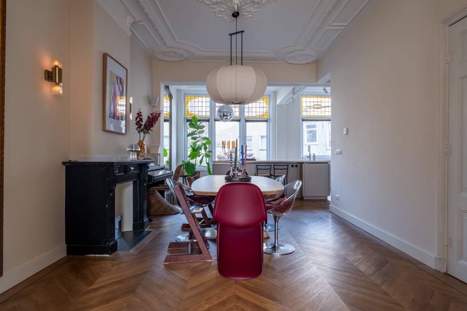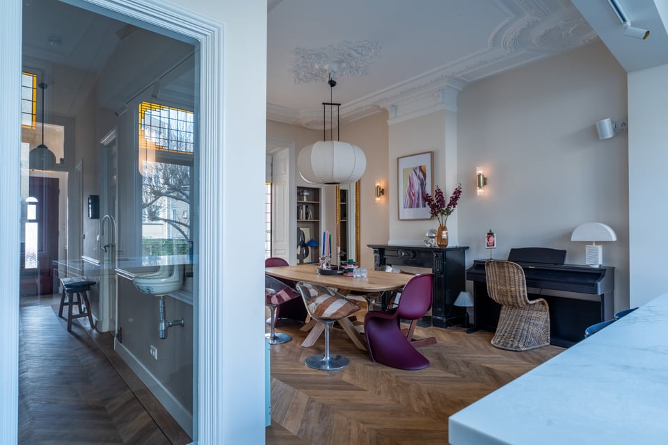 Je stapt binnen via de bel-etage en het valt je meteen op: hoge plafonds vol origineel stucwerk, en-suite deuren met glas-in-lood en een doorlopende visgraatvloer die de hele woning aan elkaar verbindt. Dit karaktervol herenhuis in Den Haag heeft een sterke basis die zich vanzelf laat fotograferen. Klassieke architectuur gecombineerd met een uitgesproken, eigentijdse inrichting.