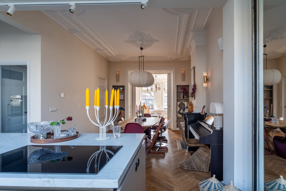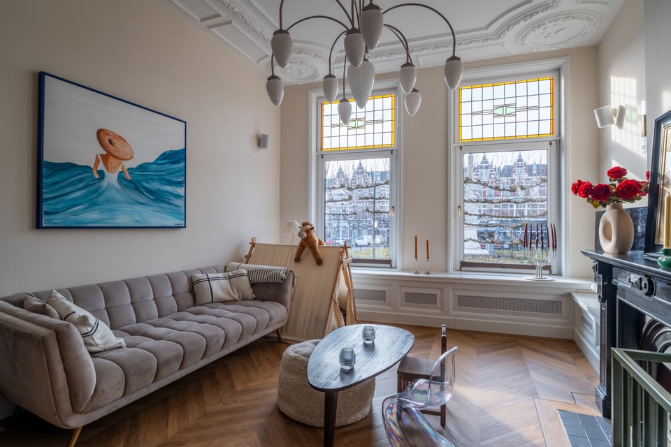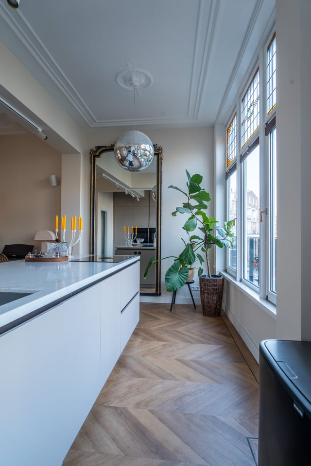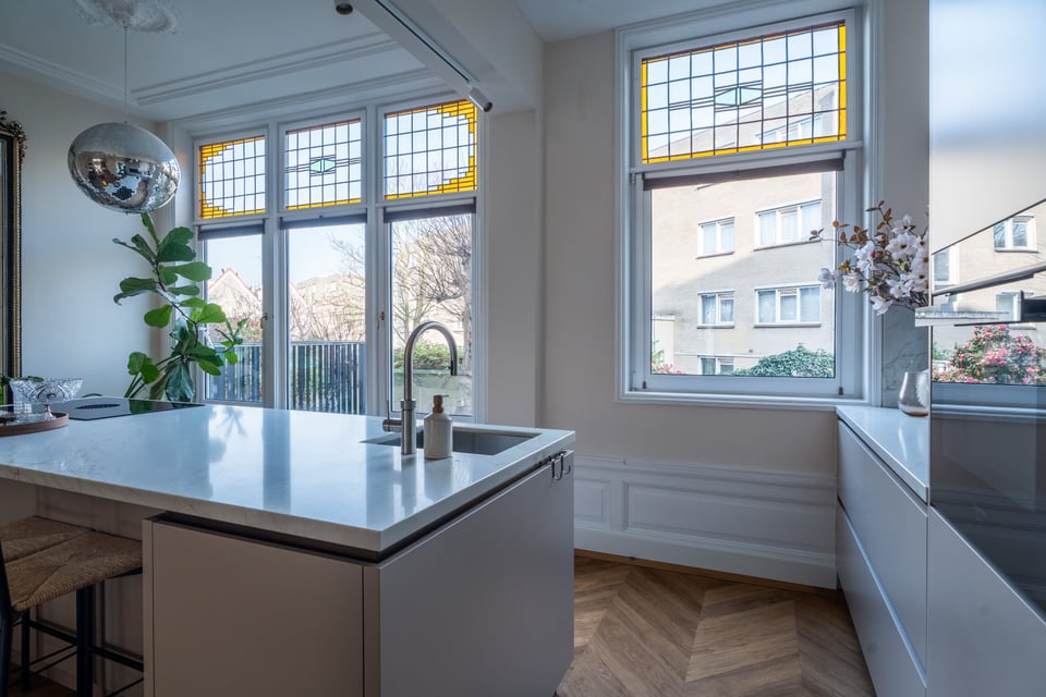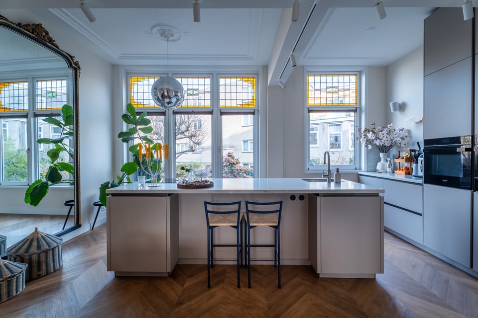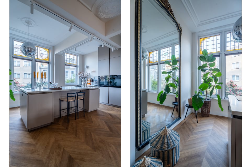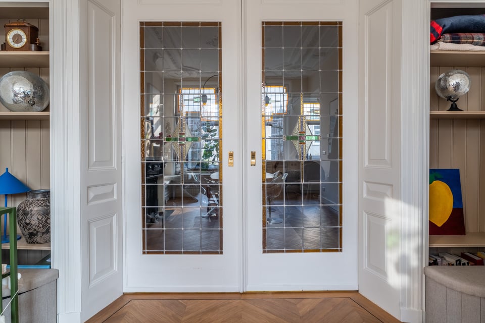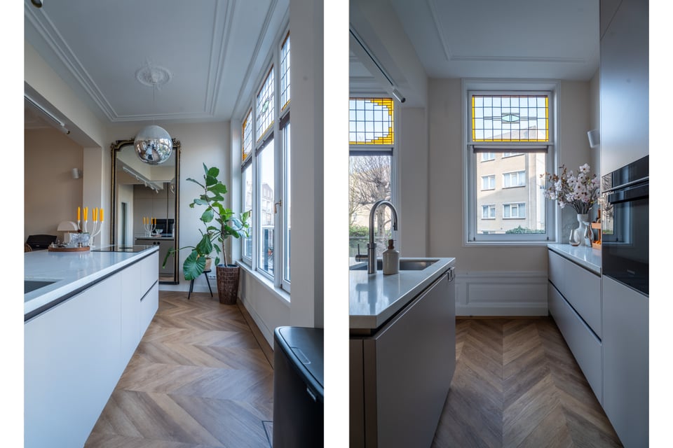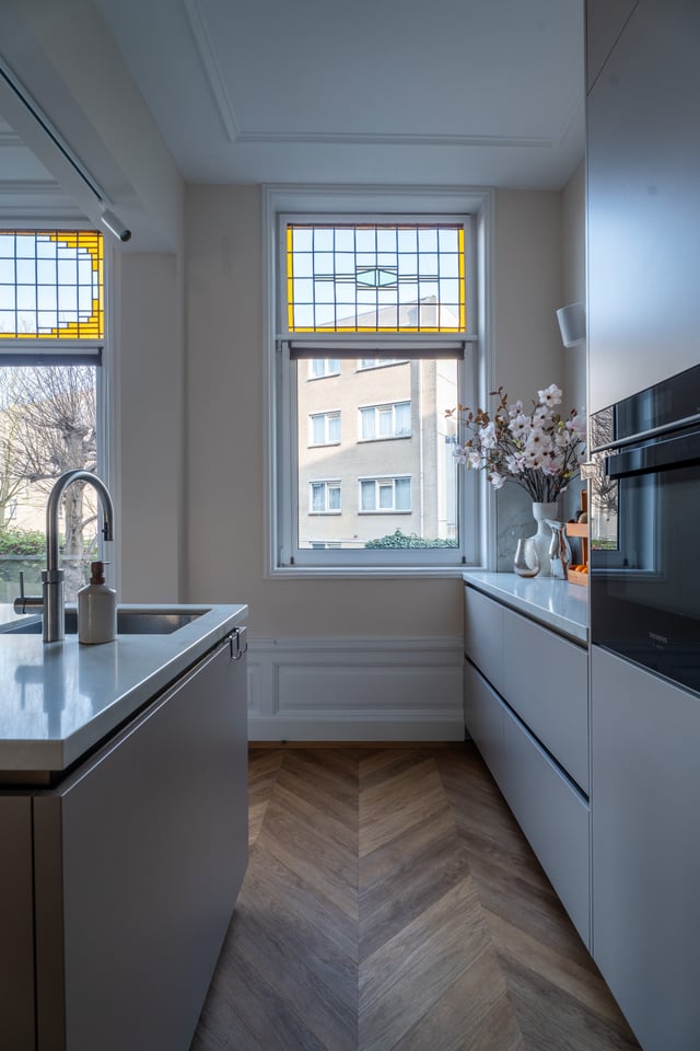 Je stapt binnen via de bel-etage en het valt je meteen op: hoge plafonds vol origineel stucwerk, en-suite deuren met glas-in-lood en een doorlopende visgraatvloer die de hele woning aan elkaar verbindt. Dit karaktervol herenhuis in Den Haag heeft een sterke basis die zich vanzelf laat fotograferen. Klassieke architectuur gecombineerd met een uitgesproken, eigentijdse inrichting.