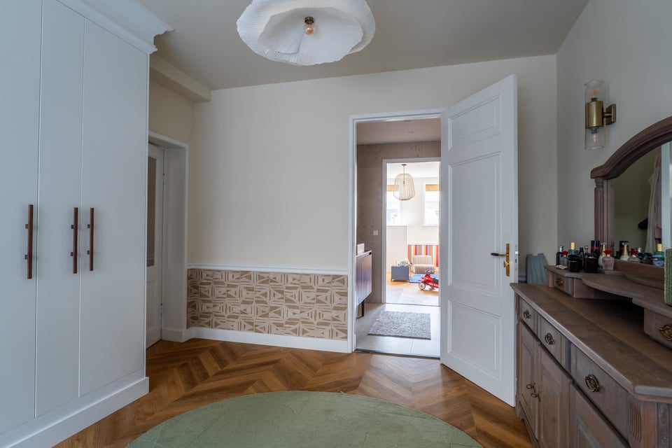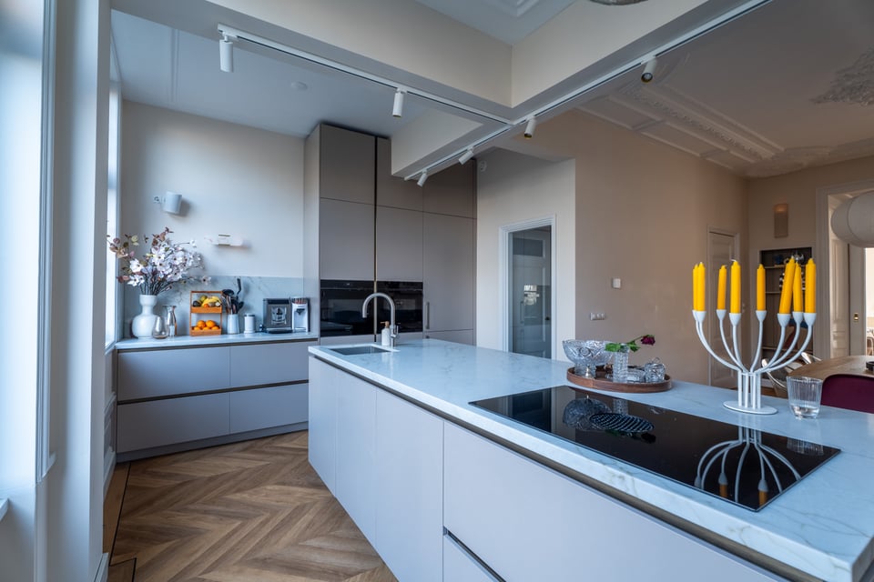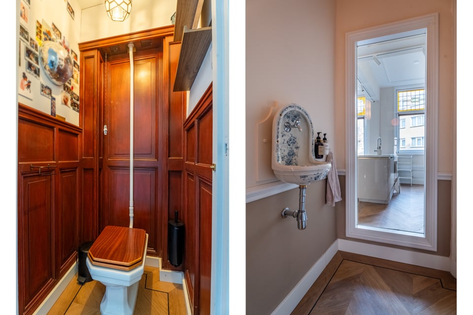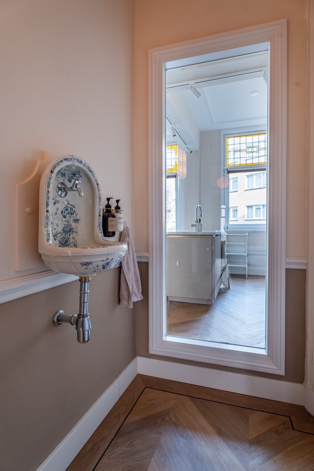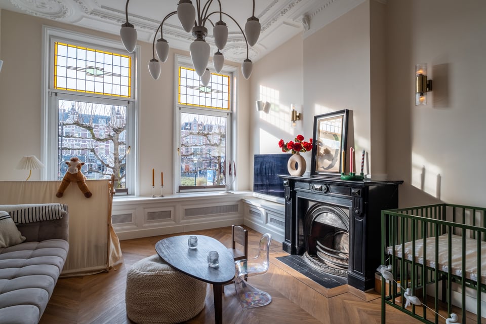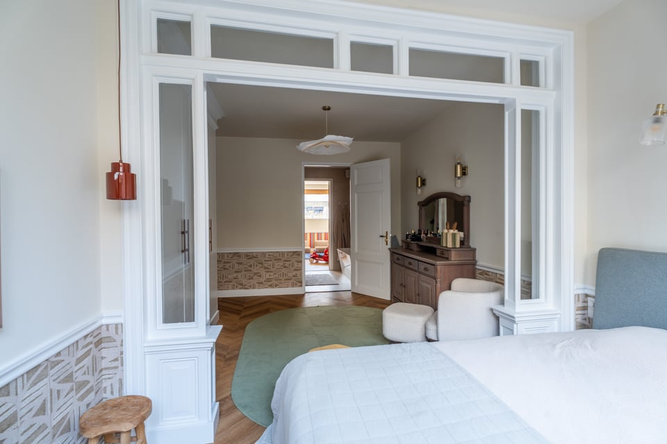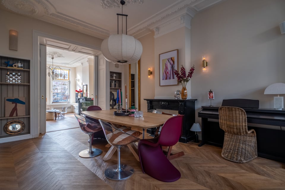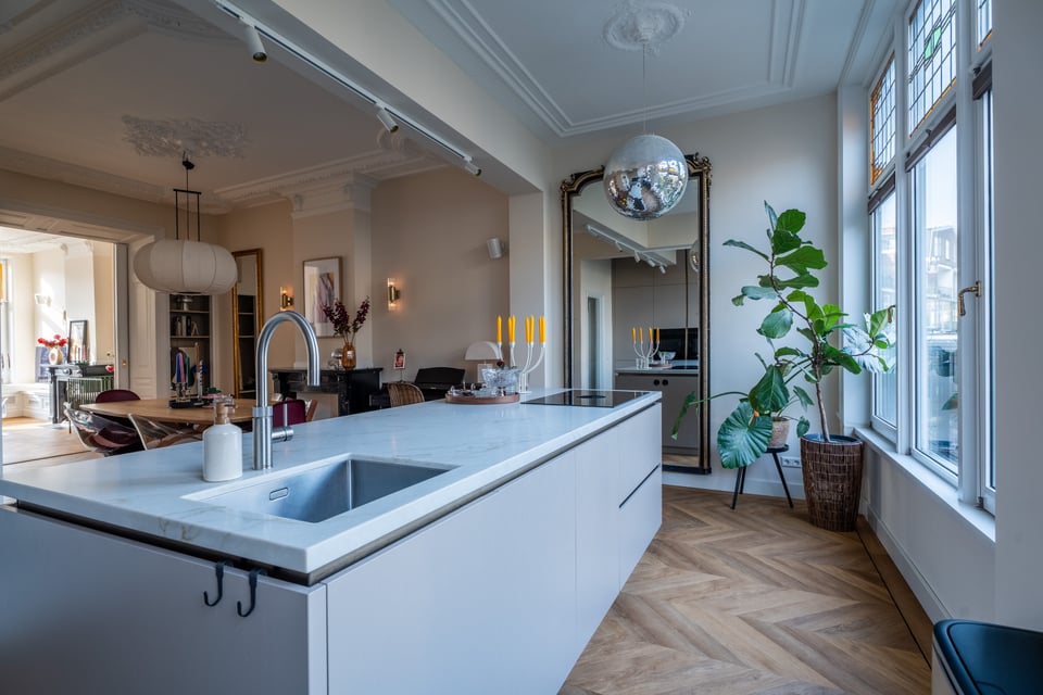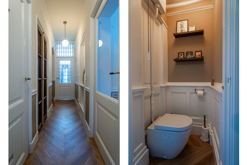 Je stapt binnen via de bel-etage en het valt je meteen op: hoge plafonds vol origineel stucwerk, en-suite deuren met glas-in-lood en een doorlopende visgraatvloer die de hele woning aan elkaar verbindt. Dit karaktervol herenhuis in Den Haag heeft een sterke basis die zich vanzelf laat fotograferen. Klassieke architectuur gecombineerd met een uitgesproken, eigentijdse inrichting.