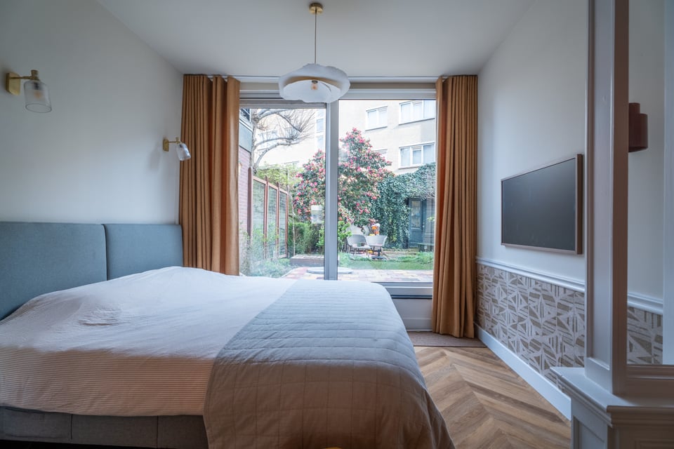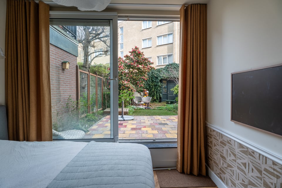 De slaapkamer is rustig en warm, met uitzicht op de groene achtertuin. Grote raampartijen laten het buitenleven naar binnen komen, ideaal voor lifestyle shoots waarbij je die mix van binnen en buiten wil vangen.