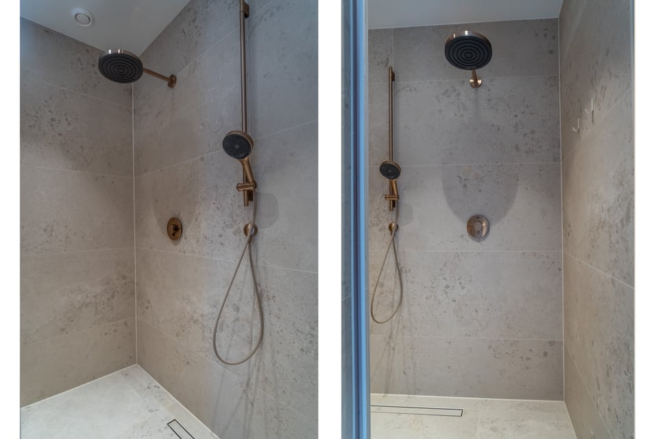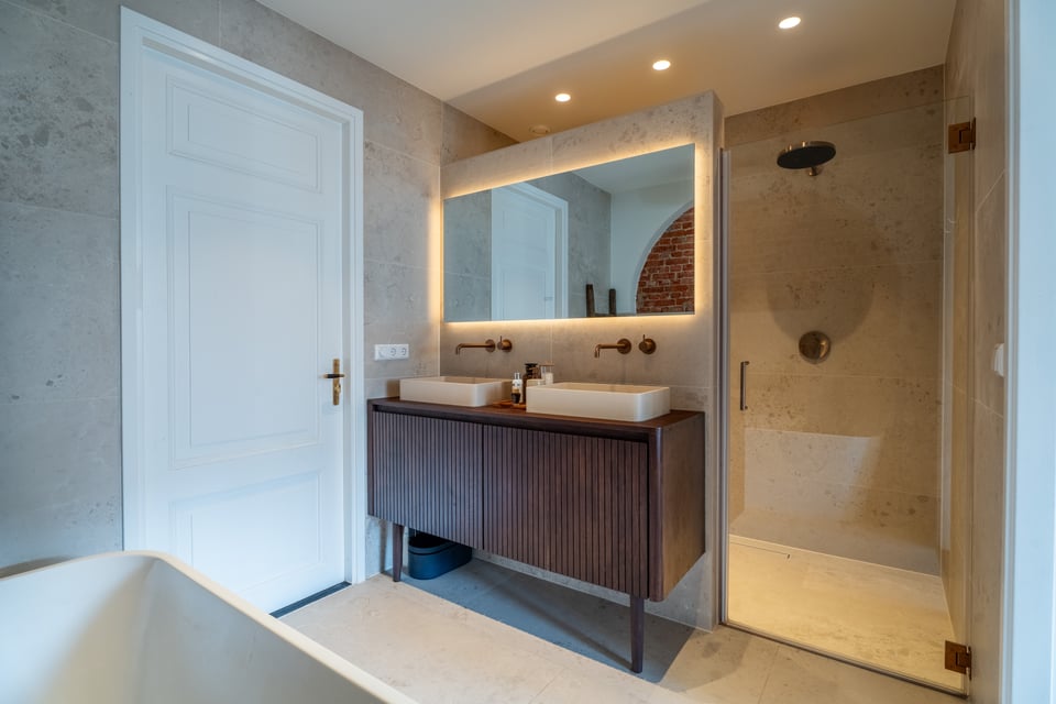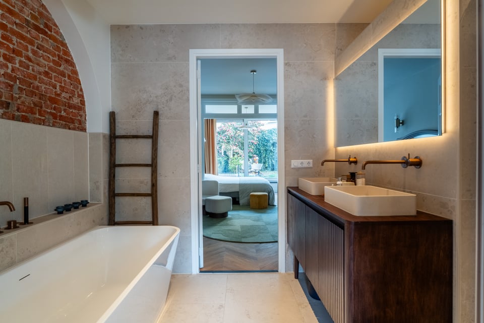 De leefruimte loopt via de en-suite deuren naadloos van zitkamer naar eetkamer naar keuken. In de eetkamer staat een grote houten tafel omringd door een mix van designstoelen. De sculpturale hanglamp erboven maakt het plaatje compleet. Reflecties van glas en spiegels zorgen voor extra dynamiek in beeld. De keuken is strak en minimalistisch met een ruim kookeiland en een natuurstenen blad, maar voelt door het materiaalgebruik en de styling allesbehalve kil. Grote ramen aan zowel de voor- als achterzijde zorgen de hele dag voor mooi, wisselend daglicht.