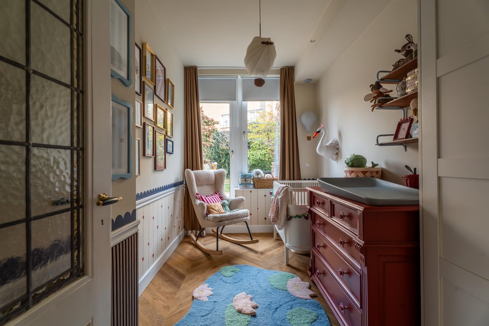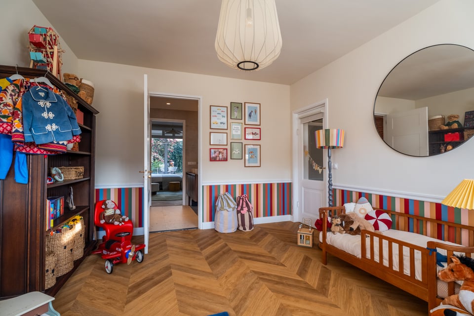 Wat deze locatie echt onderscheidt zijn de kinderkamers. Geen standaard pastelkleurtjes, maar ruimtes met karakter: kleurrijke gestreepte lambrisering, een speelkeuken, een donkere houten boekenkast vol speelgoed en een babykamer met handgeschilderde details en glas-in-lood deur. Voor shoots waarbij je een speelse, authentieke kinderomgeving nodig hebt, is dit een absolute topper.