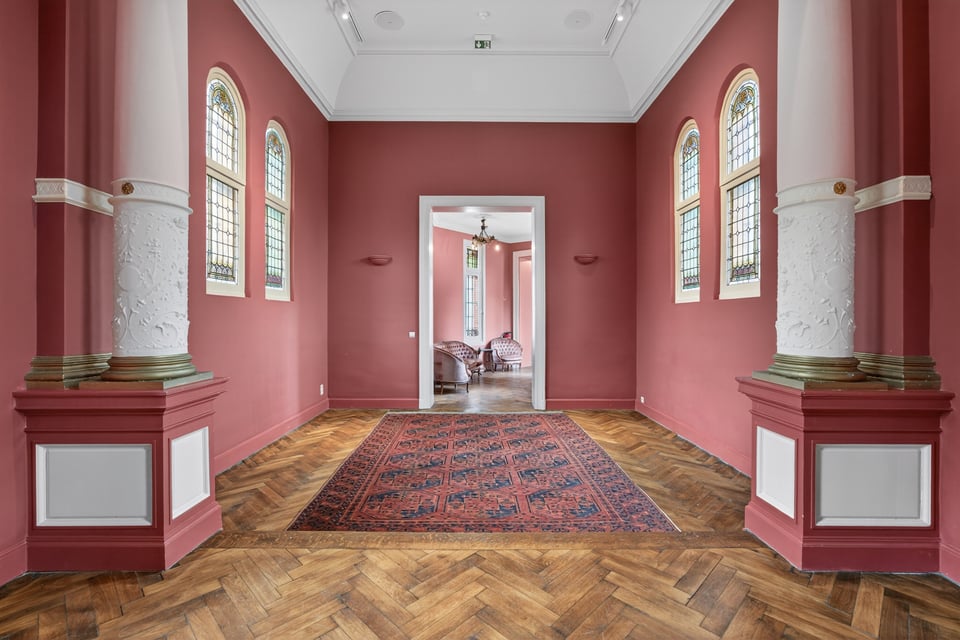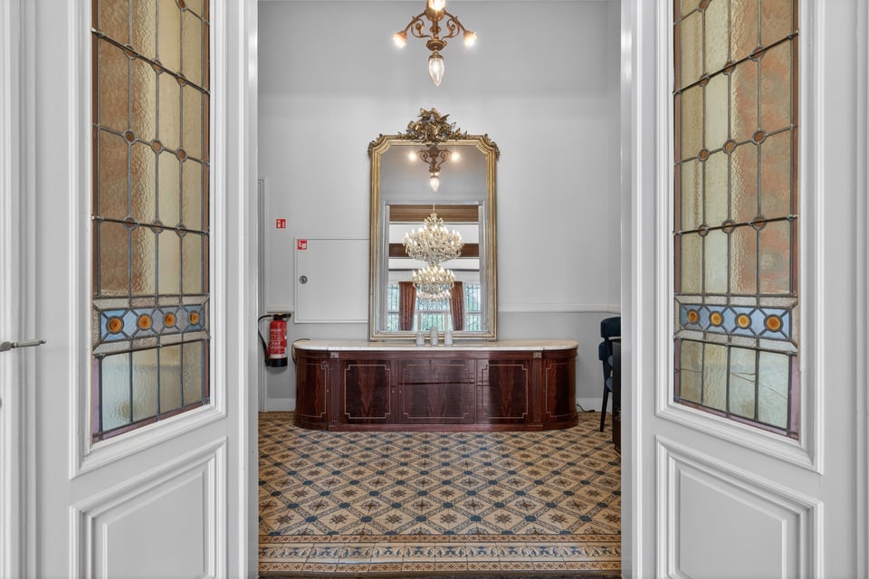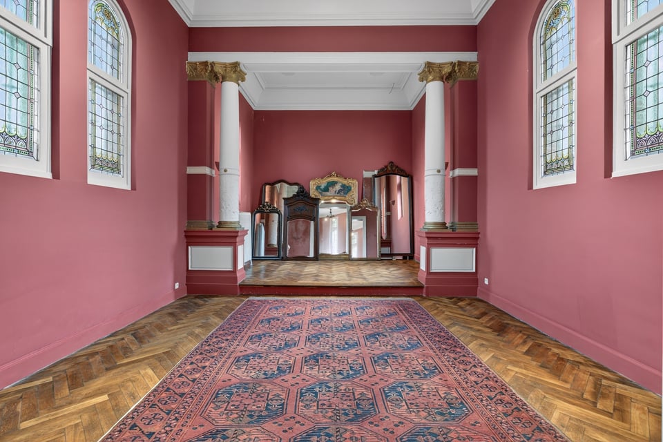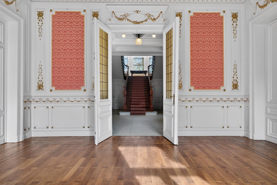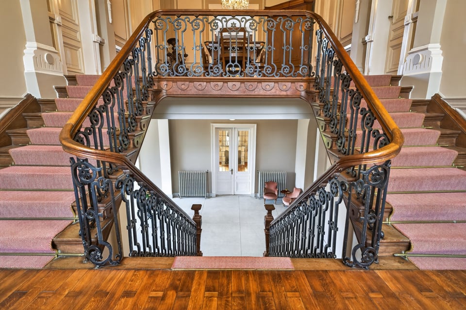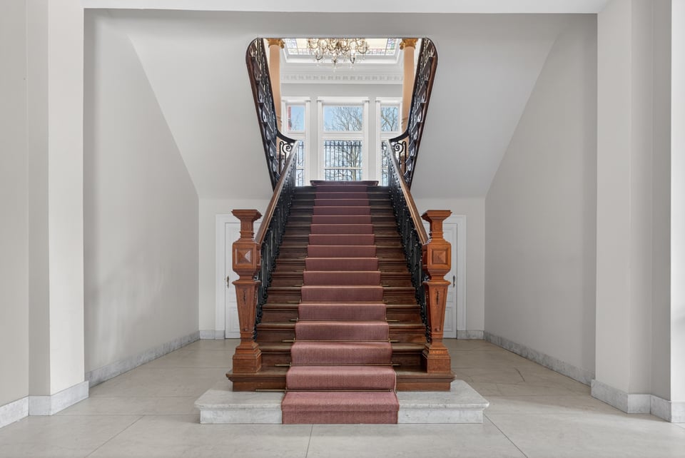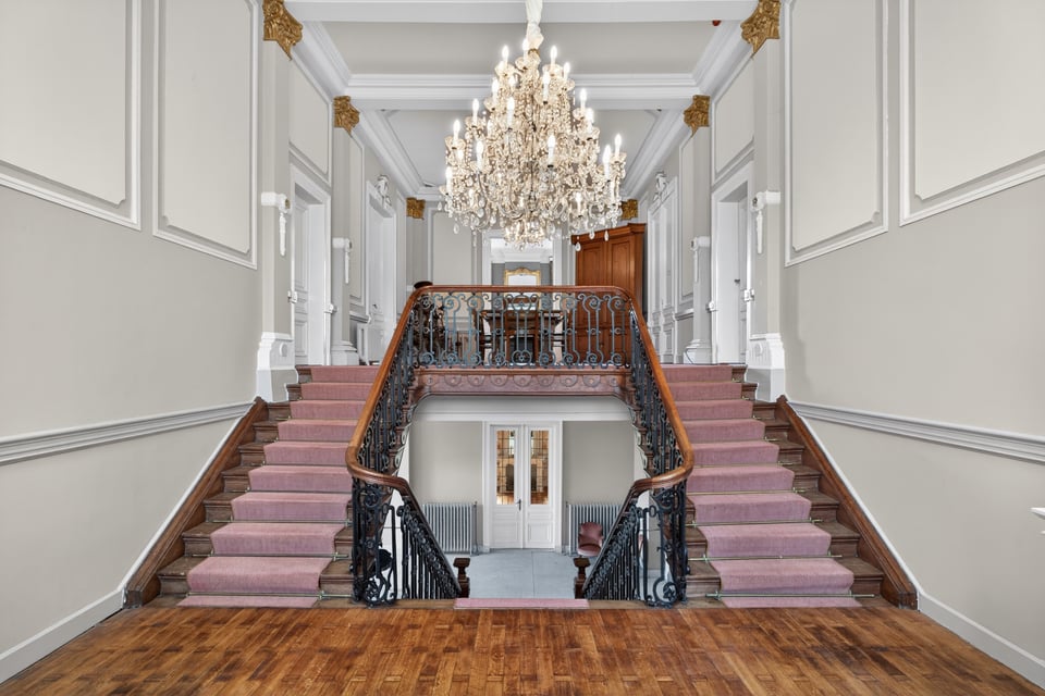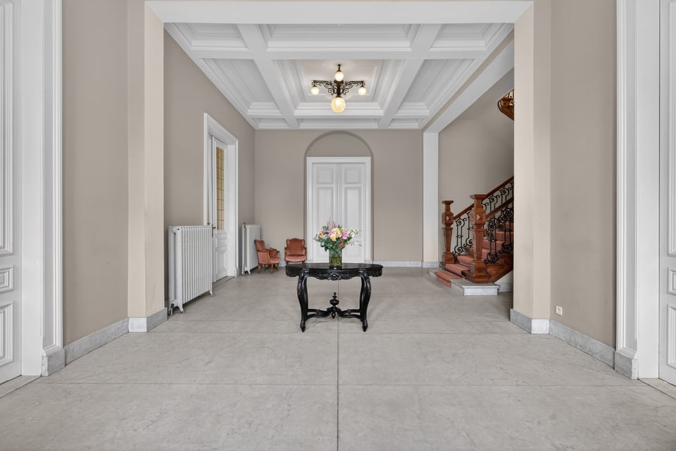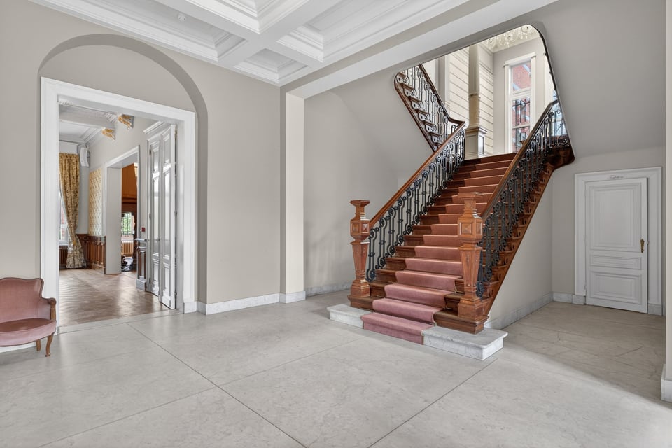 Binnen kom je aan in een monumentale inkomhal met originele witmarmeren vloeren. Hoge ramen laten overdag rijk natuurlijk licht naar binnen komen. De traphal, het stucwerk en de historische details geven je direct dat “old money grandeur” gevoel waar je de hele productie op kunt bouwen.