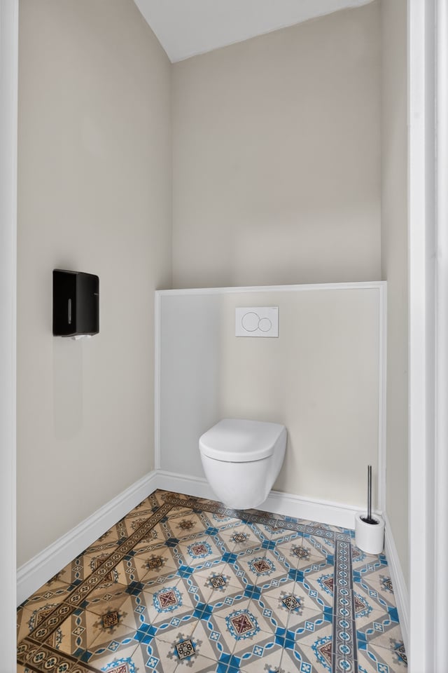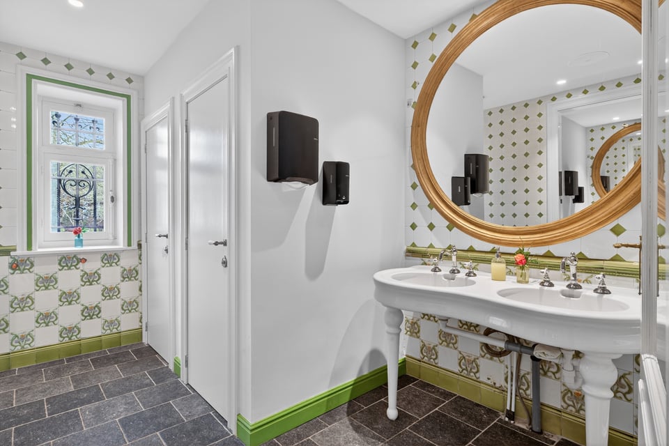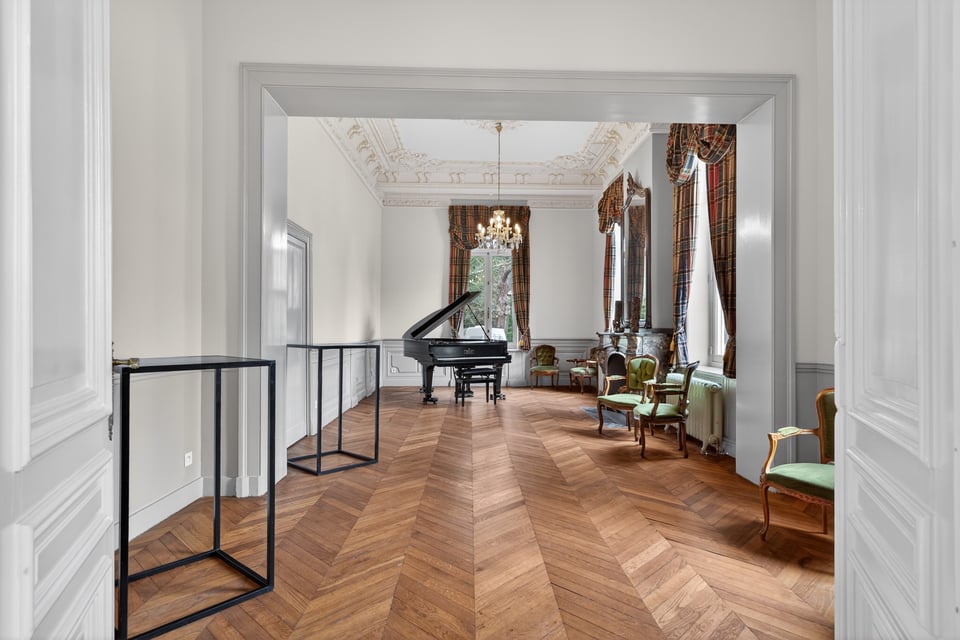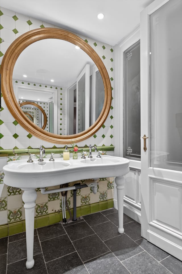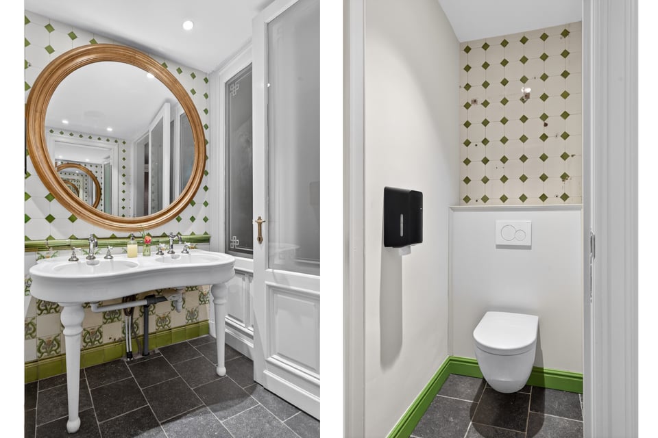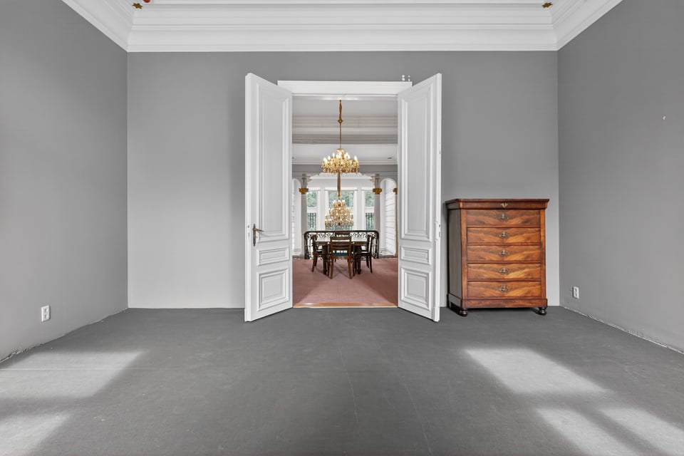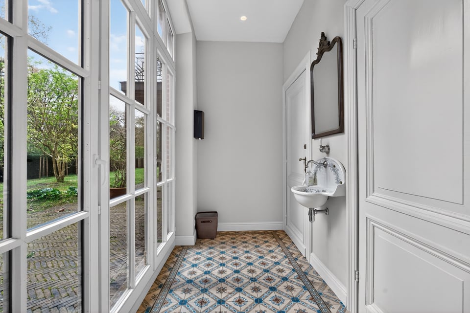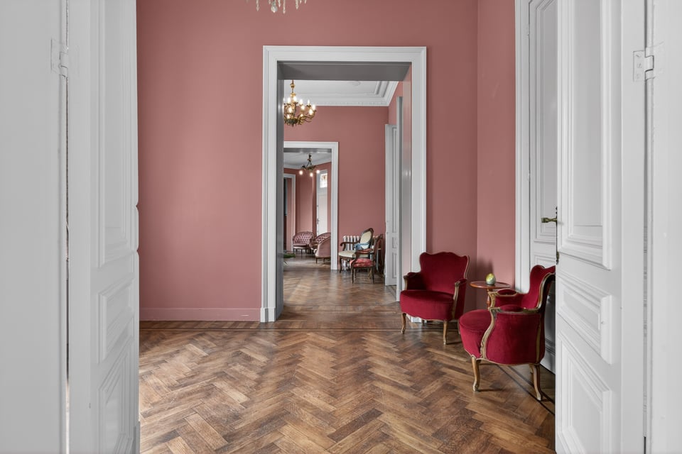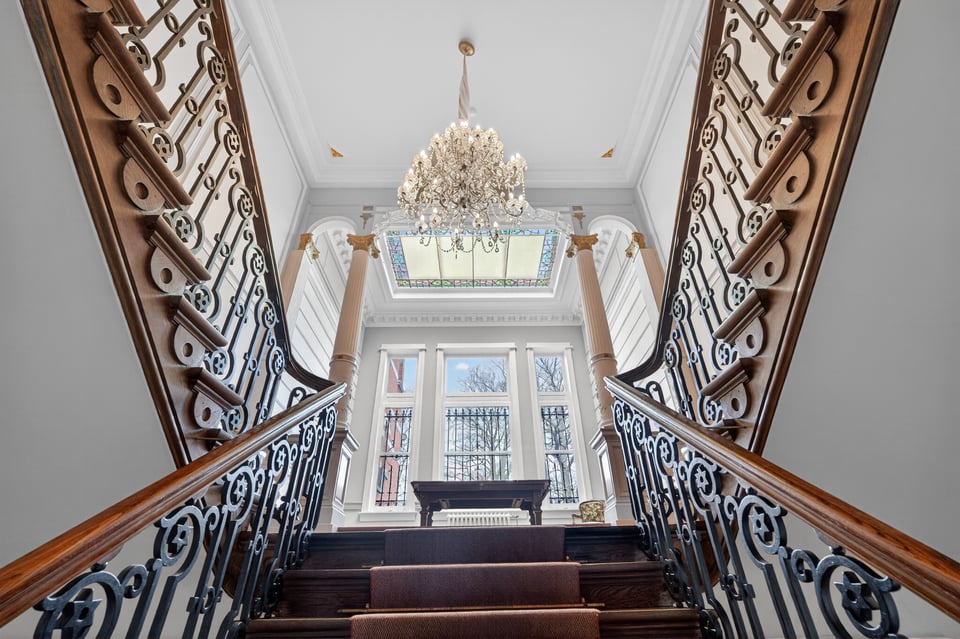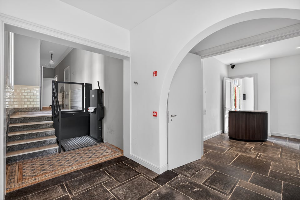 Binnen kom je aan in een monumentale inkomhal met originele witmarmeren vloeren. Hoge ramen laten overdag rijk natuurlijk licht naar binnen komen. De traphal, het stucwerk en de historische details geven je direct dat “old money grandeur” gevoel waar je de hele productie op kunt bouwen.