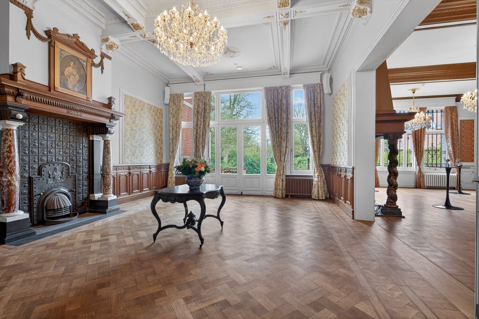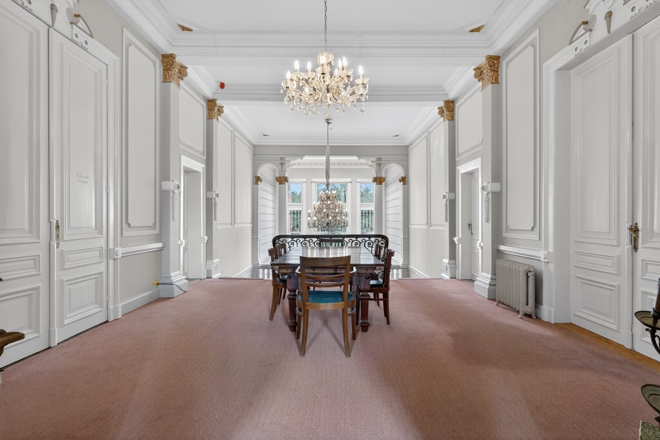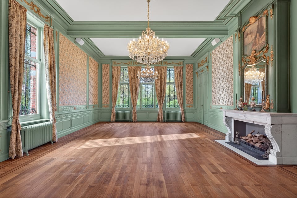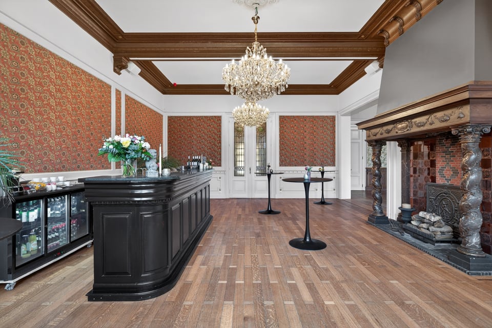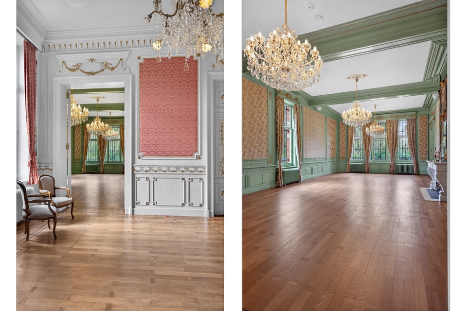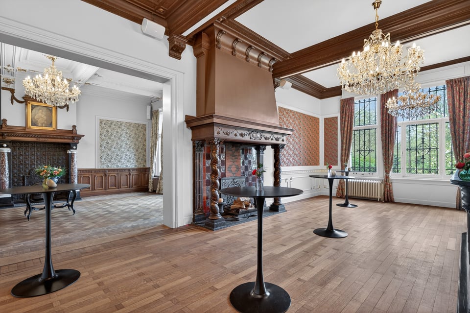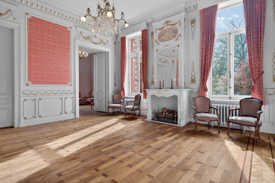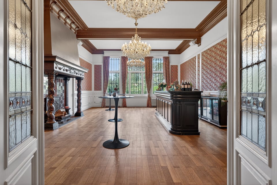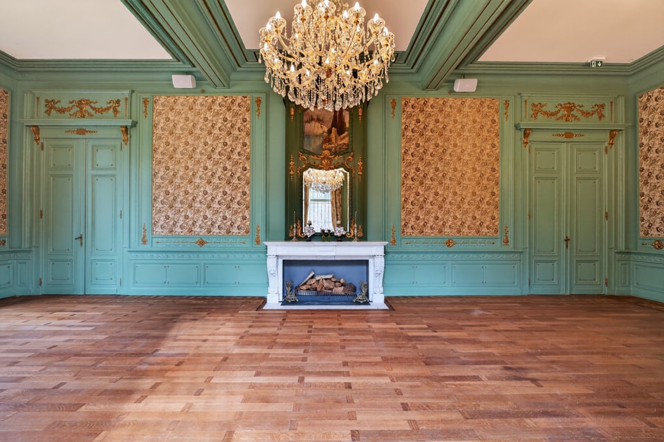 Het kasteel beschikt over meerdere kasteelzalen met hoge stucplafonds en weelderige kroonluchters. Donker hout, historische wandbekleding en authentieke schoorstenen, elke zaal heeft zijn eigen sfeer maar alles ademt dezelfde tijdloze uitstraling. Zaal Mercurius meet 80m², zaal Saturnus 66m². Breed genoeg voor grote productieopstellingen, rijk genoeg om zonder extra styling direct te schieten.