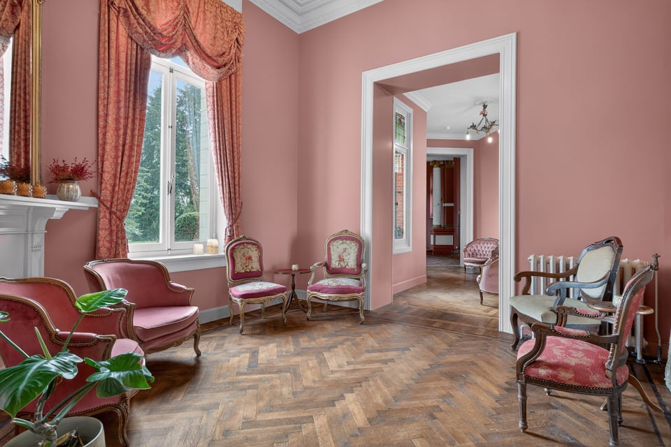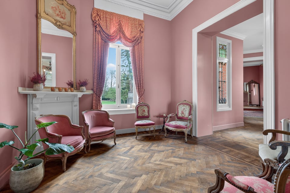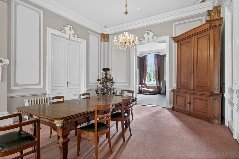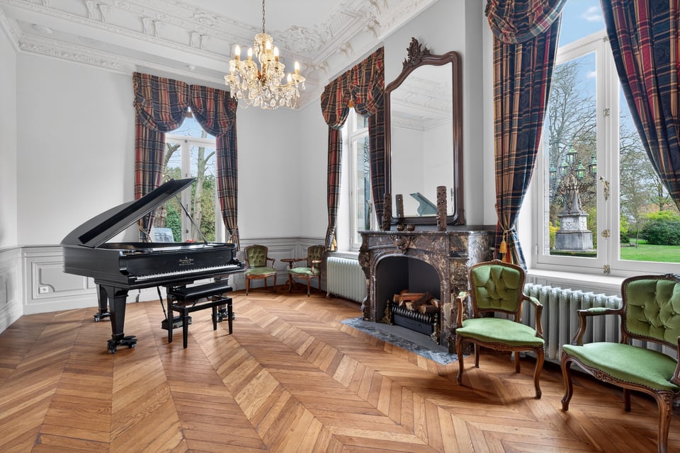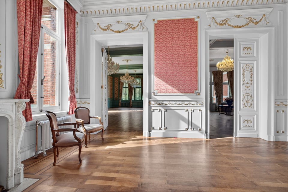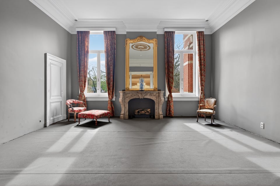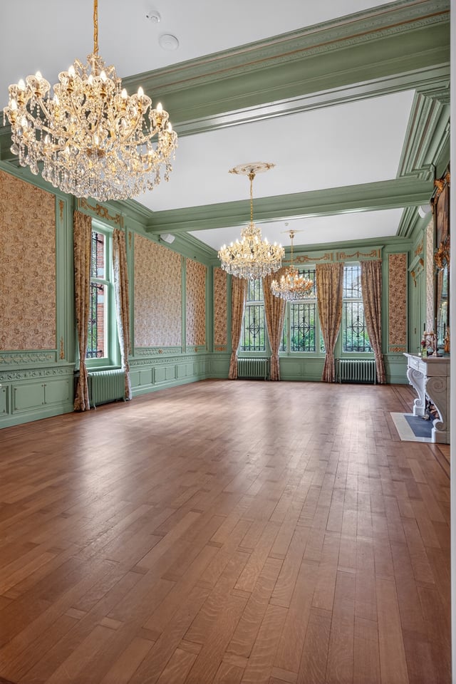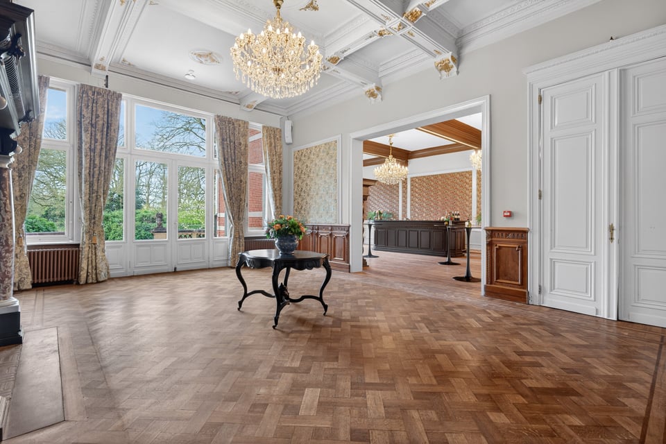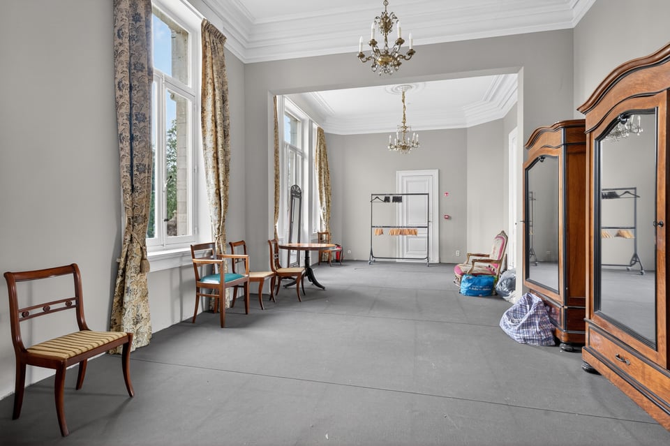 Het kasteel beschikt over meerdere kasteelzalen met hoge stucplafonds en weelderige kroonluchters. Donker hout, historische wandbekleding en authentieke schoorstenen, elke zaal heeft zijn eigen sfeer maar alles ademt dezelfde tijdloze uitstraling. Zaal Mercurius meet 80m², zaal Saturnus 66m². Breed genoeg voor grote productieopstellingen, rijk genoeg om zonder extra styling direct te schieten.