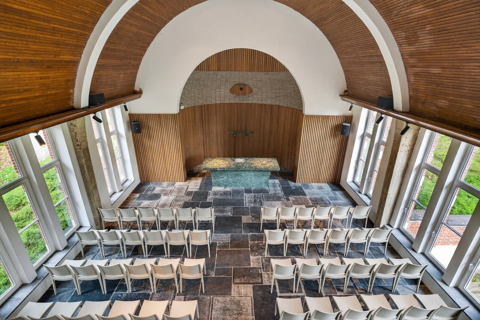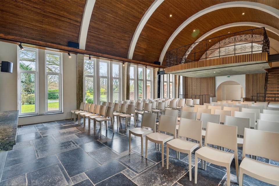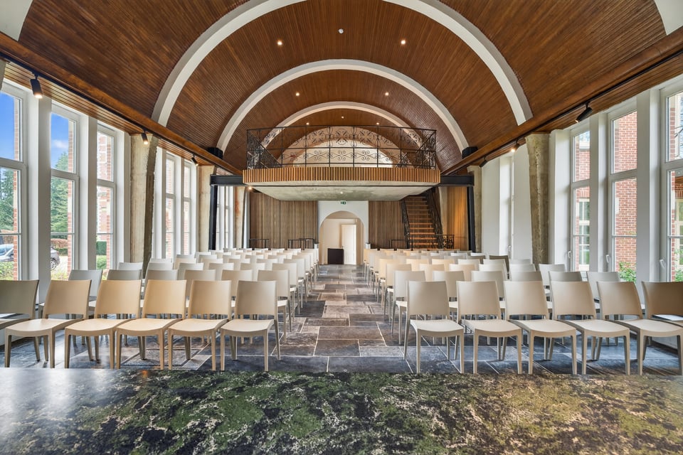 De voormalige kloosterkapel is 141m² en heeft een religieuze architectuur met gewelven en een bijzondere akoestiek. Grote ramen aan weerszijden, een strakke moderne altaaropstelling en een balkon met uitzicht over de volledige ruimte. Voor brand shoots, mode, editorial of parfumfotografie waarbij je iets zoekt dat niemand anders heeft, dit is het.