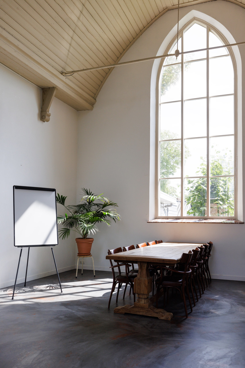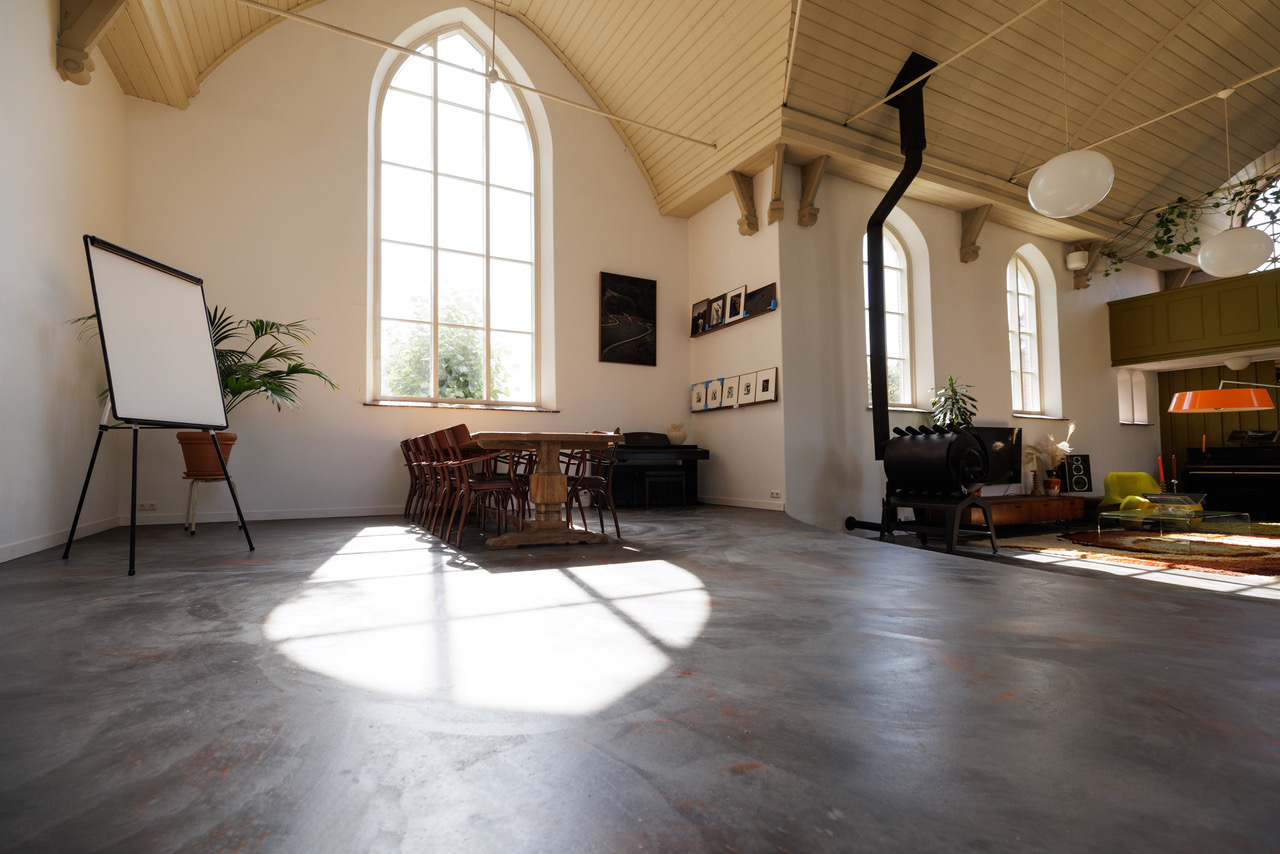 Wat hier direct opvalt: die enorme kerkramen die van de grond tot bijna het plafond lopen. Door de witte muren en het lichte houten plafond kaatst dat daglicht de hele ruimte in. Perfect voor shoots die natuurlijk licht nodig hebben zonder harde schaduwen.
