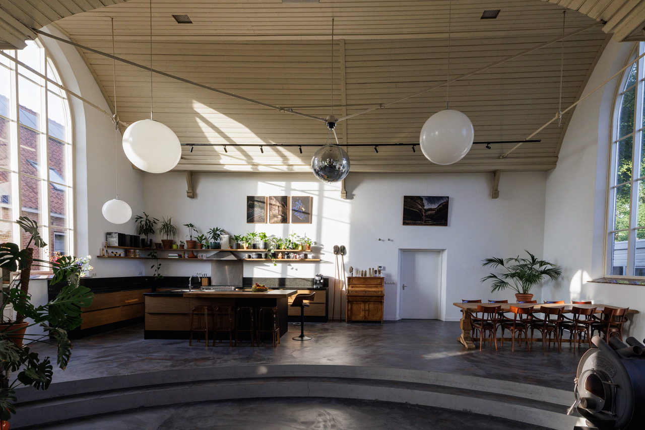Die hoge ramen zitten hier ook, dus je hebt licht van meerdere kanten. Op de open planken staan kruiden, kookspullen, mokken. Er staat een espressomachine én een bonenmaler, dus de crew kan tussen de shots door gewoon goede koffie maken. En voor food shoots? Je hebt hier alles wat je nodig hebt: werkruimte, licht, en een setting die fotogeniek is zonder te geënsceneerd aan te voelen.