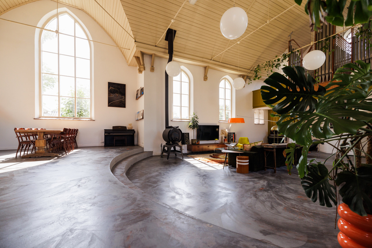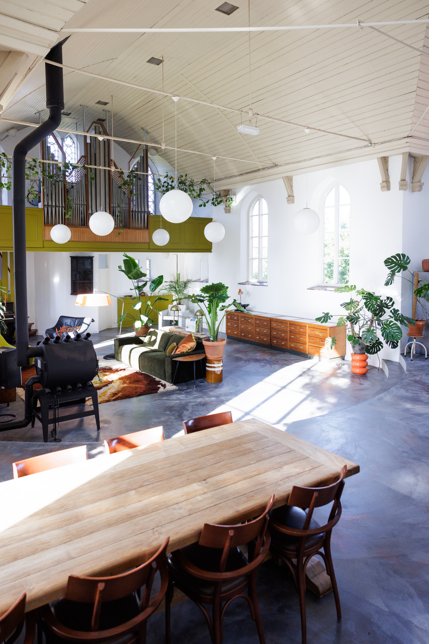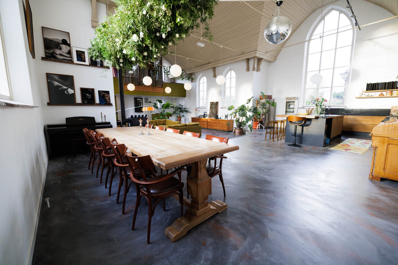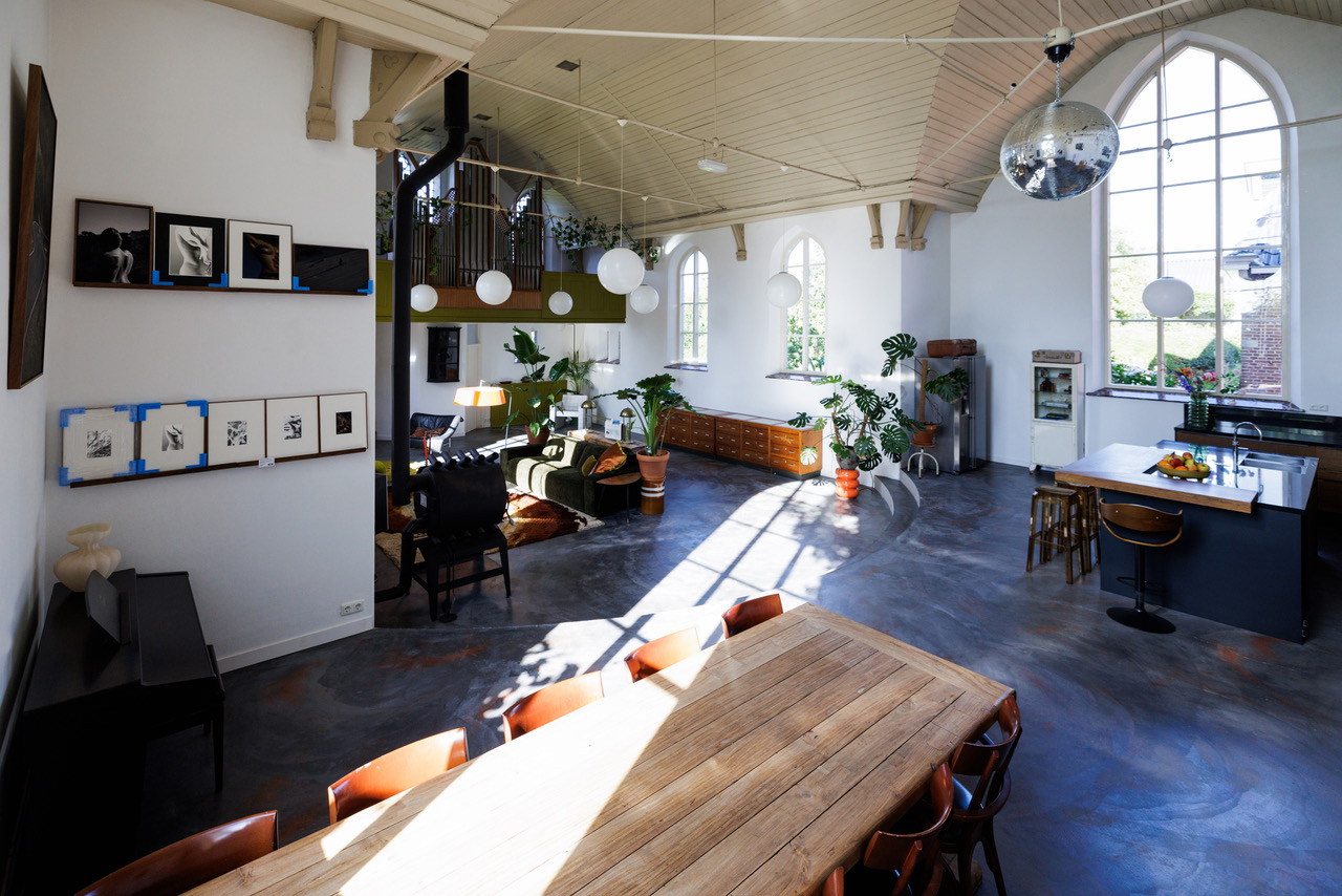 Deze kerk shootlocatie uit 1877 is omgebouwd tot een open woonruimte van 160m² met plafonds van 7 meter hoog. Die ramen, 5 meter hoge klassieke kerkramen met hun ronde bovenkant die de hele dag zacht daglicht naar binnen halen. Het gebouw heeft z’n karakter behouden, maar van binnen is alles gemoderniseerd en ingericht met een mix van vintage meubels, veel groen en speelse kleuraccenten.