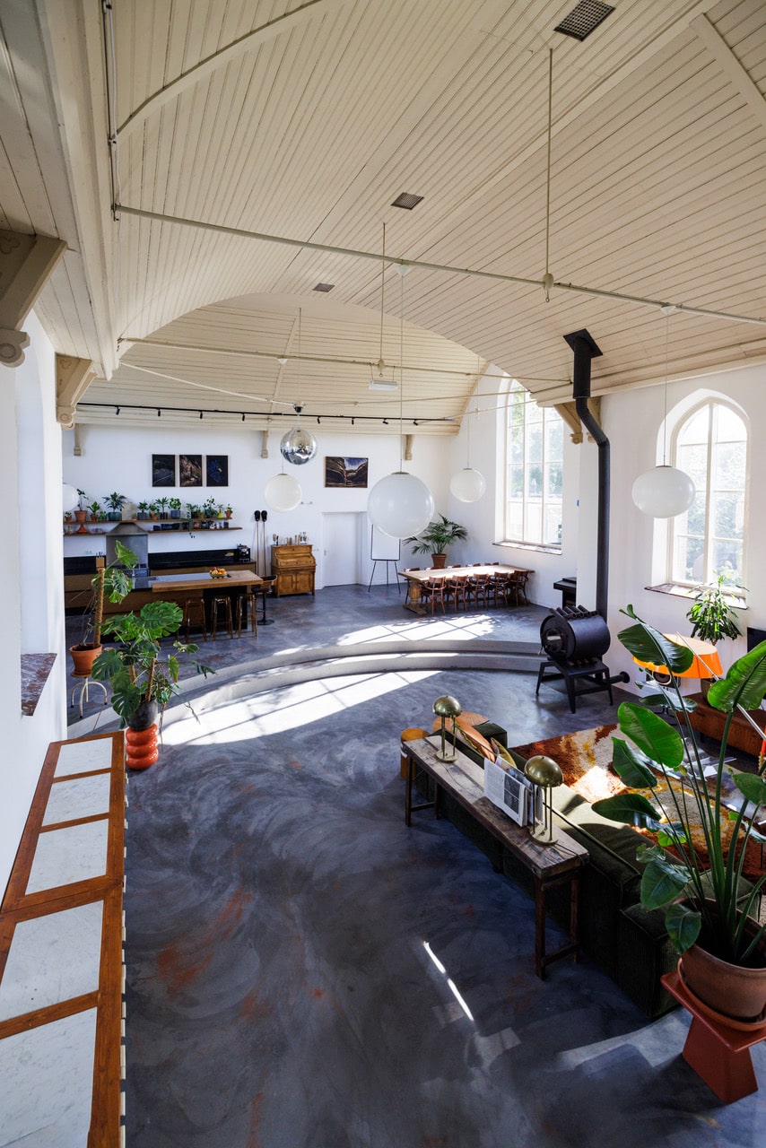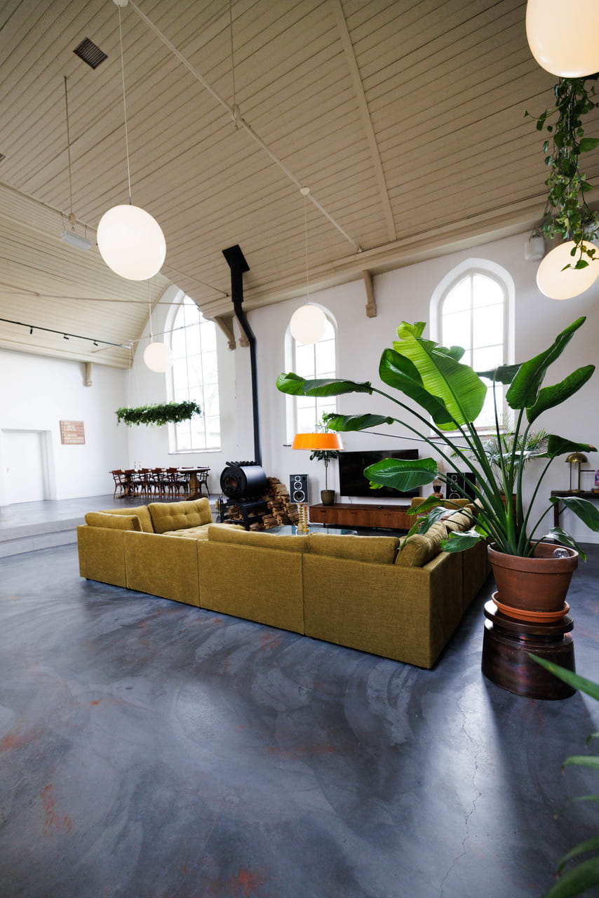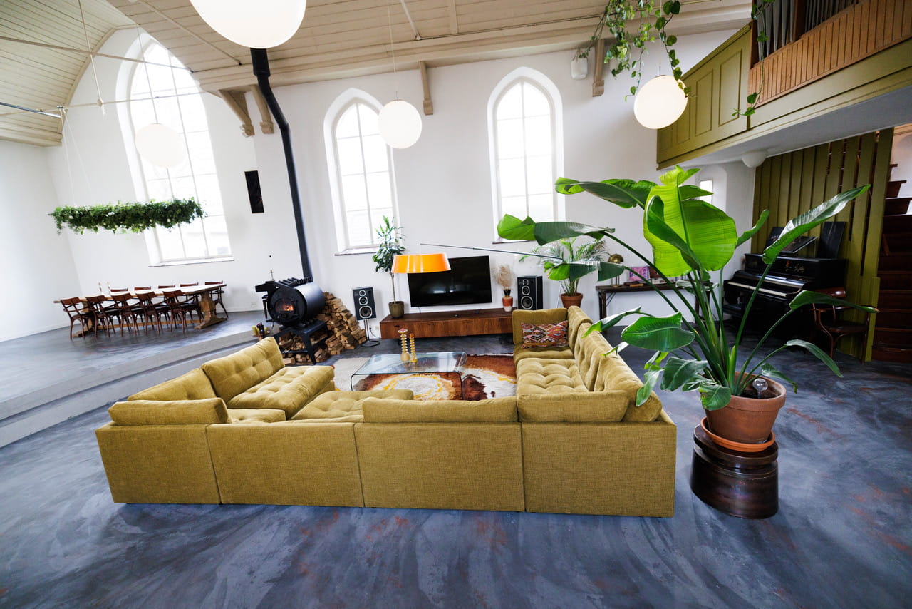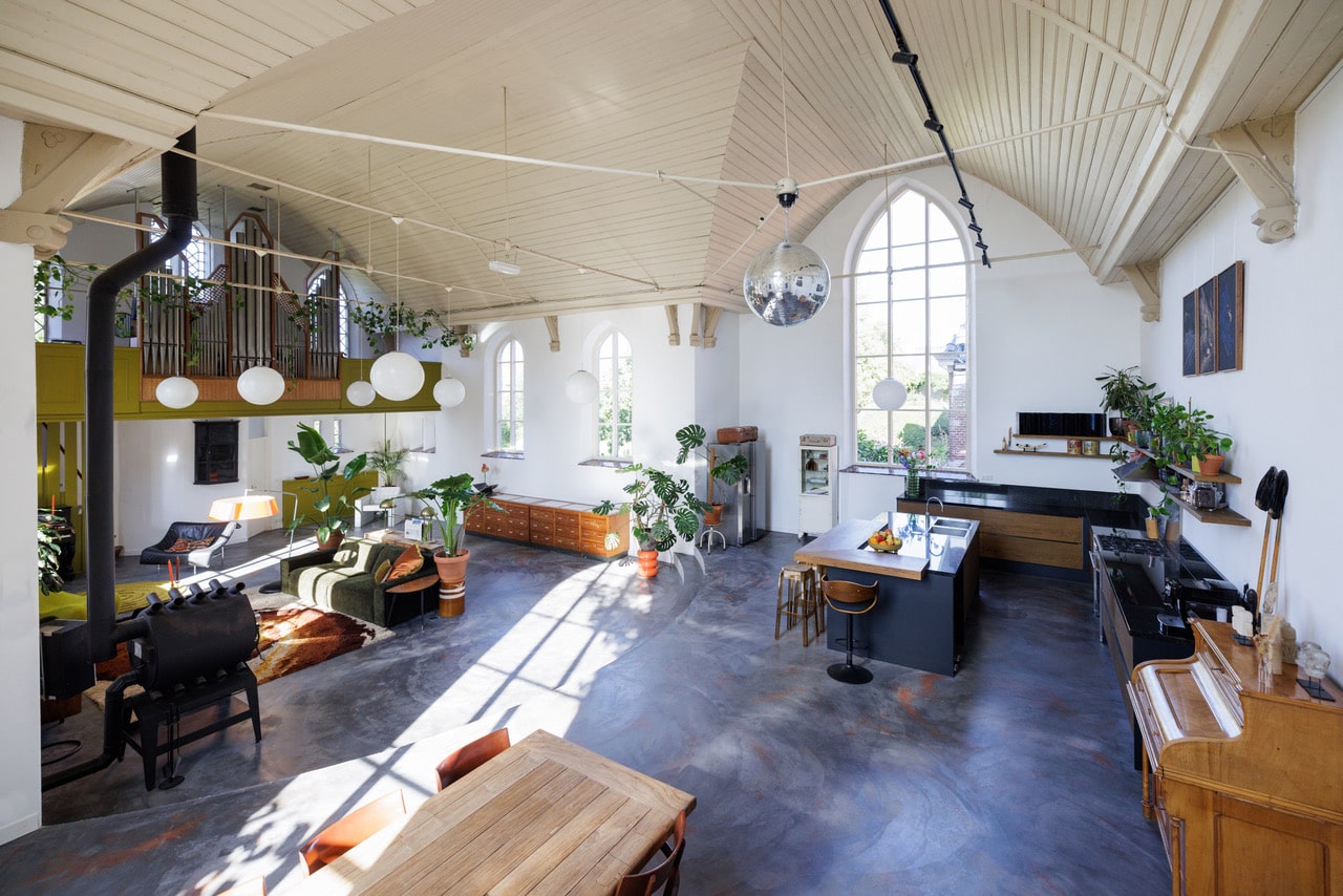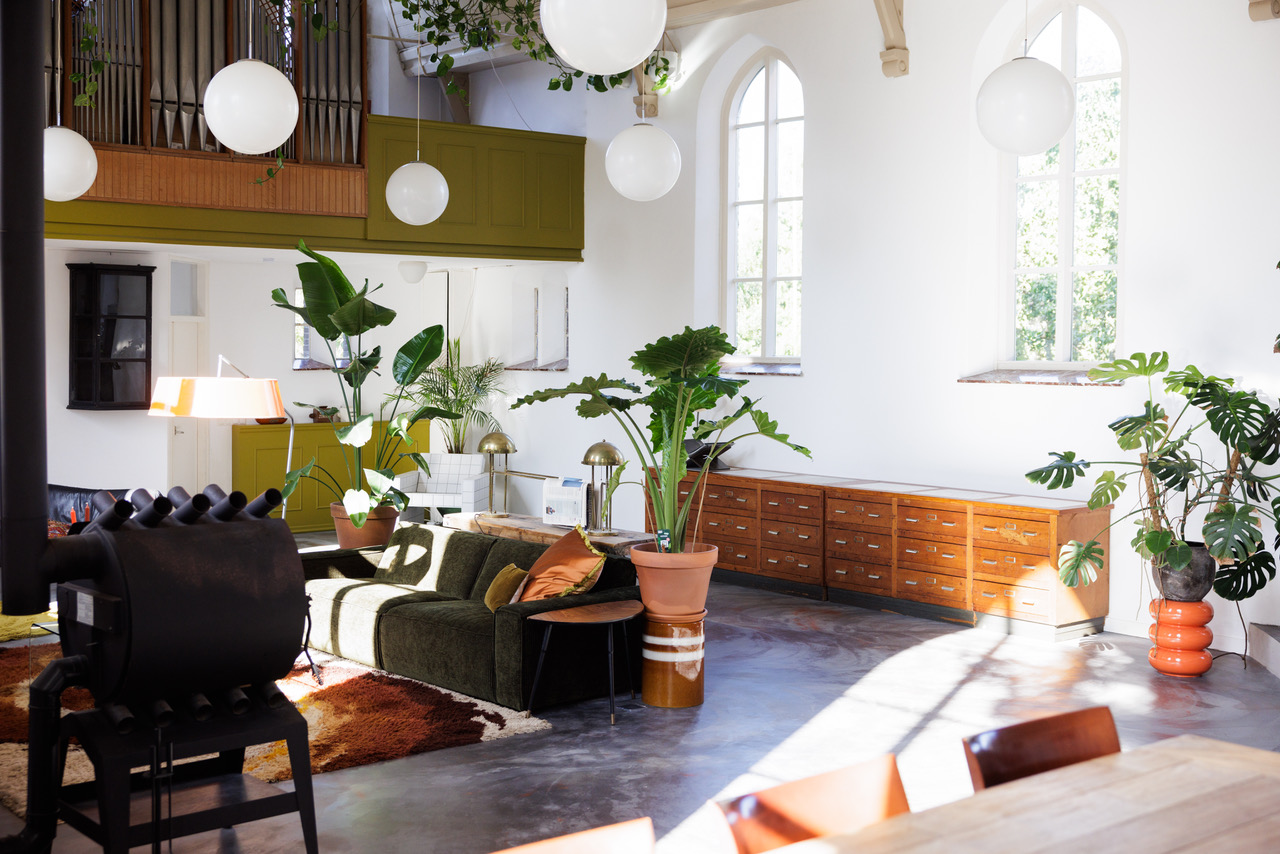 Deze kerk shootlocatie uit 1877 is omgebouwd tot een open woonruimte van 160m² met plafonds van 7 meter hoog. Die ramen, 5 meter hoge klassieke kerkramen met hun ronde bovenkant die de hele dag zacht daglicht naar binnen halen. Het gebouw heeft z’n karakter behouden, maar van binnen is alles gemoderniseerd en ingericht met een mix van vintage meubels, veel groen en speelse kleuraccenten.