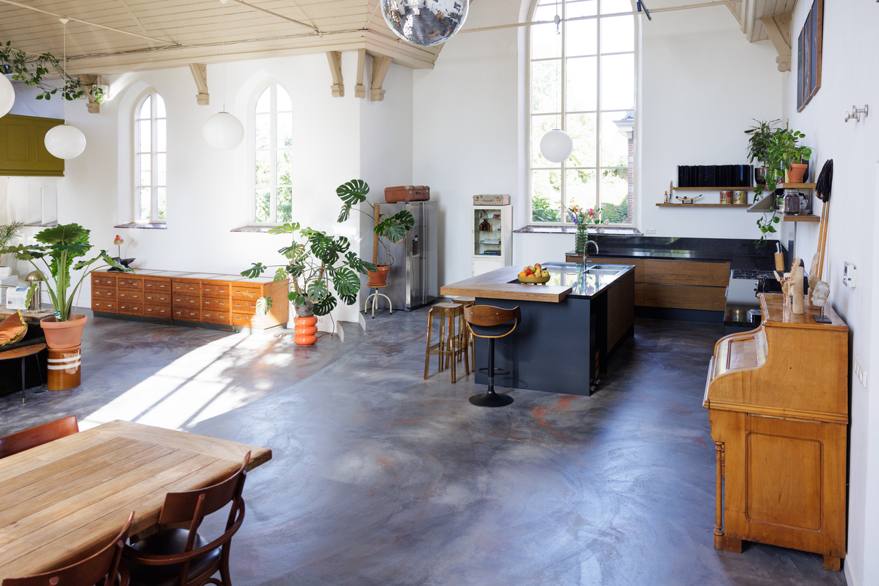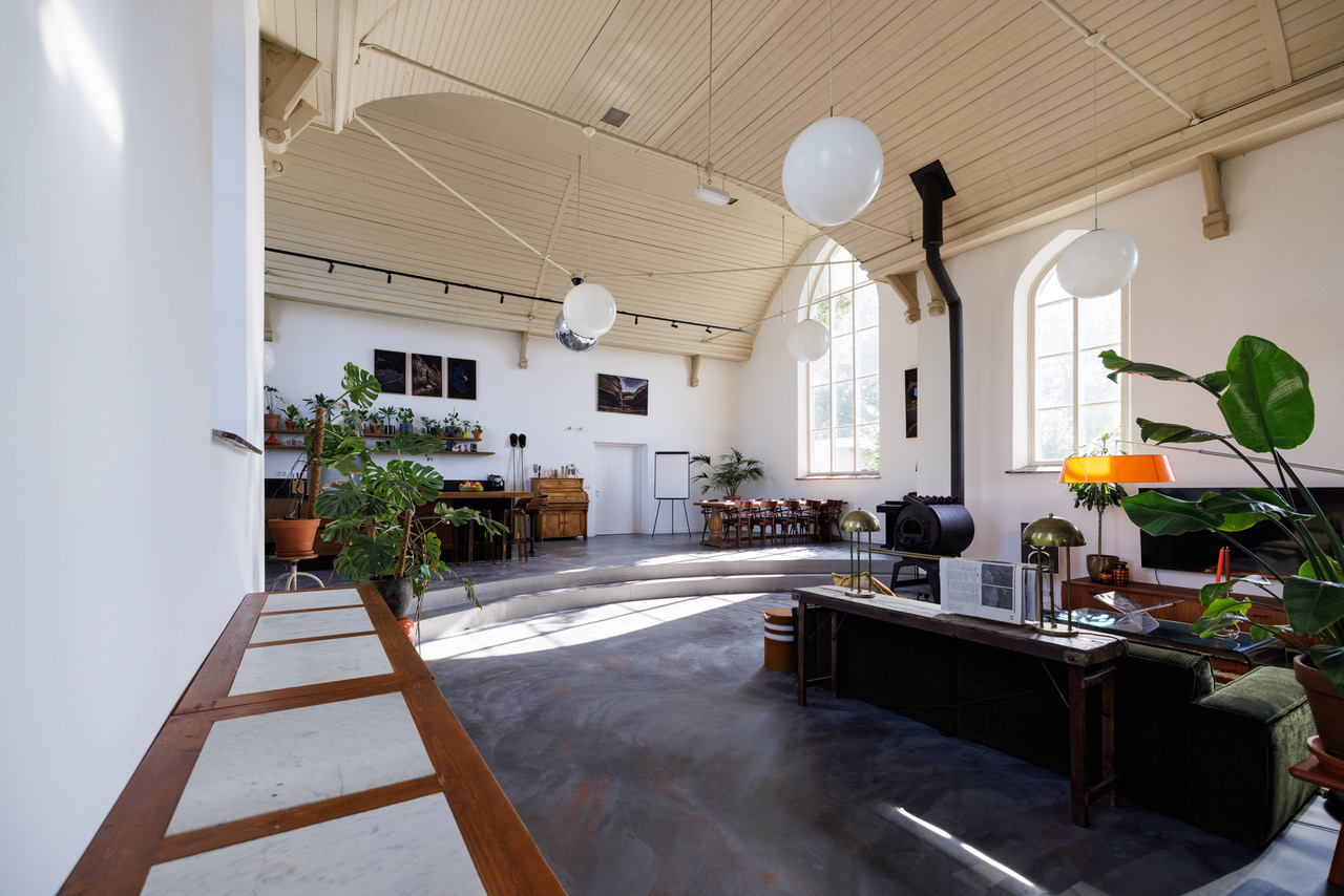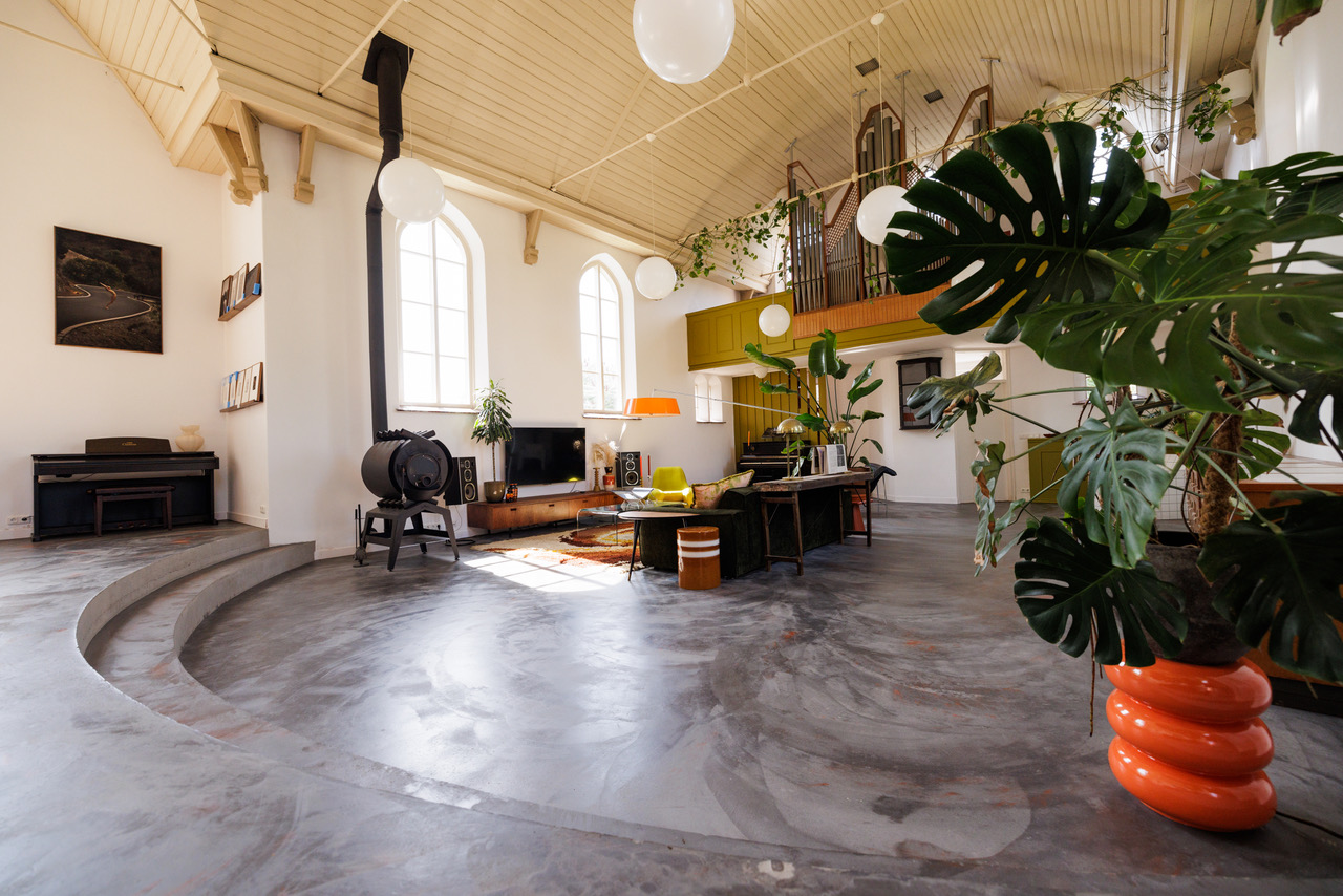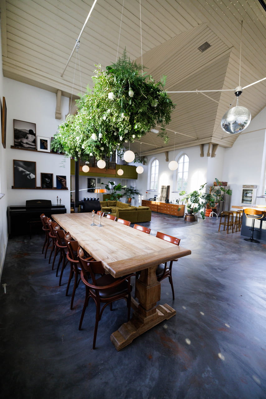Deze kerk shootlocatie uit 1877 is omgebouwd tot een open woonruimte van 160m² met plafonds van 7 meter hoog. Die ramen, 5 meter hoge klassieke kerkramen met hun ronde bovenkant die de hele dag zacht daglicht naar binnen halen. Het gebouw heeft z’n karakter behouden, maar van binnen is alles gemoderniseerd en ingericht met een mix van vintage meubels, veel groen en speelse kleuraccenten.