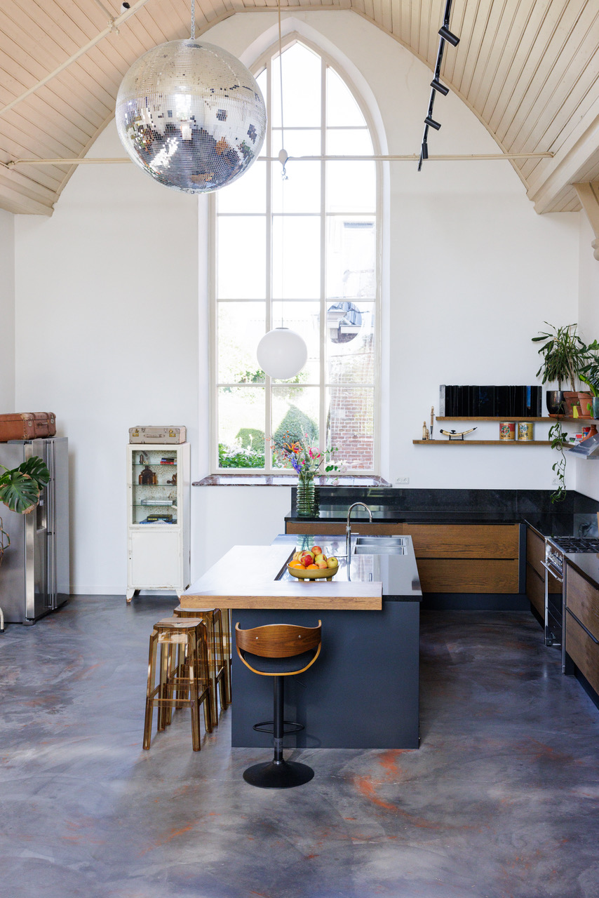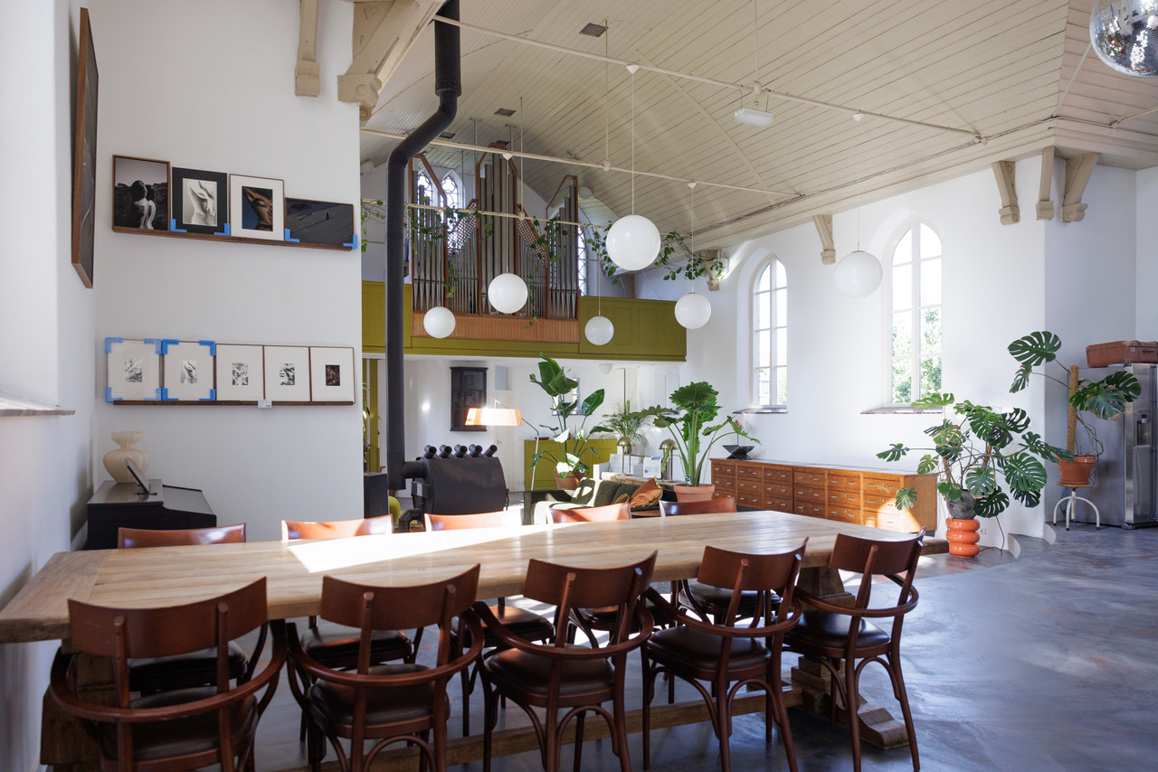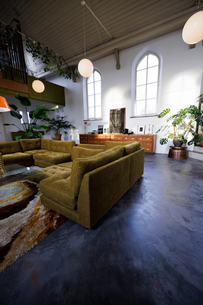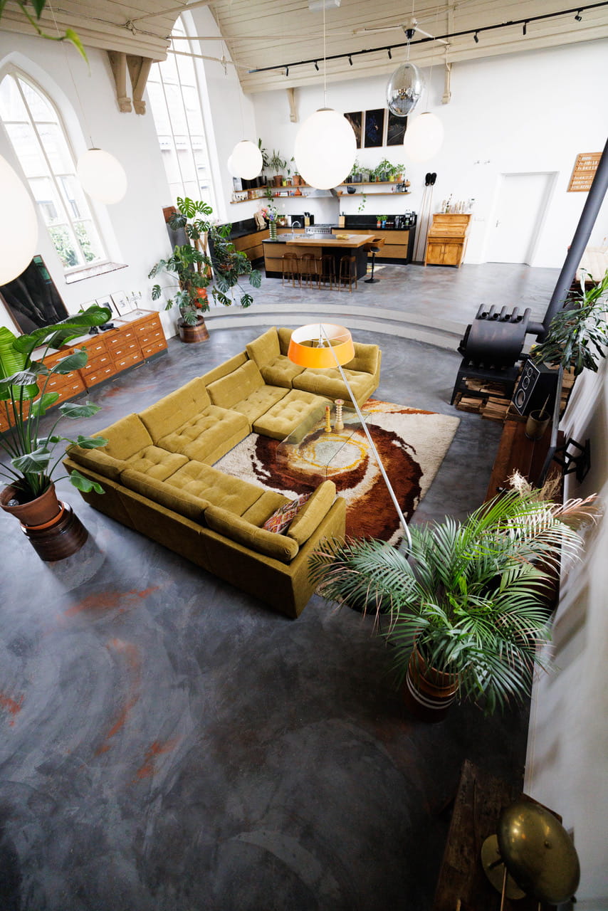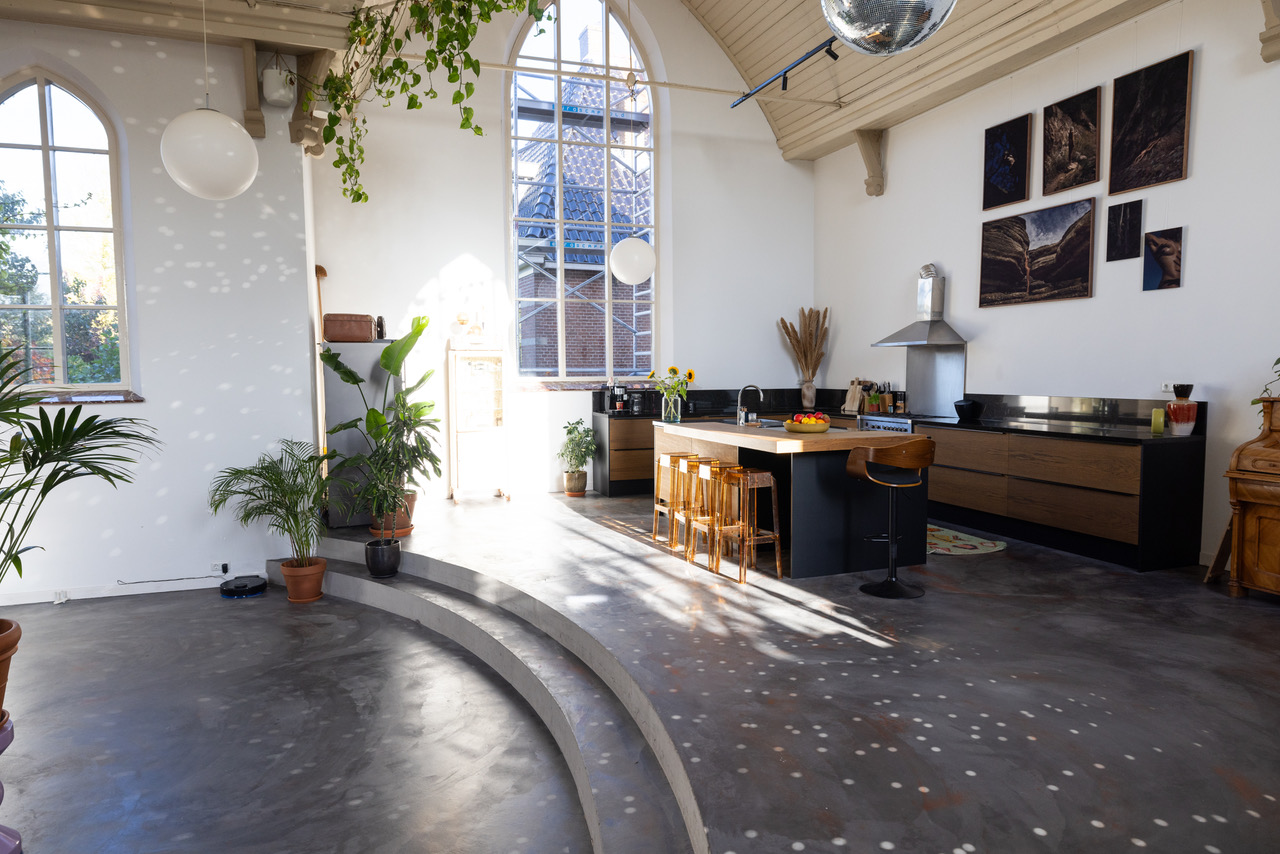 Deze kerk shootlocatie uit 1877 is omgebouwd tot een open woonruimte van 160m² met plafonds van 7 meter hoog. Die ramen, 5 meter hoge klassieke kerkramen met hun ronde bovenkant die de hele dag zacht daglicht naar binnen halen. Het gebouw heeft z’n karakter behouden, maar van binnen is alles gemoderniseerd en ingericht met een mix van vintage meubels, veel groen en speelse kleuraccenten.