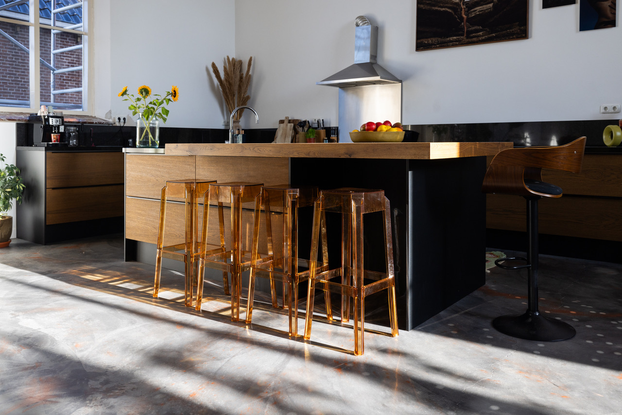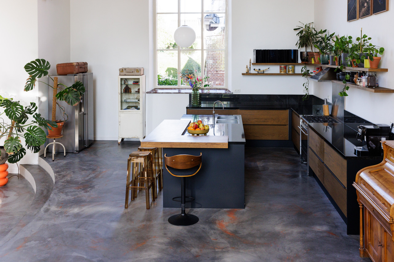De keuken is geen afterthought. Groot zwart kookeiland met massief houten werkblad, ruimte eromheen om te bewegen, barkrukken voor close-ups of casual shots. De keukenwand heeft houten onderkasten en een betonnen werkblad.