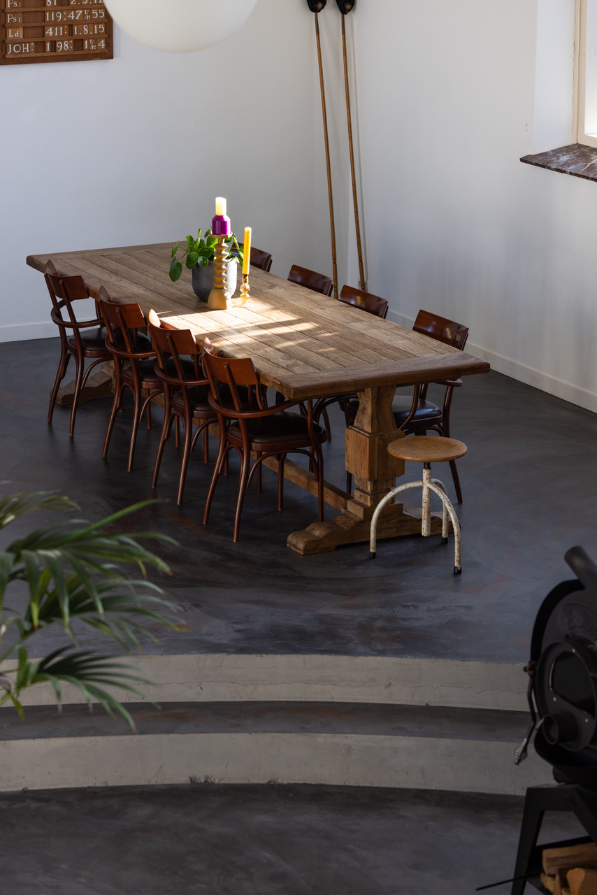 De eethoek heeft een lange houten tafel met vintage caféstoelen. Groot genoeg voor groepsscènes, dinertaferelen, werkmeetings. Die discobal die erboven hangt voegt een onverwachte twist toe, vooral voor avondopnames.