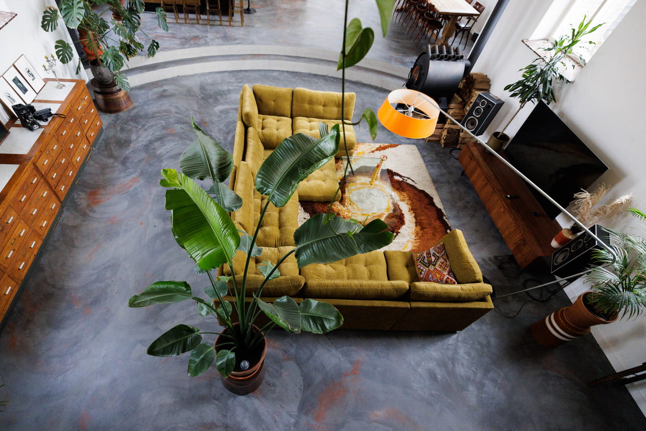 De inrichting is eclectisch, maar het werkt. Zwarte loungestoelen, een lange houten apothekerskast met kleine laatjes, groene fluwelen banken, vintage tafels. En overal planten. Grote monstera’s in oranje potten, hangplanten vanaf de vide, palmbomen in terracotta. Die planten geven warmte aan de grote ruimte zonder hem vol te maken.