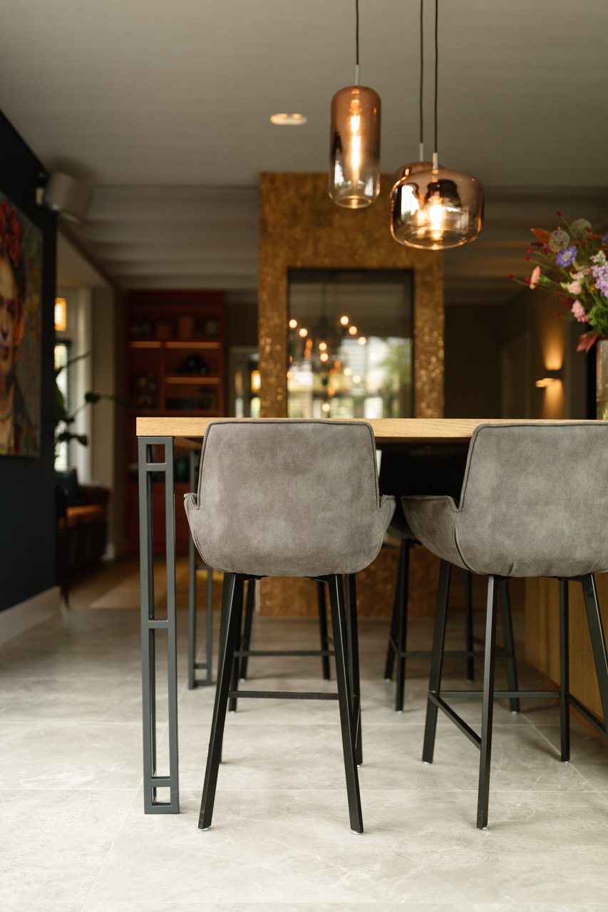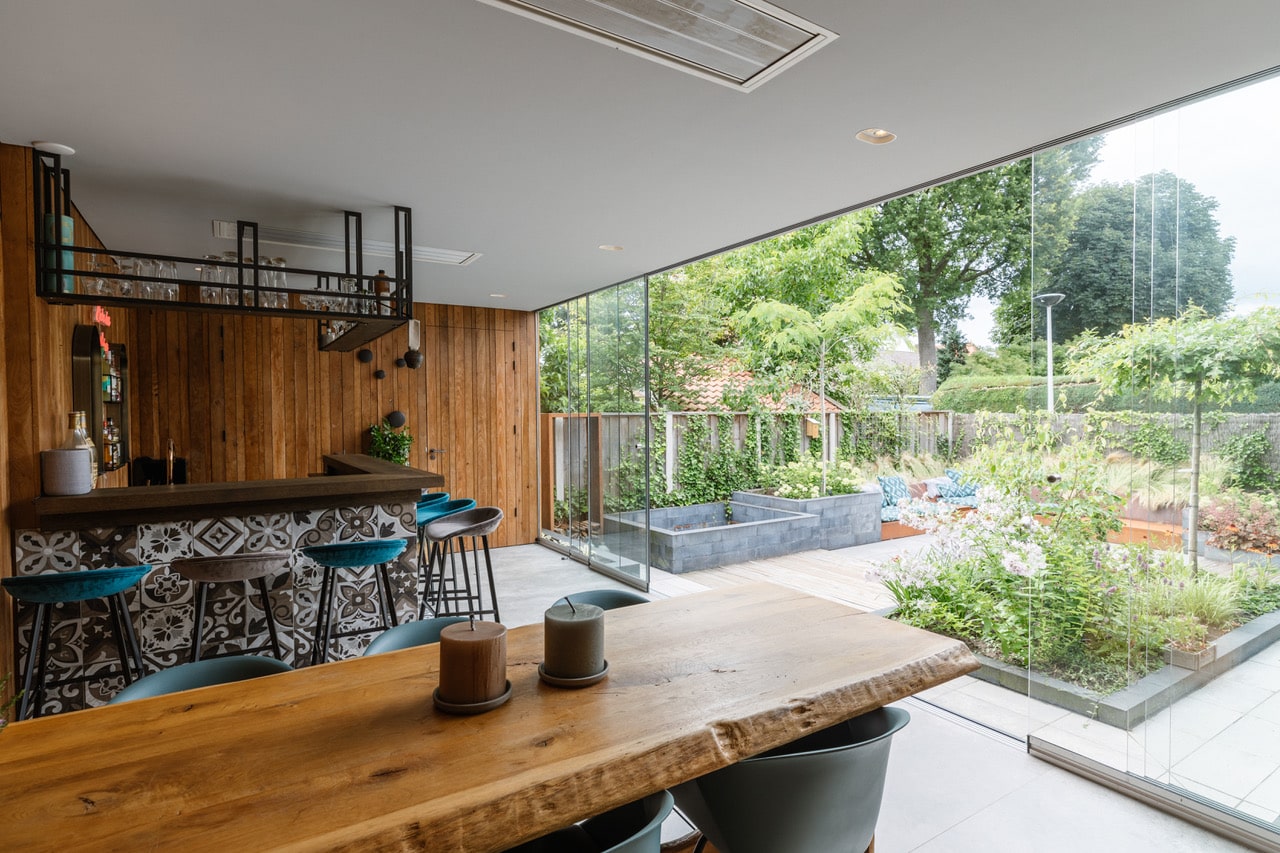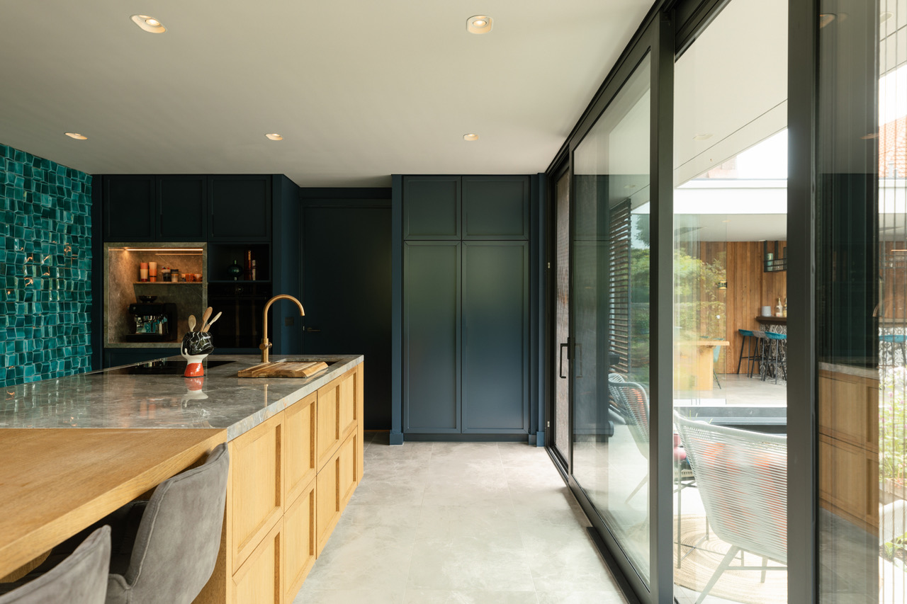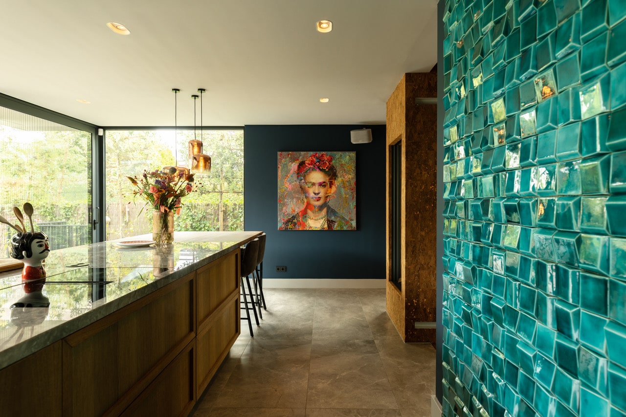 De keuken is licht en ruim met twee grote schuifdeuren naar de tuin. Een 3D-tegelwand in blauw-groen contrasteert mooi met het natuurstenen werkblad. Het kookeiland is uitgevoerd in warm hout, de hoge kasten in datzelfde diepe blauw. Een groot kleurrijk kunstwerk aan de muur maakt het compleet.