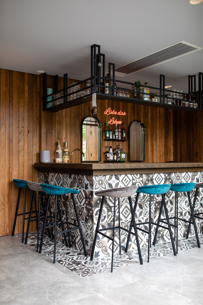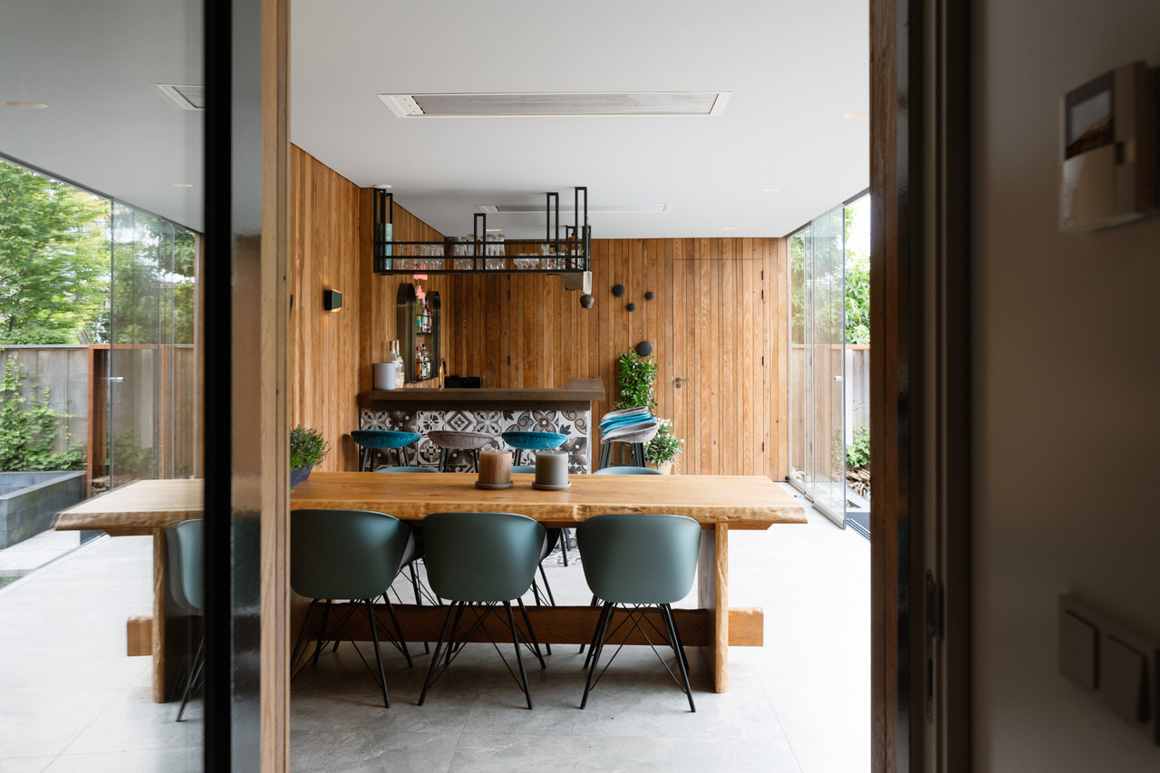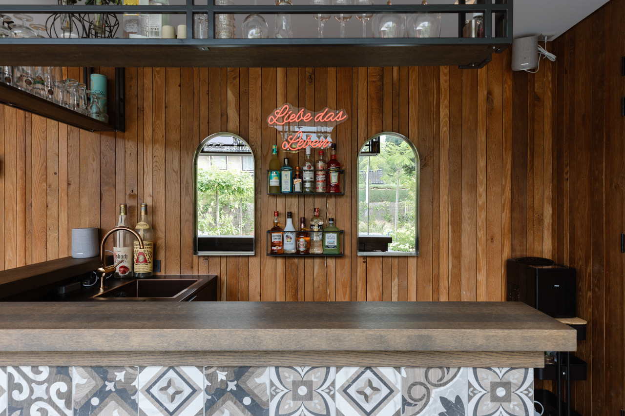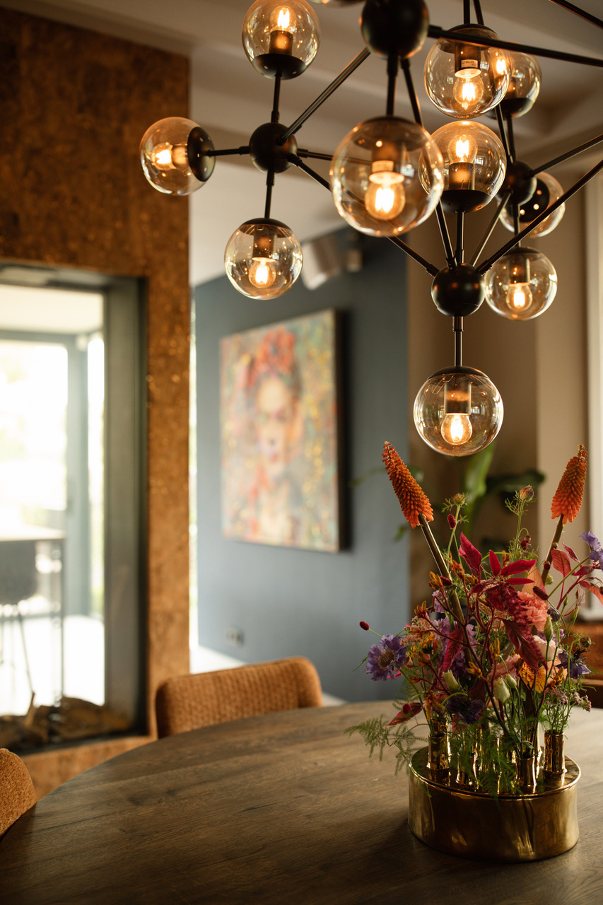 De keuken is licht en ruim met twee grote schuifdeuren naar de tuin. Een 3D-tegelwand in blauw-groen contrasteert mooi met het natuurstenen werkblad. Het kookeiland is uitgevoerd in warm hout, de hoge kasten in datzelfde diepe blauw. Een groot kleurrijk kunstwerk aan de muur maakt het compleet.