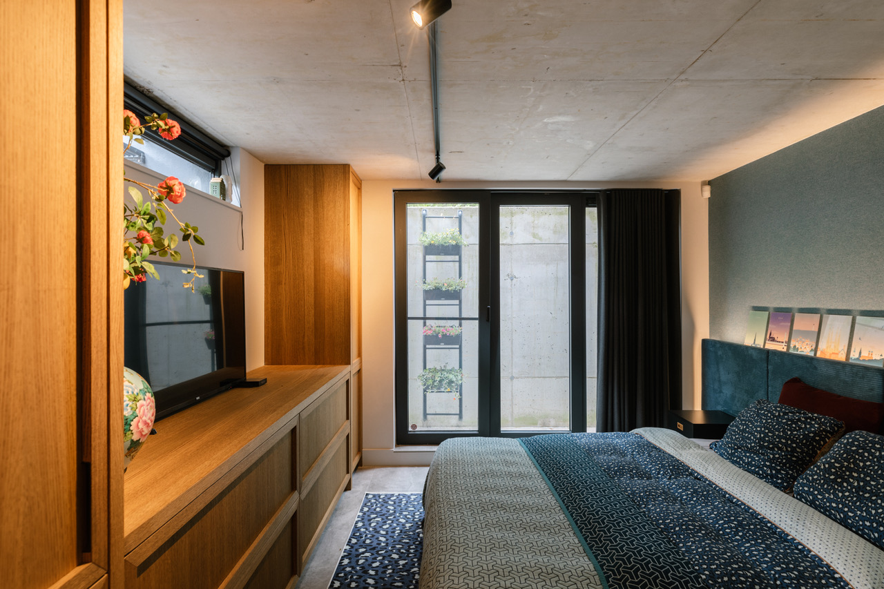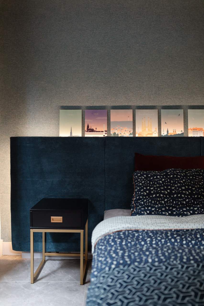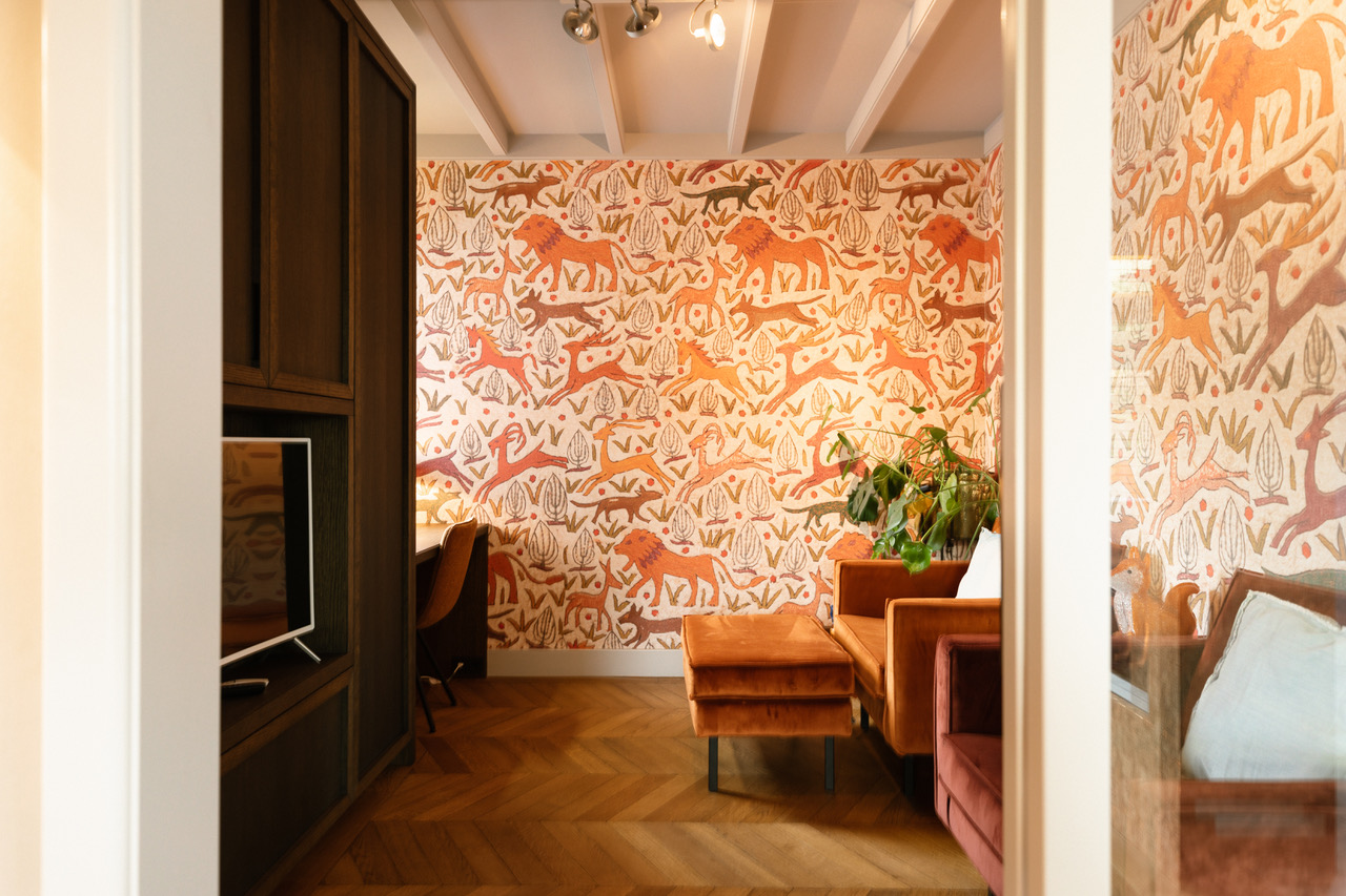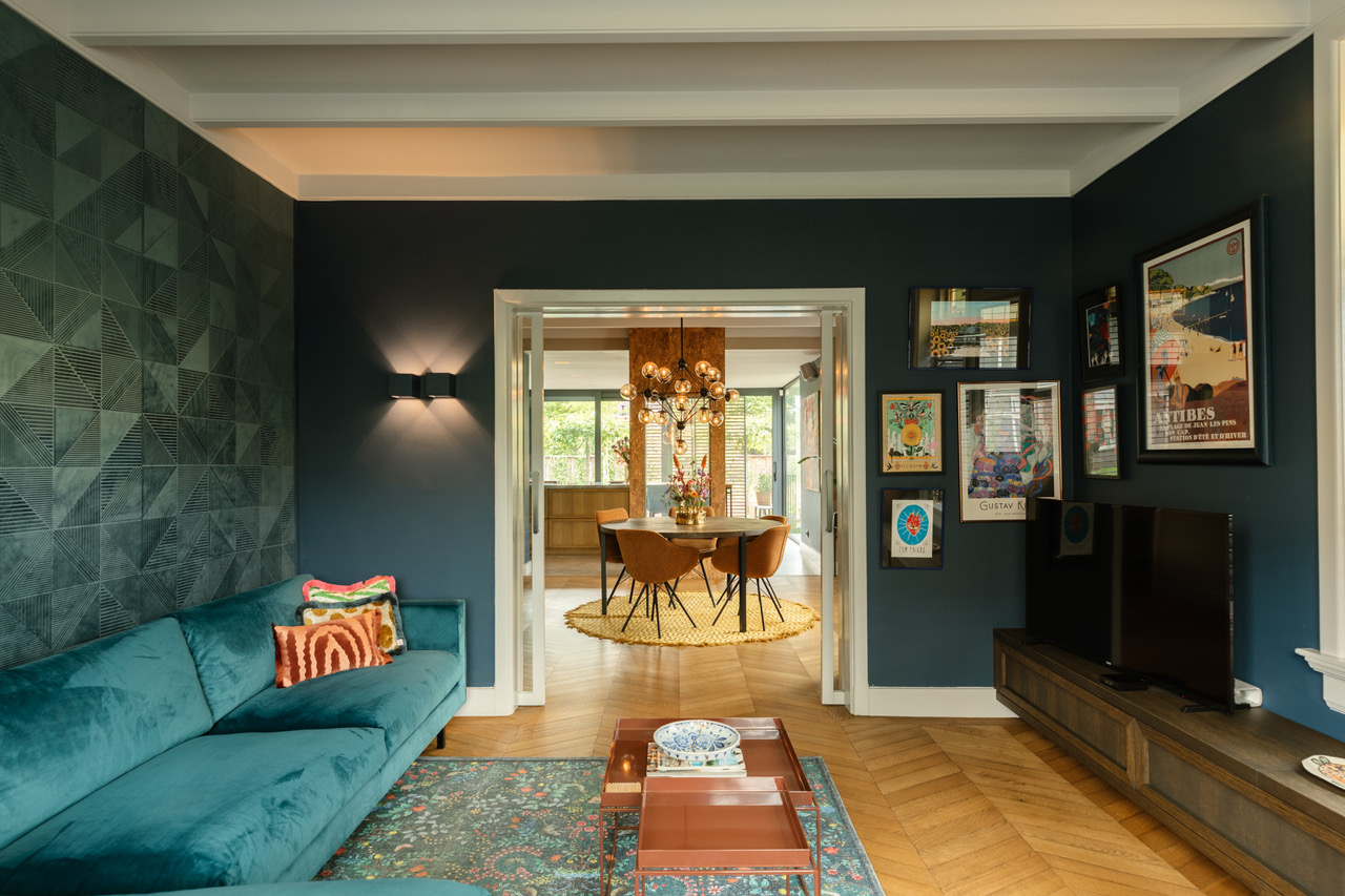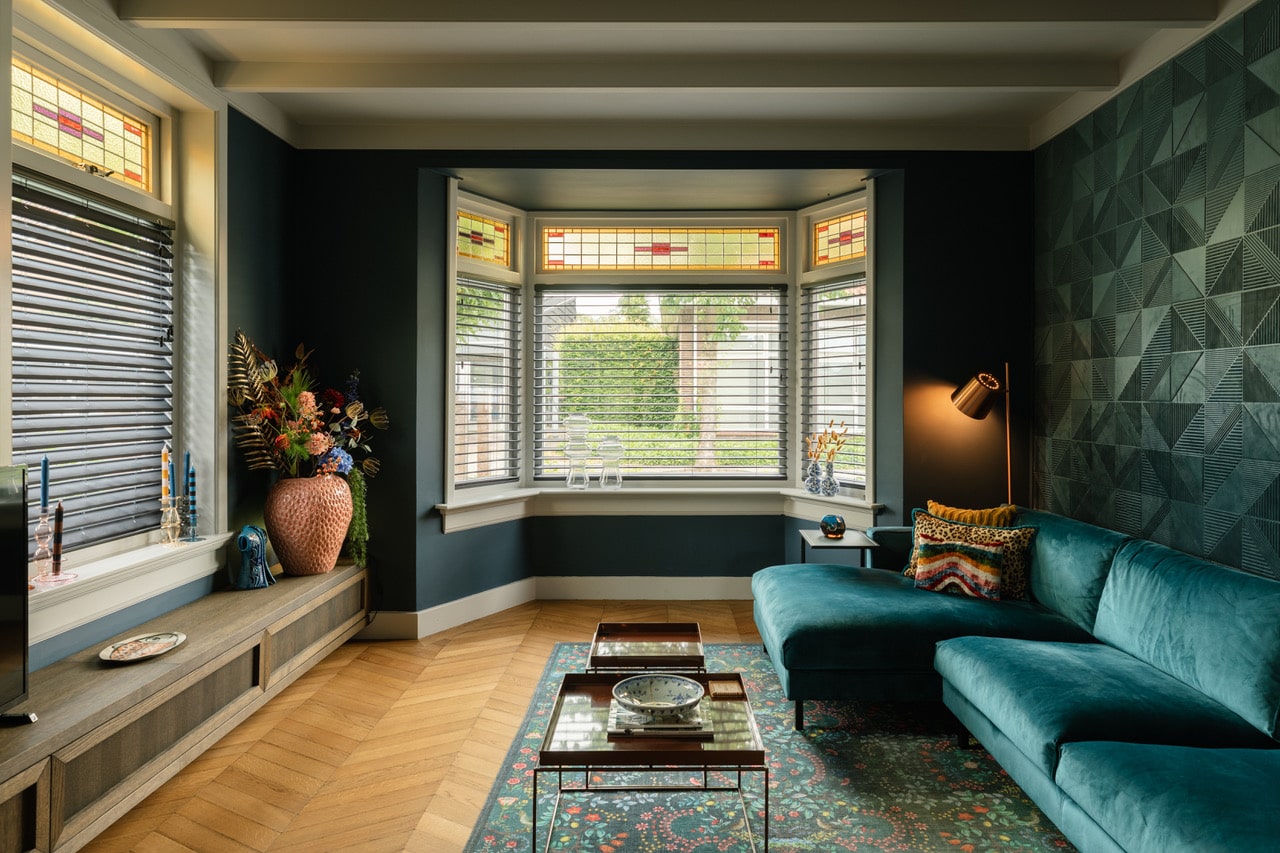 De woonkamer heeft diepblauwe wanden, een fluwelen blauwe bank en opvallend 3D-reliëfbehang. De houten vloer in Hongaarse punt loopt door naar de eetkamer en werkkamer. Originele glas-in-loodramen geven zachte lichtinval en versterken het vintage karakter.