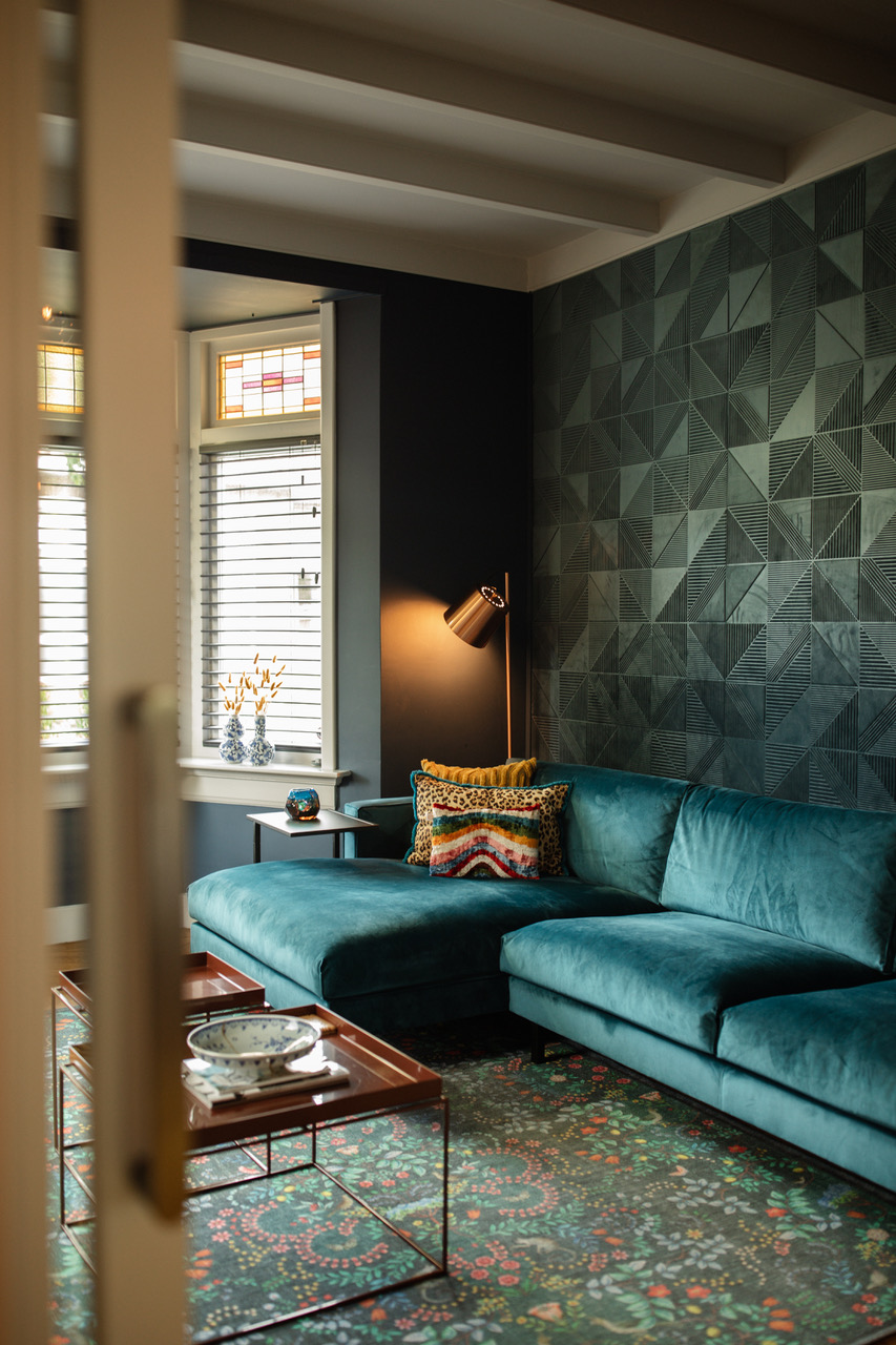 Deze kleurrijke jaren 30 shootlocatie in het oosten combineert authentieke details met een gedurfde, kleurrijke inrichting. Diepblauwe wanden, fluwelen stoffen en geometrisch reliëfbehang zorgen voor een opvallende setting die perfect werkt voor fotoshoots en filmproducties.