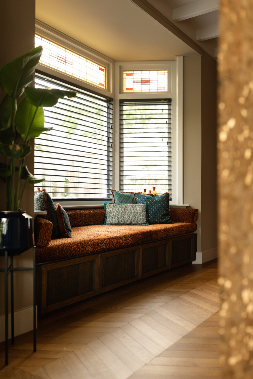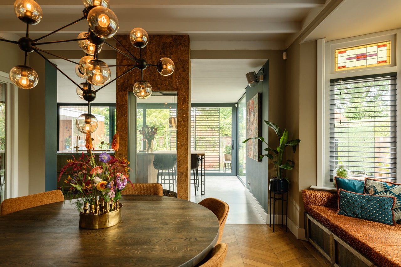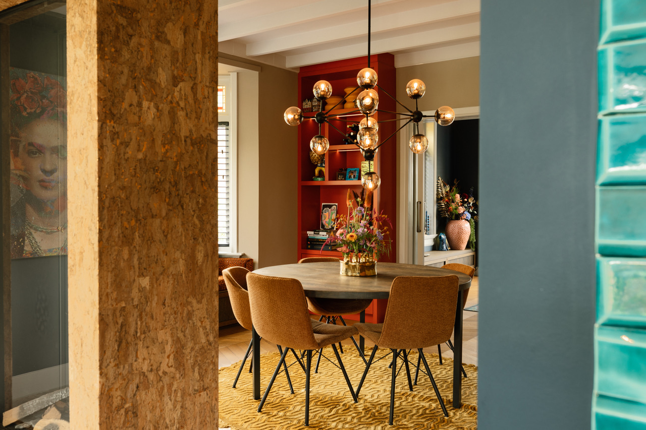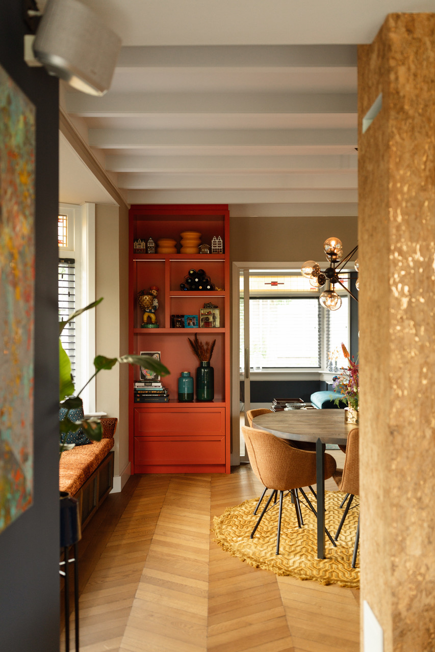 In de eetkamer zie je een rode maatwerkkast en een erkerbank met oranje fluweel. De werkkamer heeft gekleurde wanden en grote fauteuils. Daarnaast behoudt de hal de originele jaren 30 tegelvloer met een kleurrijke loper op de trap.