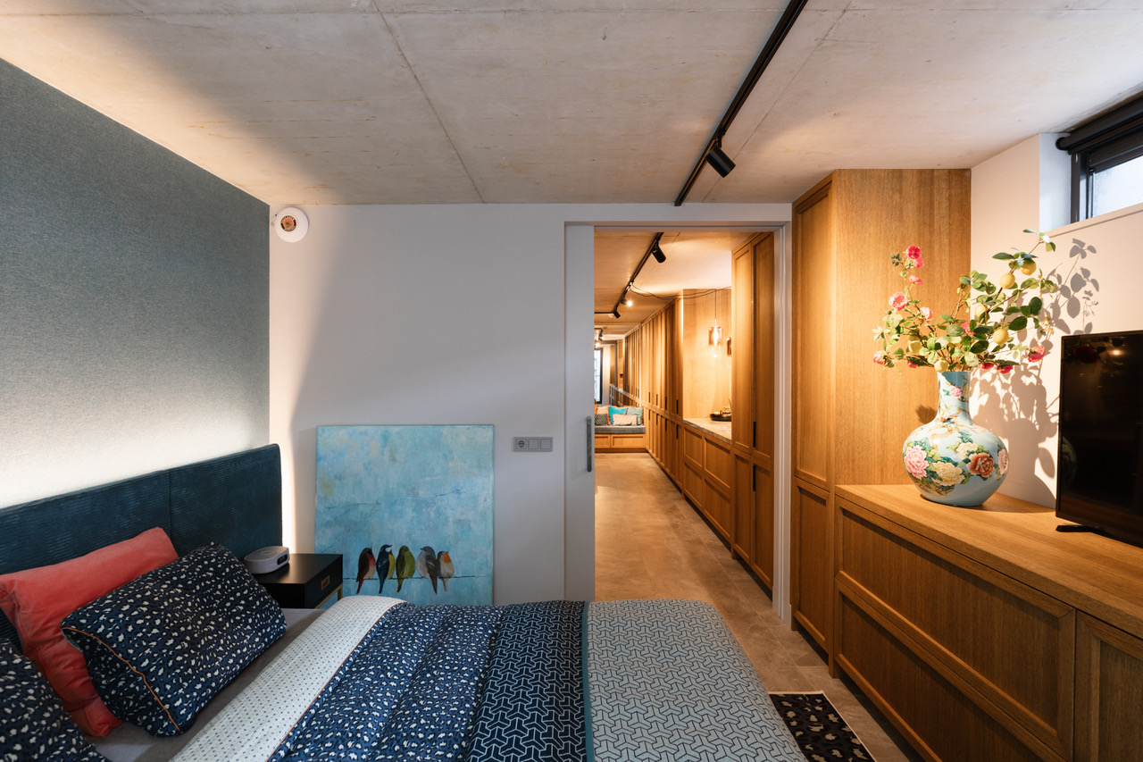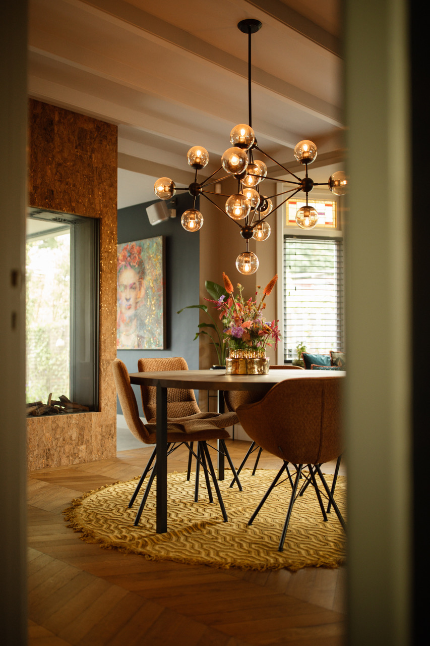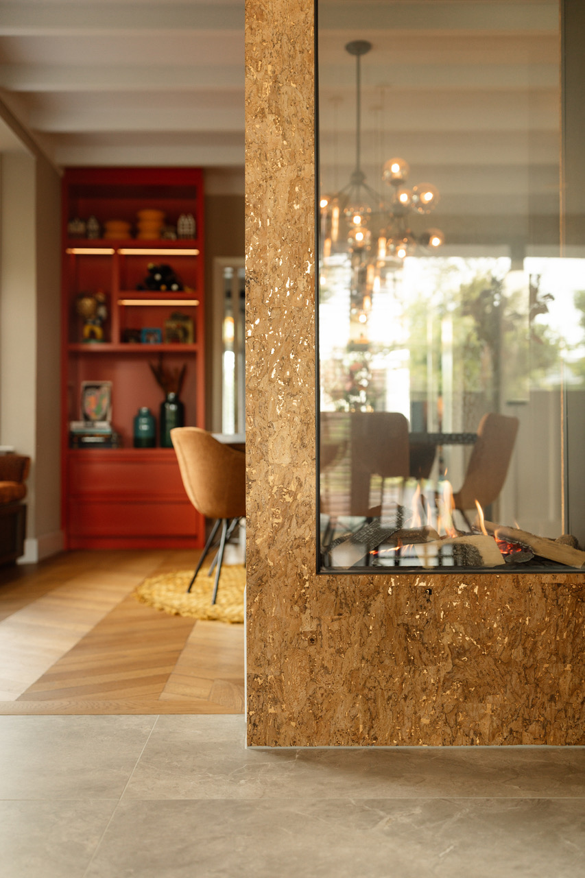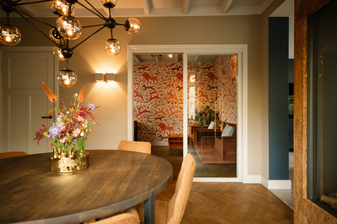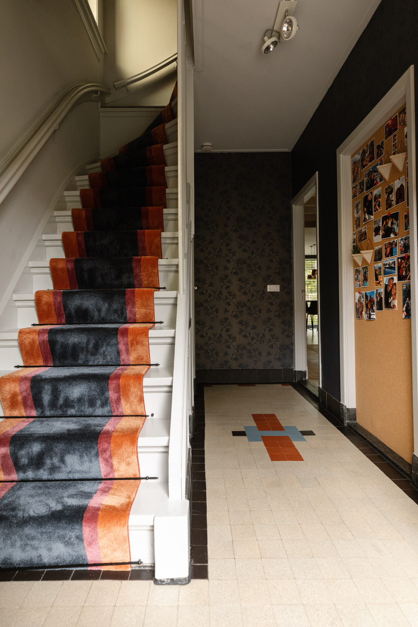 In de eetkamer zie je een rode maatwerkkast en een erkerbank met oranje fluweel. De werkkamer heeft gekleurde wanden en grote fauteuils. Daarnaast behoudt de hal de originele jaren 30 tegelvloer met een kleurrijke loper op de trap.