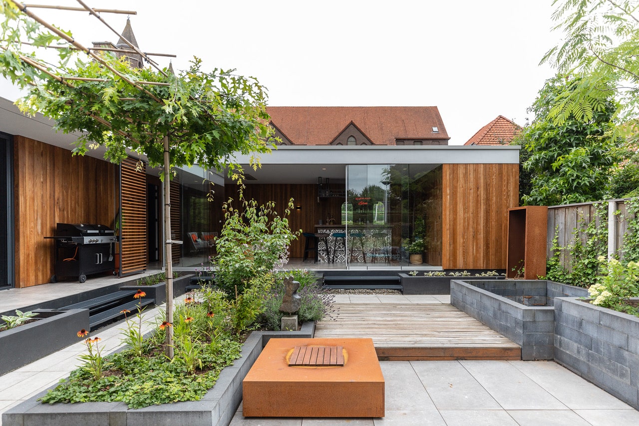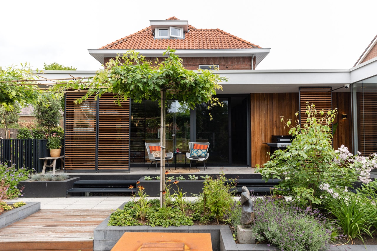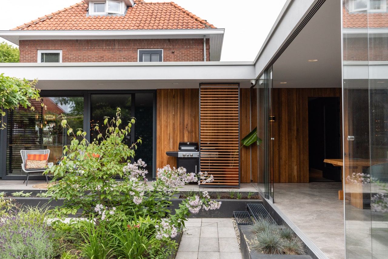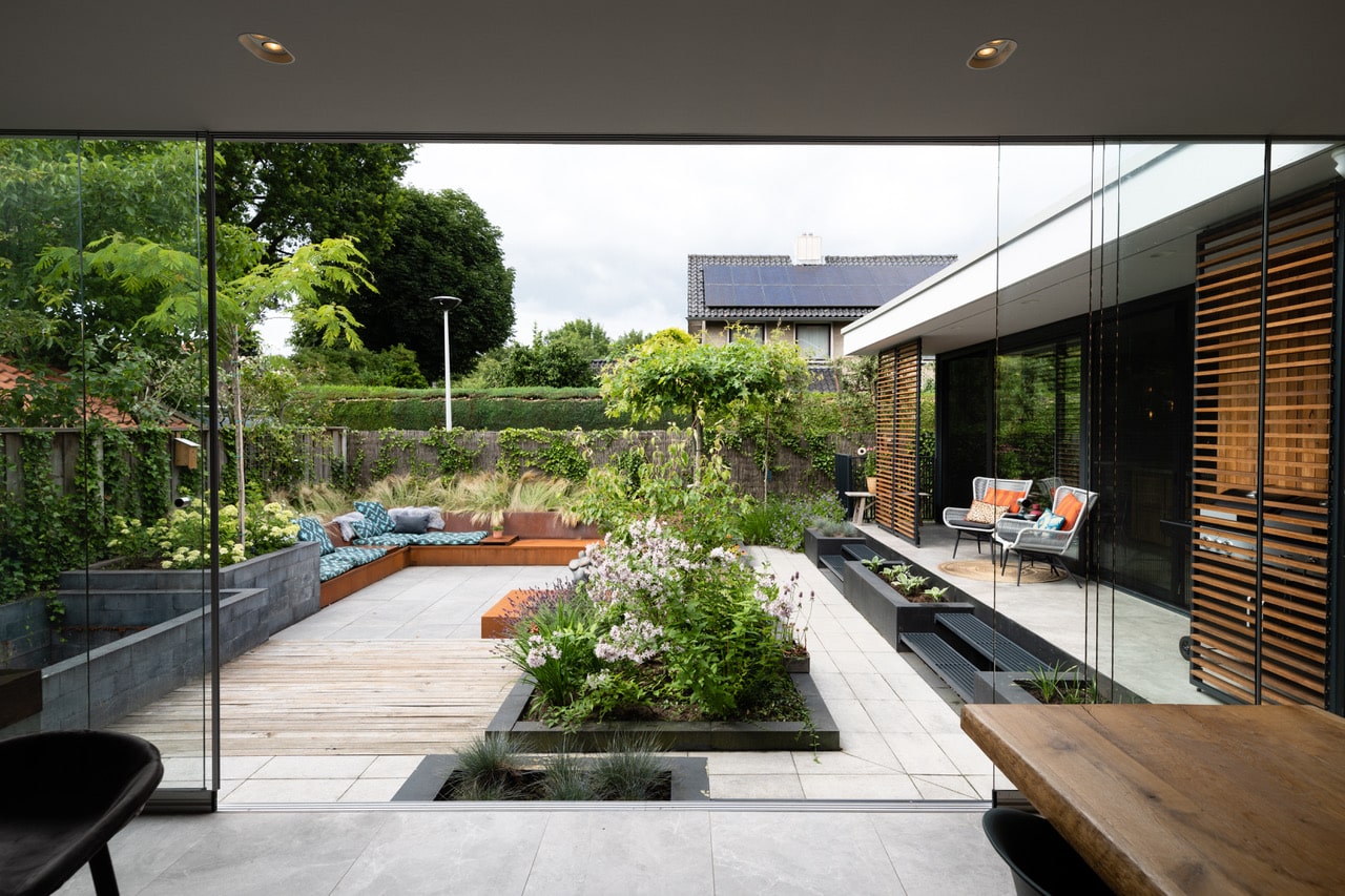 De locatie ligt in een rustige woonwijk nabij het centrum van Oldenzaal. De tuin is direct bereikbaar vanuit de keuken en veranda. Er is voldoende parkeergelegenheid in de straat, handig voor crews met materiaal.