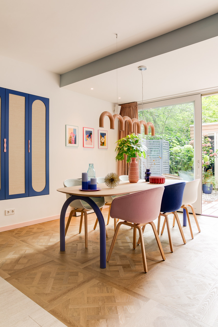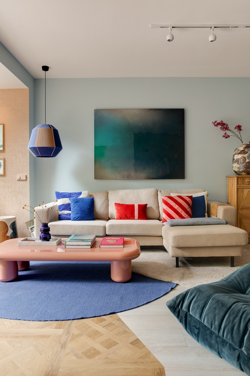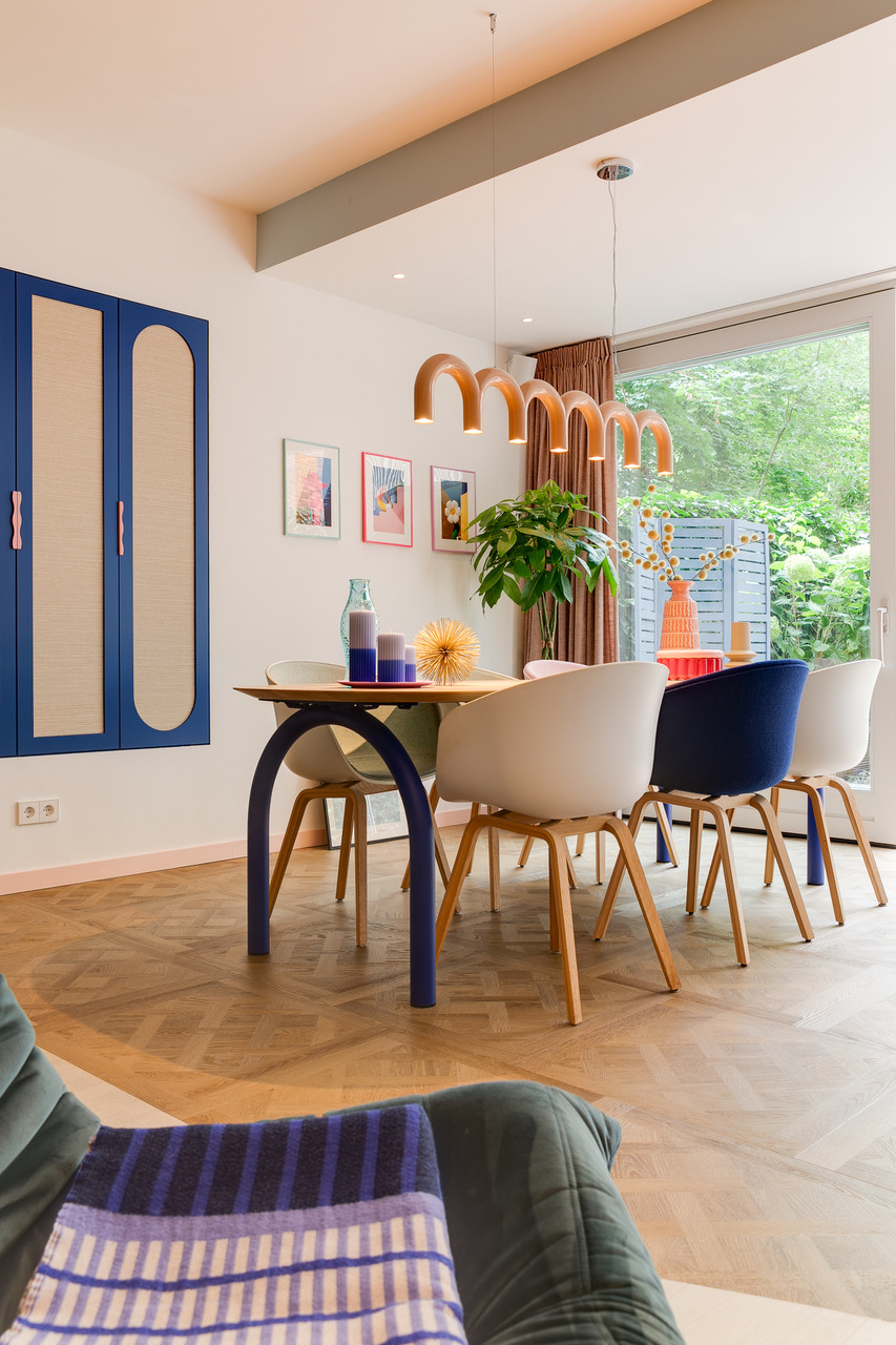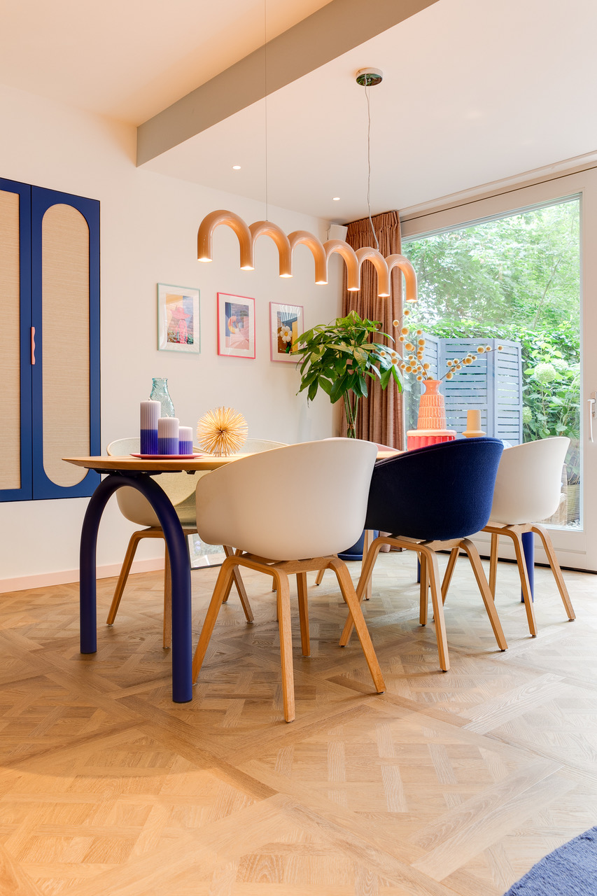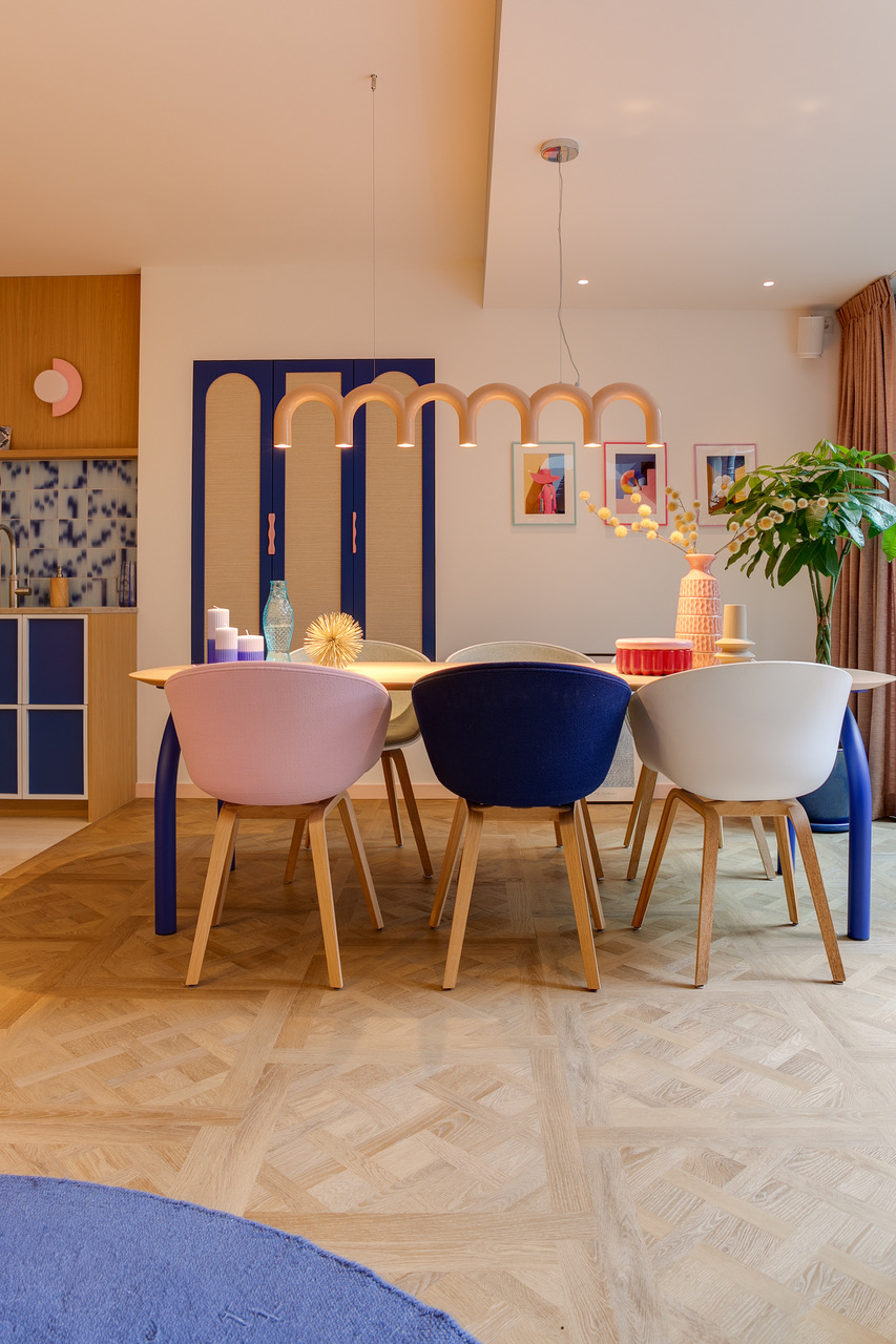 De ruime woonkamer van 45m² ligt op het westen en profiteert van veel daglicht. Kobaltblauw domineert via de modulaire bank, designstoelen en wandelementen, terwijl zachte roze accenten in kussens en decoratie voor warmte zorgen. Het open keukenblok vormt de echte eye-catcher met zijn blauwe bovenkastjes, opvallende roze booglamp en grafische wandsculptuur. De visgraatvloer in licht eikenhout verbindt alle ruimtes met elkaar.