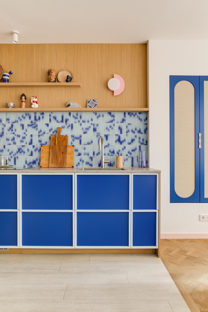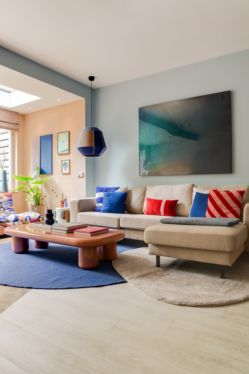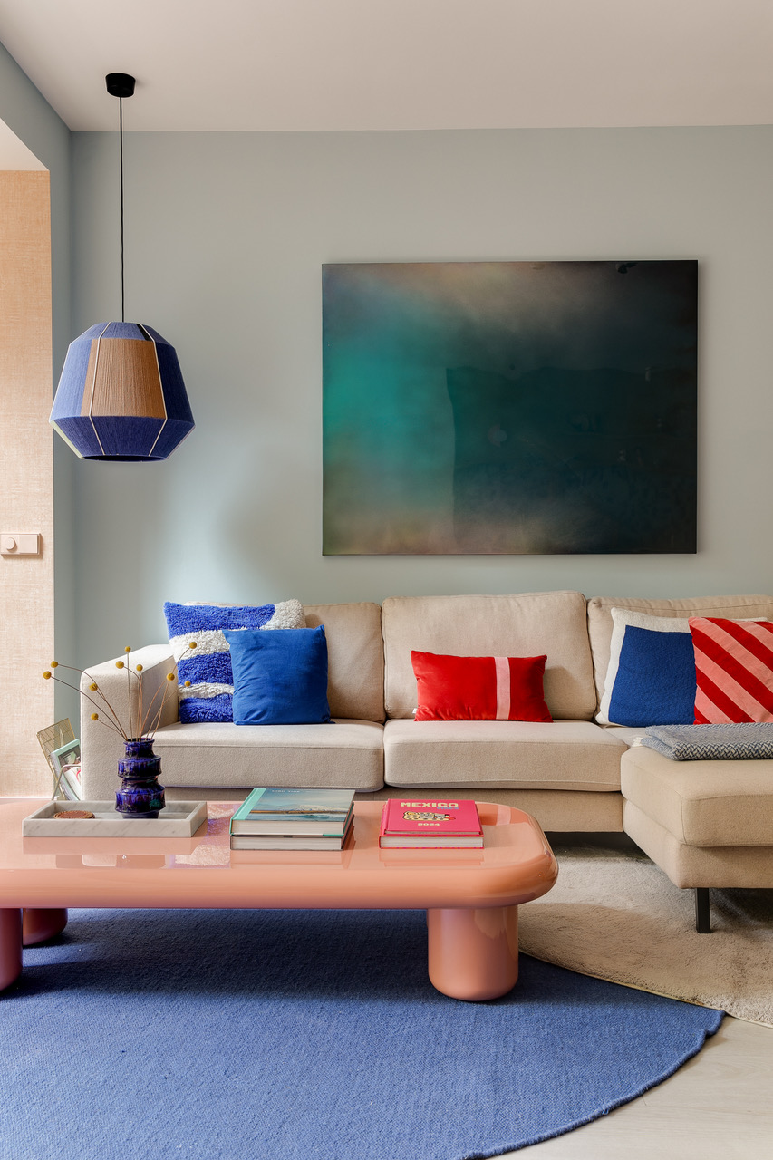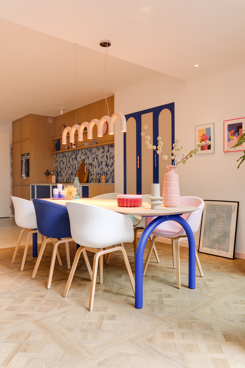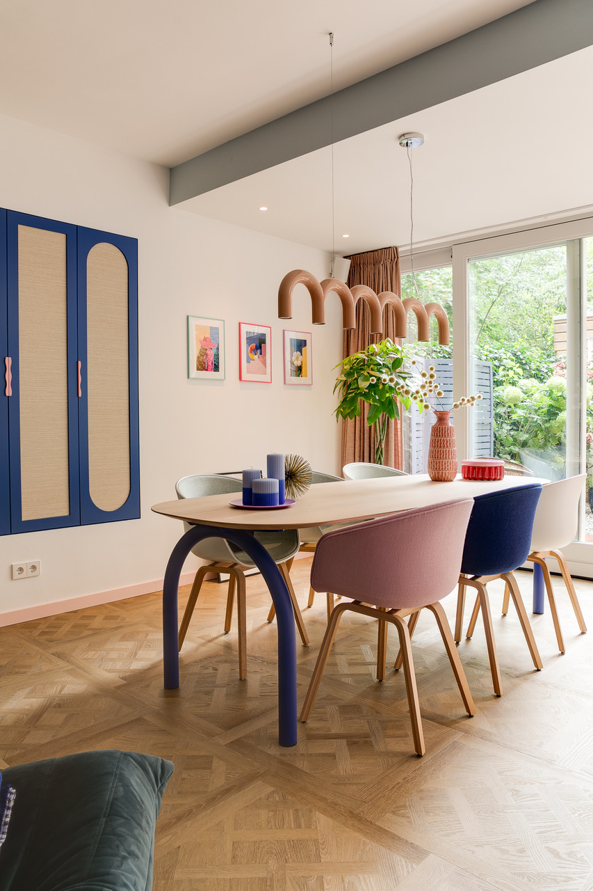 De ruime woonkamer van 45m² ligt op het westen en profiteert van veel daglicht. Kobaltblauw domineert via de modulaire bank, designstoelen en wandelementen, terwijl zachte roze accenten in kussens en decoratie voor warmte zorgen. Het open keukenblok vormt de echte eye-catcher met zijn blauwe bovenkastjes, opvallende roze booglamp en grafische wandsculptuur. De visgraatvloer in licht eikenhout verbindt alle ruimtes met elkaar.