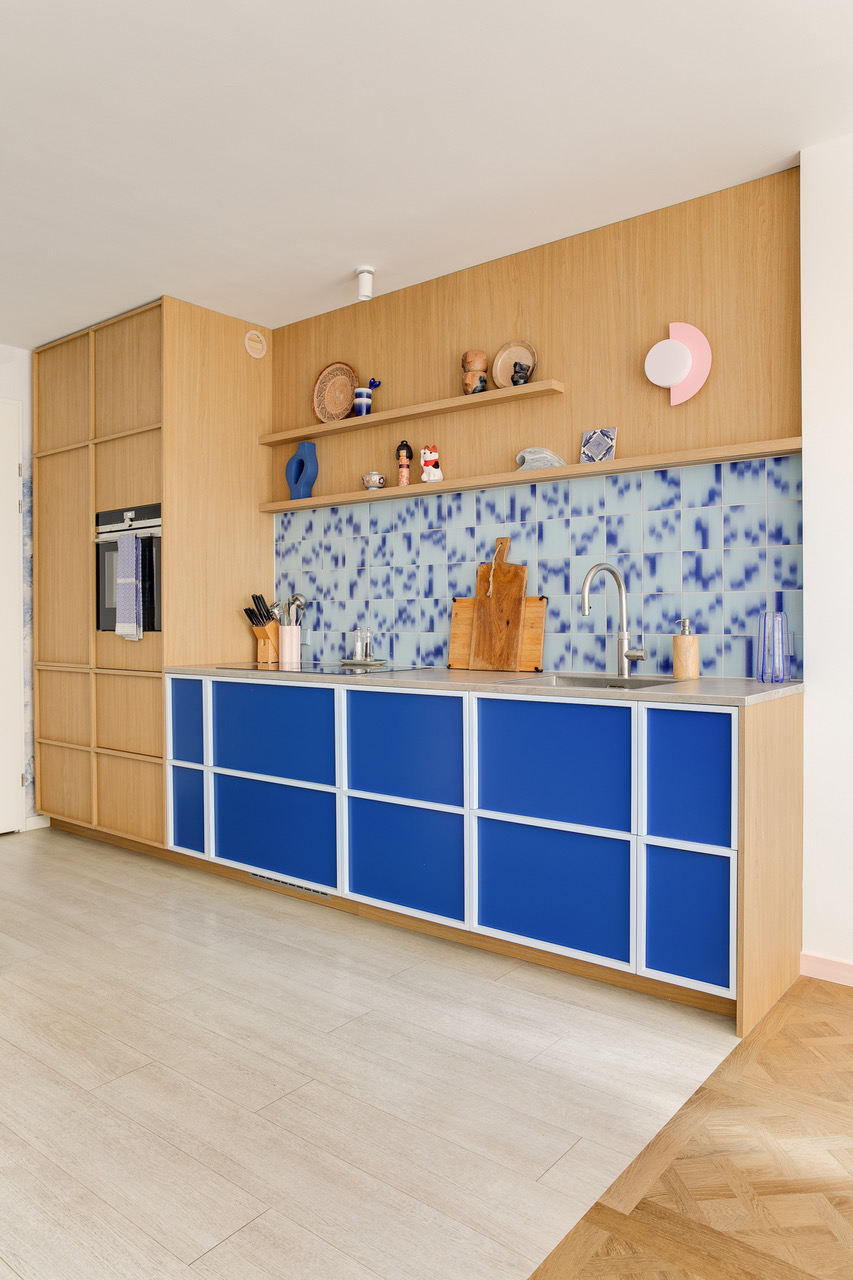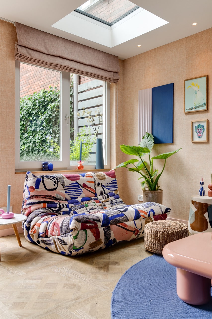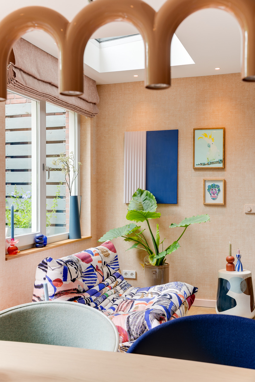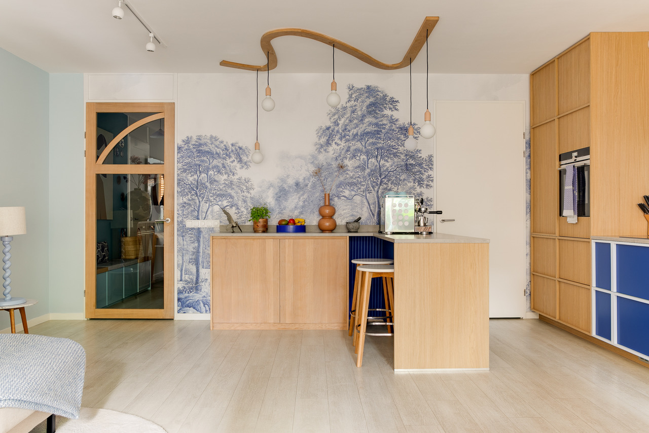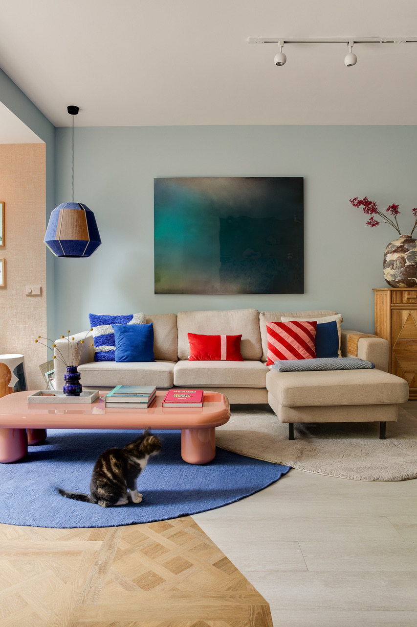 De ruime woonkamer van 45m² ligt op het westen en profiteert van veel daglicht. Kobaltblauw domineert via de modulaire bank, designstoelen en wandelementen, terwijl zachte roze accenten in kussens en decoratie voor warmte zorgen. Het open keukenblok vormt de echte eye-catcher met zijn blauwe bovenkastjes, opvallende roze booglamp en grafische wandsculptuur. De visgraatvloer in licht eikenhout verbindt alle ruimtes met elkaar.