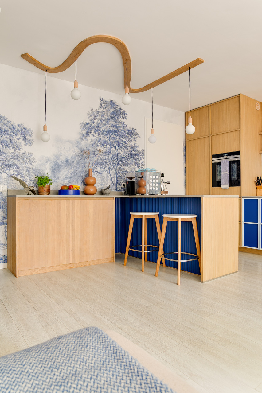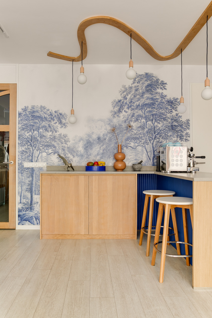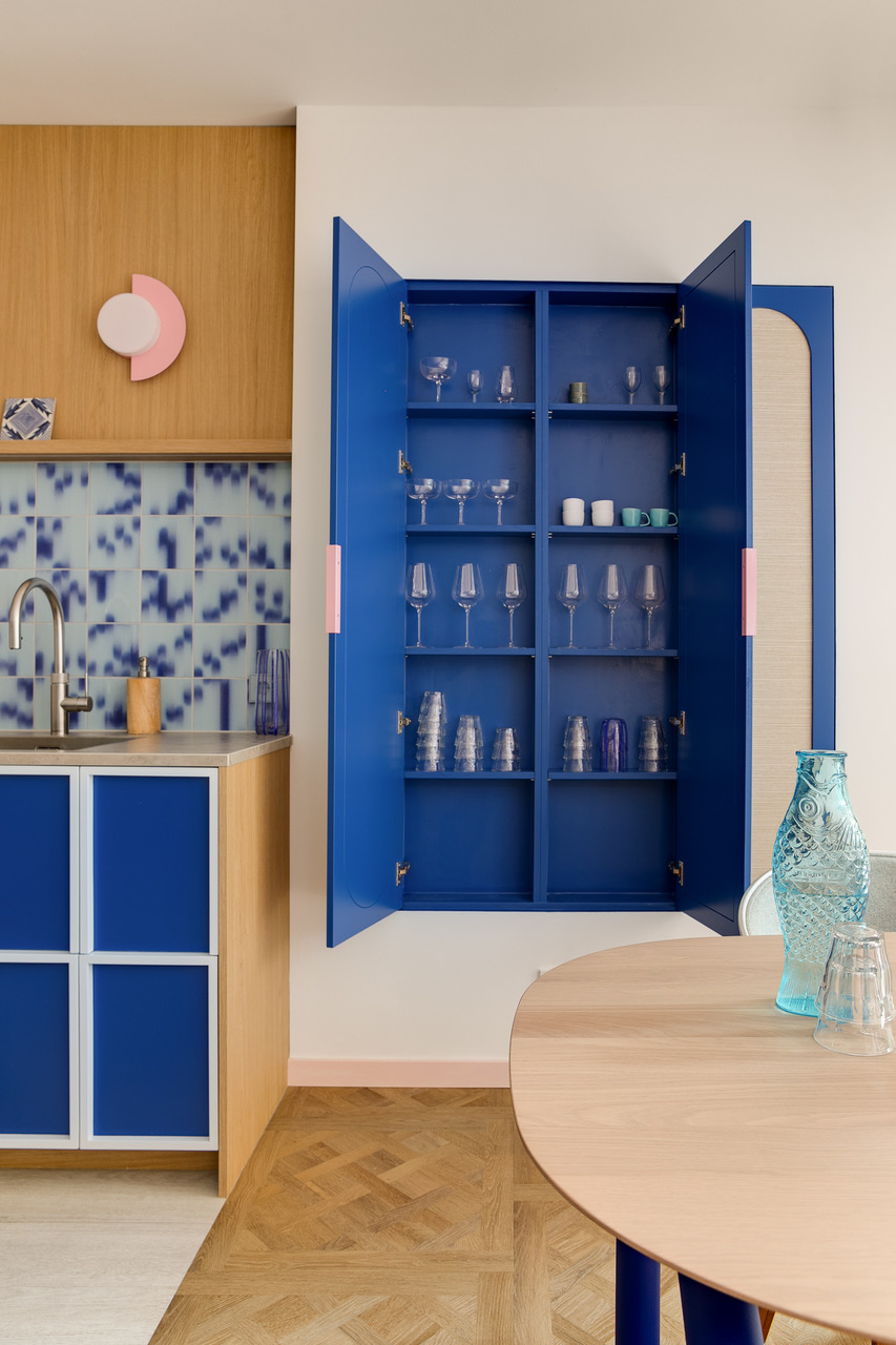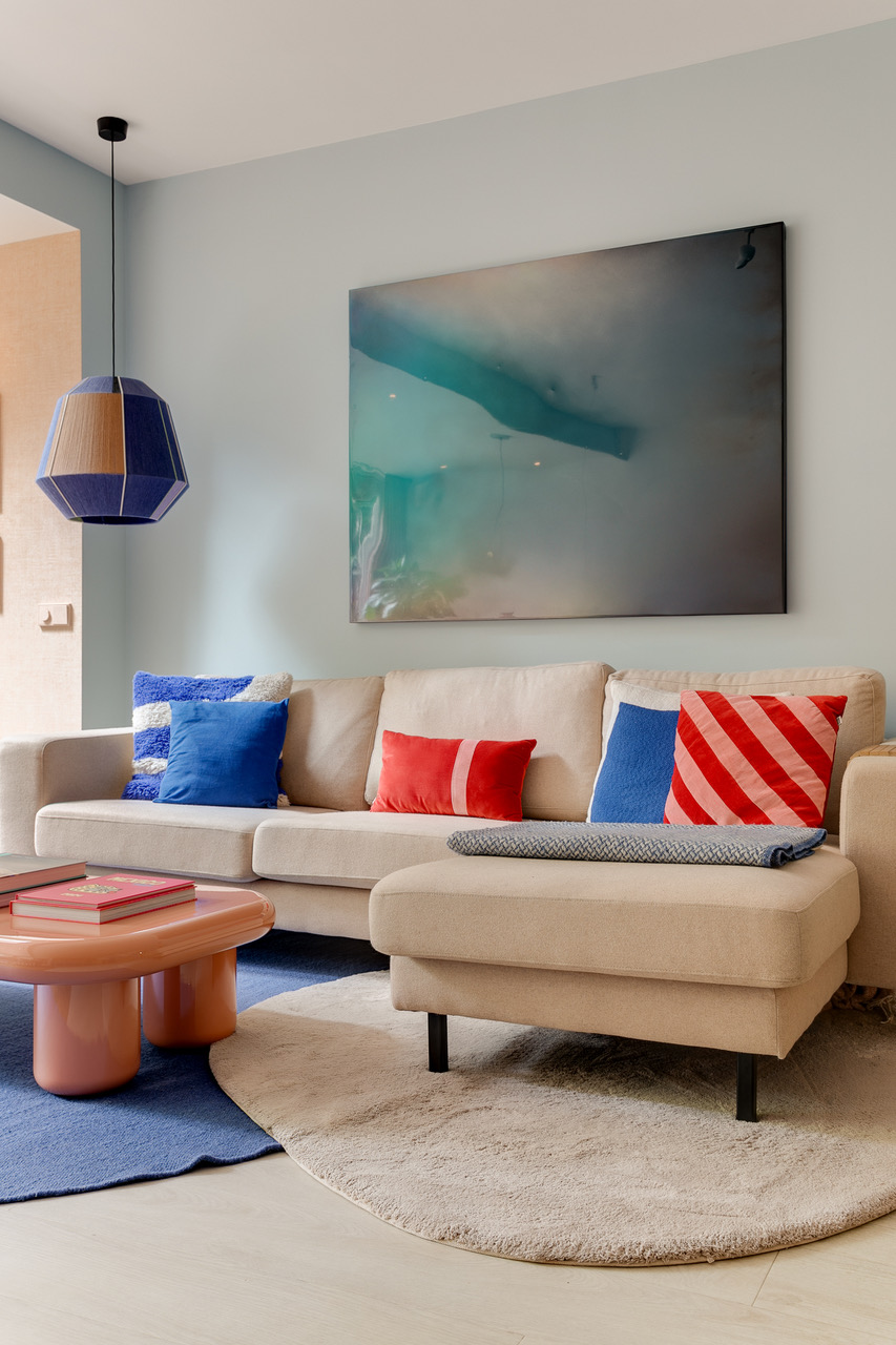 De ruime woonkamer van 45m² ligt op het westen en profiteert van veel daglicht. Kobaltblauw domineert via de modulaire bank, designstoelen en wandelementen, terwijl zachte roze accenten in kussens en decoratie voor warmte zorgen. Het open keukenblok vormt de echte eye-catcher met zijn blauwe bovenkastjes, opvallende roze booglamp en grafische wandsculptuur. De visgraatvloer in licht eikenhout verbindt alle ruimtes met elkaar.