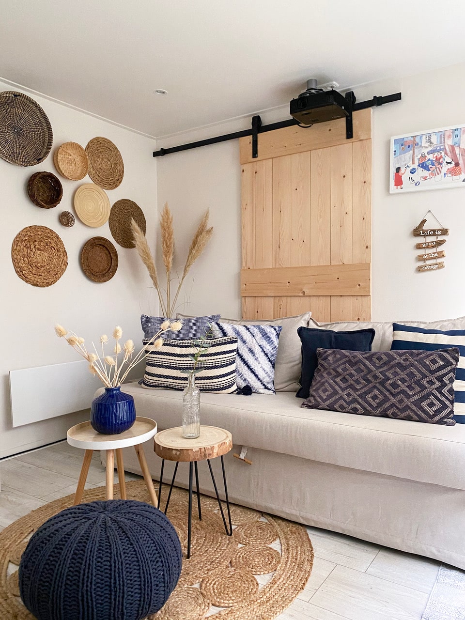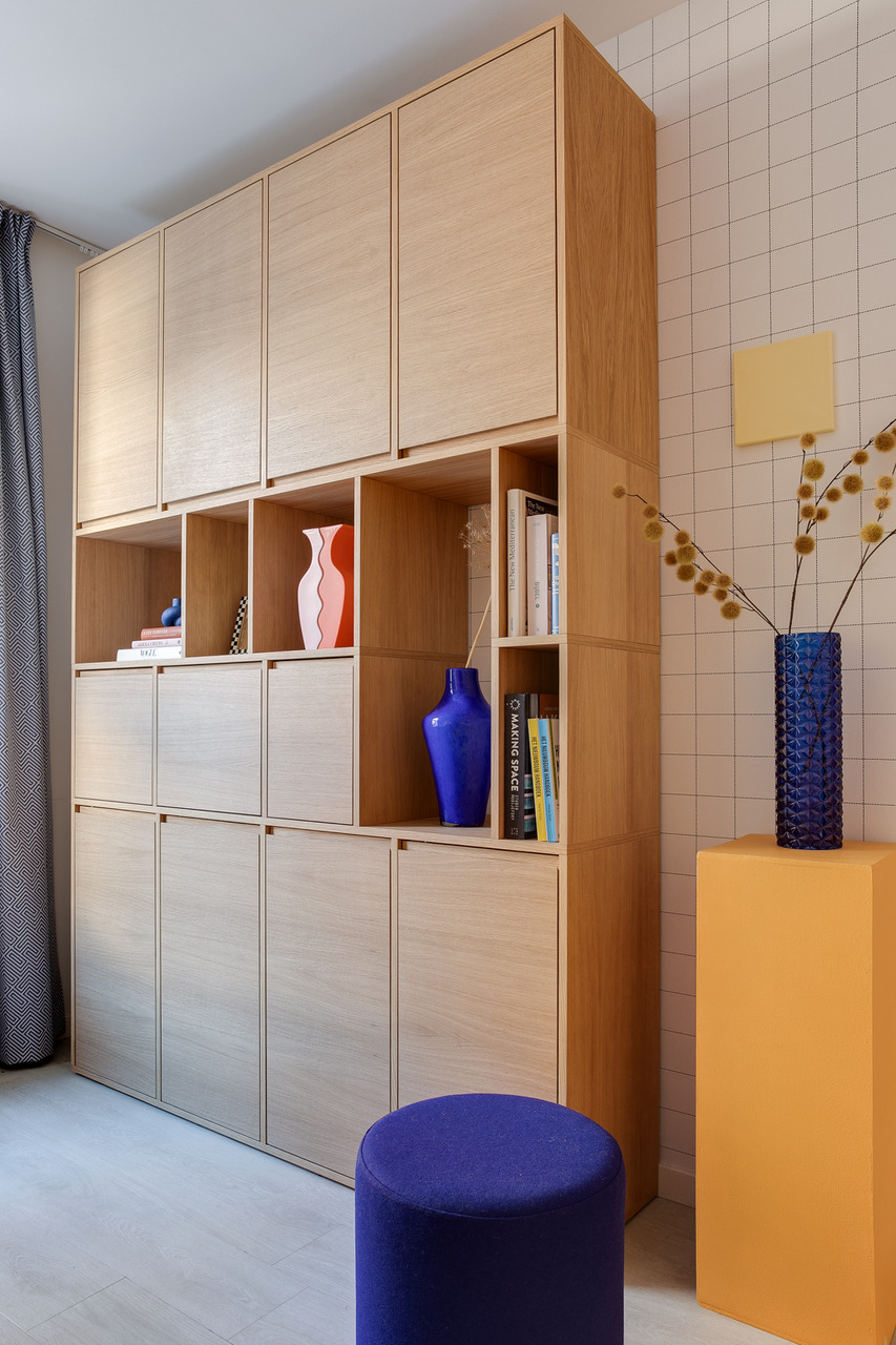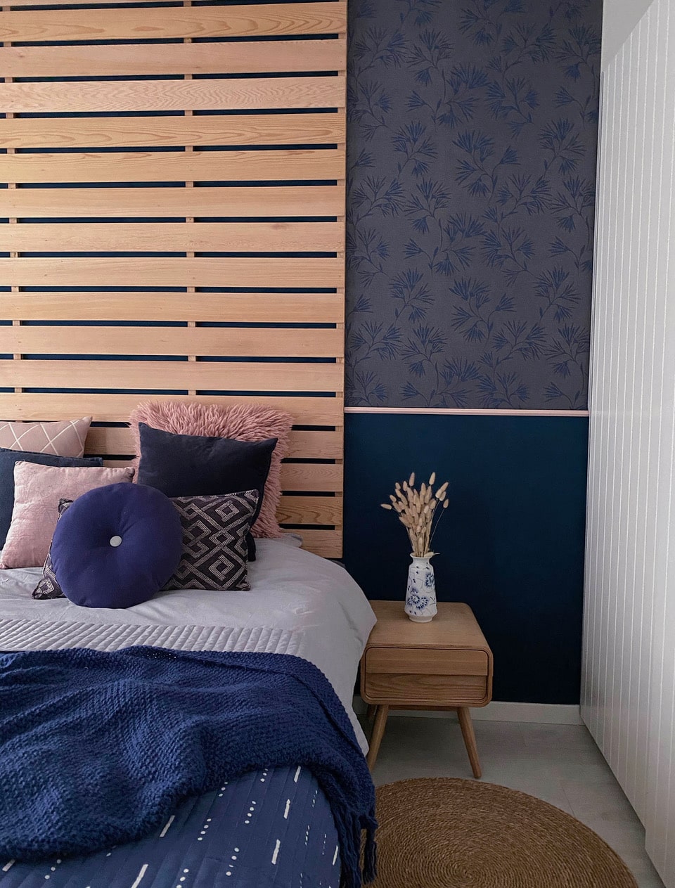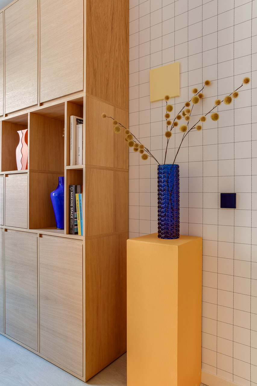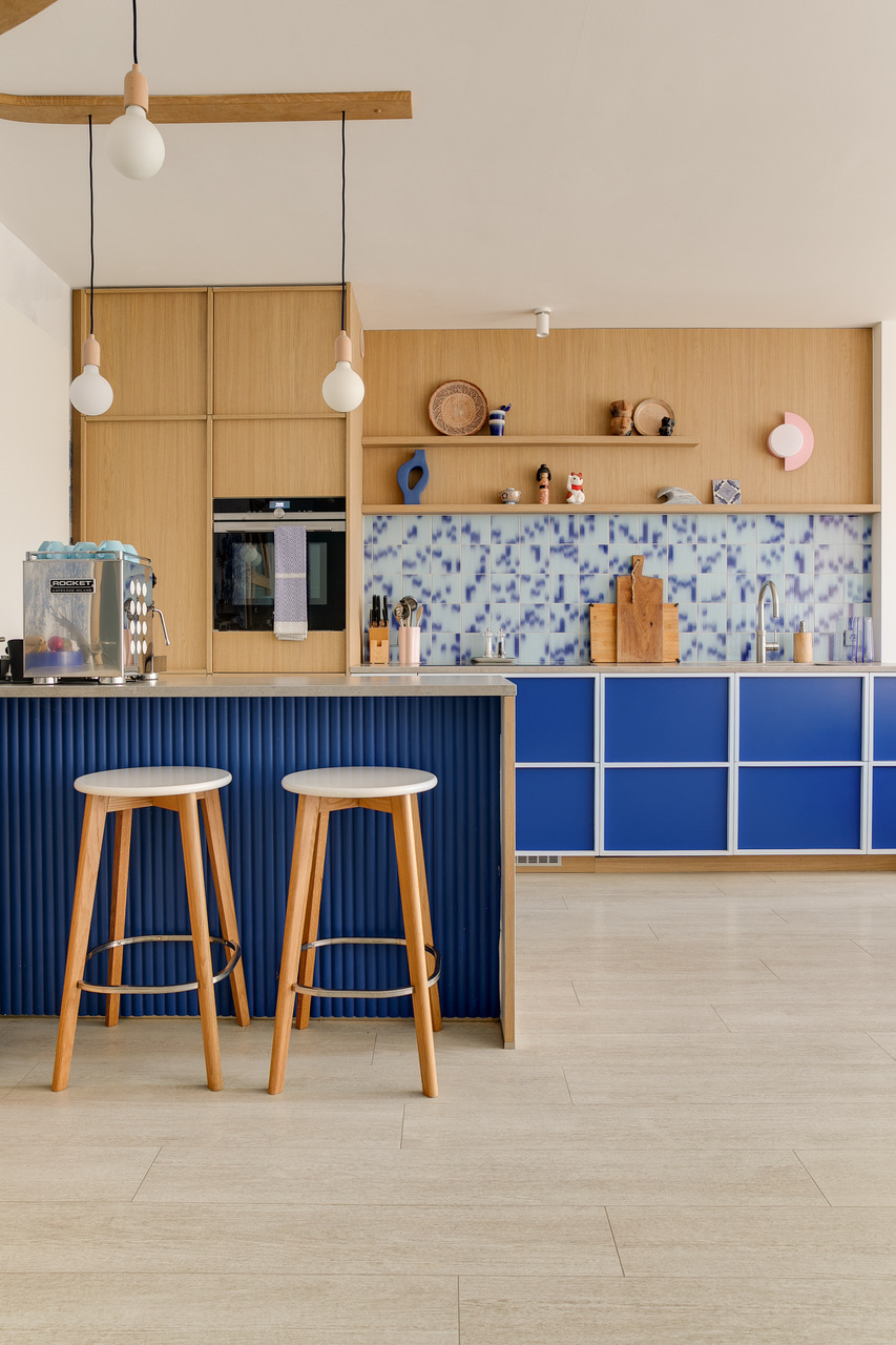 De ruime woonkamer van 45m² ligt op het westen en profiteert van veel daglicht. Kobaltblauw domineert via de modulaire bank, designstoelen en wandelementen, terwijl zachte roze accenten in kussens en decoratie voor warmte zorgen. Het open keukenblok vormt de echte eye-catcher met zijn blauwe bovenkastjes, opvallende roze booglamp en grafische wandsculptuur. De visgraatvloer in licht eikenhout verbindt alle ruimtes met elkaar.