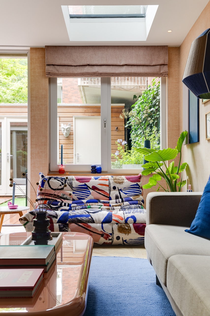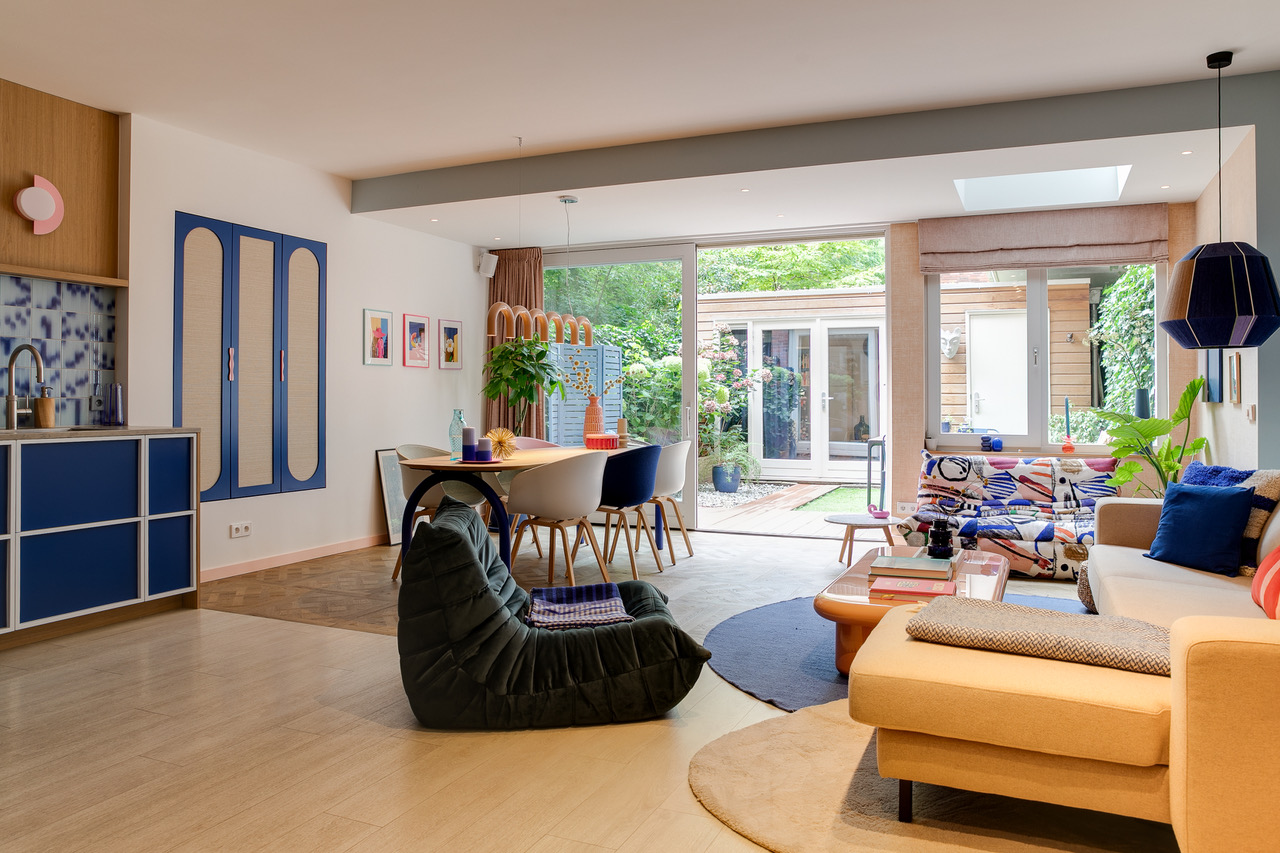 Deze kleurrijke shootlocatie Amsterdam met tiny house combineert speelse kleuren met moderne vormgeving en biedt een extra fotogeniek tiny house van 13m² in de tuin. De mix van kobaltblauw, roze tinten en eikenhout zorgt voor een frisse setting die perfect werkt voor fotoshoots en filmproducties.