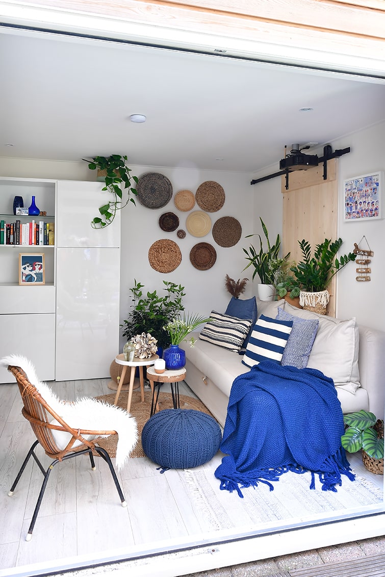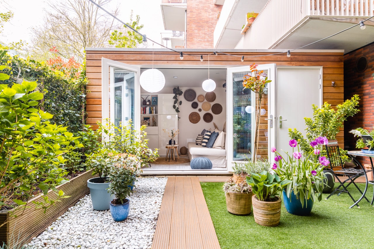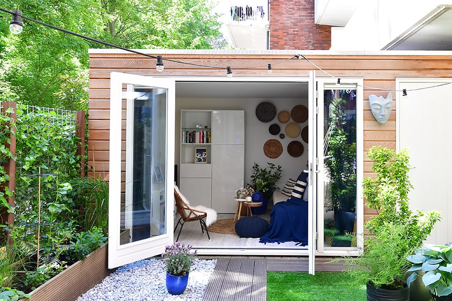 De tuin van 30m² ligt op het westen en biedt een groene, rustige setting. Het vrijstaande tiny house van 13m² heeft een moderne houten gevel en grote openslaande deuren die volledig open kunnen. Binnen vind je een lichte ruimte met witte wanden, houten details en verschillende zithoeken. Gevlochten mandwerk aan de wand en een blauwe fauteuil zorgen voor sfeer. Het tiny house werkt uitstekend als aparte studio, visagie ruimte of als contrast met het kleurrijke appartement.
