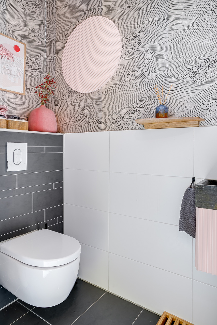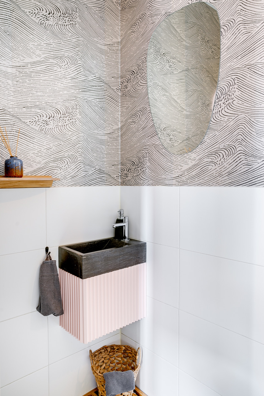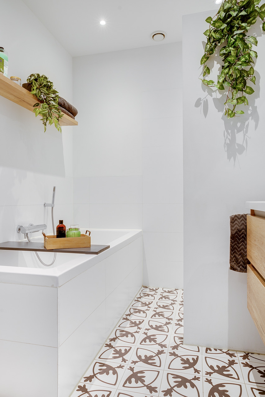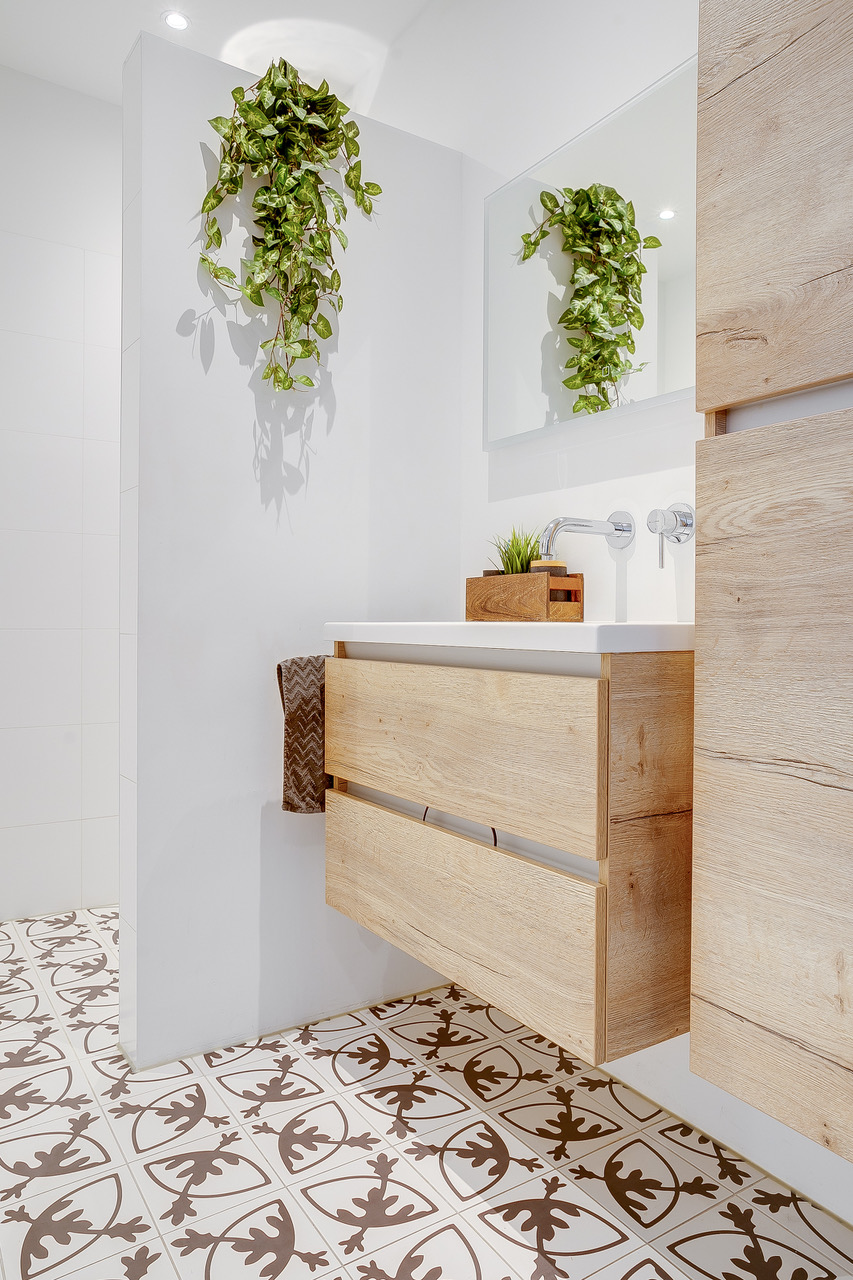 De moderne badkamer combineert wit en hout met speelse details. Het zwevende eiken badmeubel contrasteert mooi met de witte wanden, terwijl decoratieve vloertegels met bloemmotief en hangende planten extra karakter geven.